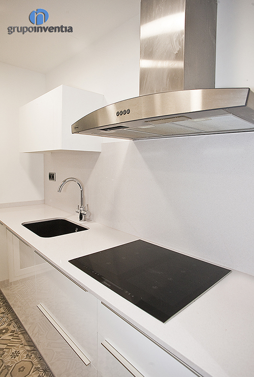La reforma de cocina es abierta al salón y se distribuyó a dos frentes, aunque cuenta con un espacio equipado con una barra tipo cocina americana a modo de comedor. En la parte de la derecha se colocó la encimera, la cual se equipó con una placa vitrocerámica y un fregadero de un solo seno. Además, cuenta con cajones y armarios para el almacenaje tanto en la parte inferior como en la superior de la encimera.