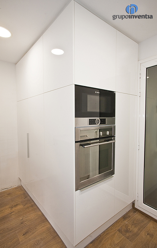 En el lado izquierdo se dispuso un mueble de cocina en el que además de contener espacios para el almacenaje se encastraron los electrodomésticos. Estos están compuestos por un horno, un microondas y una nevera que queda camuflada por las mismas puertas del armario.