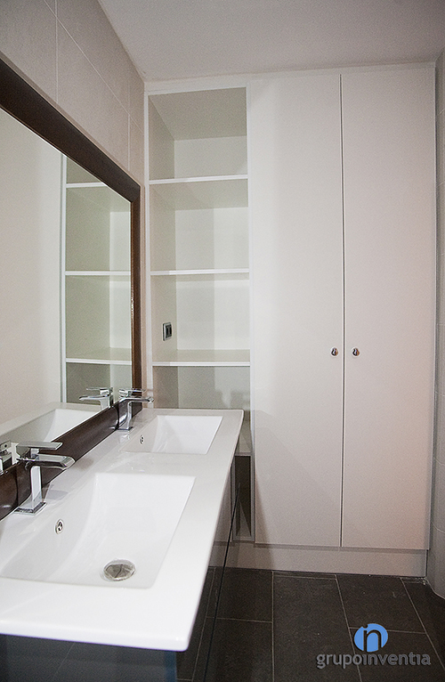 En cuanto al equipamiento sanitario esta reforma de baño se equipó con un lavabo doble con cajonera incorporada, un inodoro suspendido y la mencionada ducha.