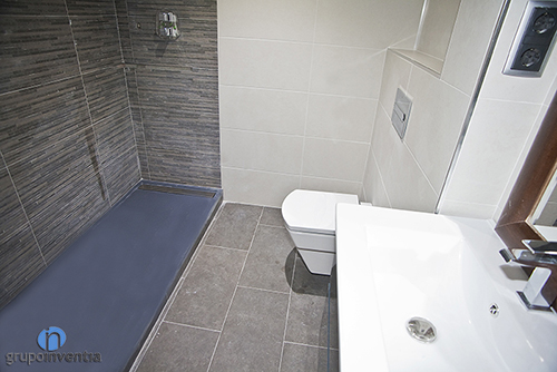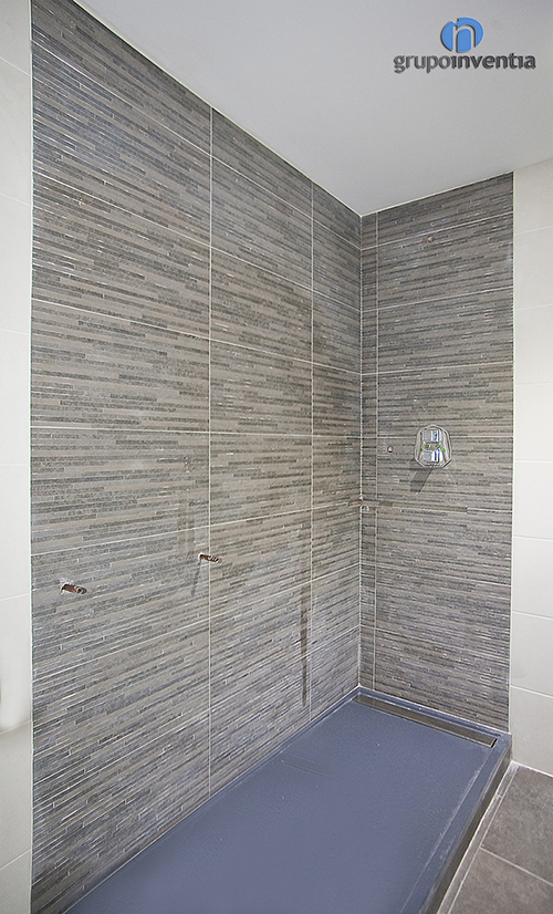 La reforma de baño se alicató por completo. Para ello se utilizaron azulejos blancos y azulejos en tonos grises en la pared de la ducha. Esta combinación de colores genera mayor sensación de amplitud y profundidad en la estancia.