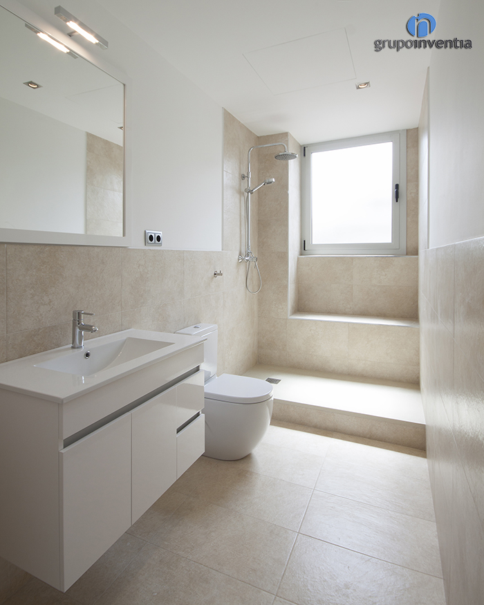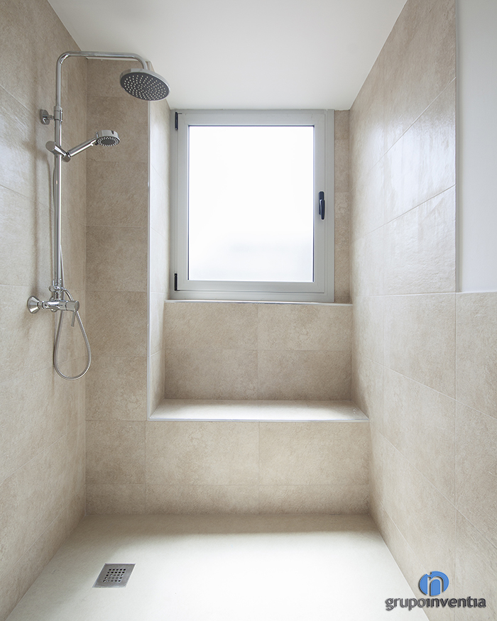 Por su parte, la reforma de baño de cortesía también se equipó por completo pero para su diseño se utilizó un alicatado en tono beige. Este cuarto de baño cuenta con un inodoro, un lavabo y una amplia ducha de obra.