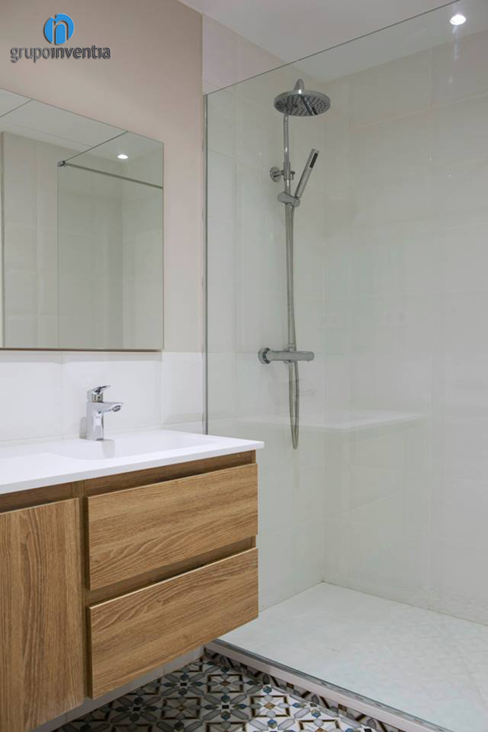 En cuanto a la reforma de baño, esta se alicató por completo, contando con un lavabo con cajonera incorporada, un inodoro y una ducha protegida por una mampara.