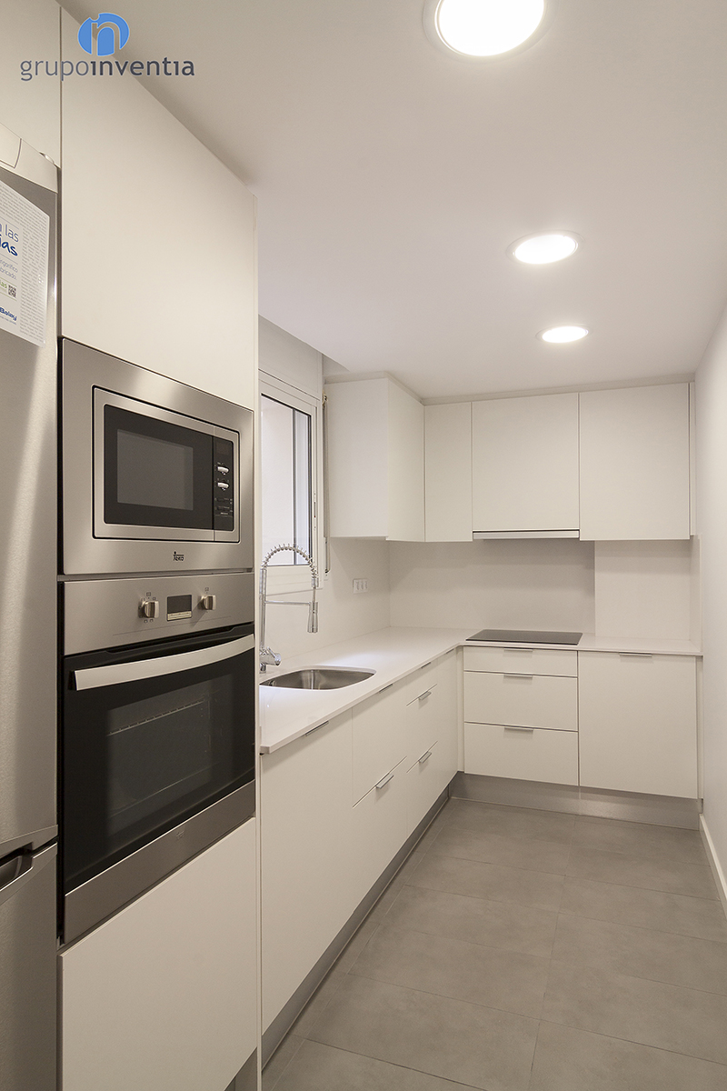 En este caso la reforma de cocina se distribuyó a través de una encimera en forma de L en la parte izquierda de la estancia. Justo en la entrada se colocó un armario de cocina en el que se encastraron los electrodomésticos, concretamente una nevera, un microondas y un horno. Seguidamente nace la encimera, en la que en su primera parte, la más alargada, se instaló un fregadero individual equipado con un grifo ergonómico. La encimera se tuerce hacia la derecha y fue allí donde se colocó una placa vitrocerámica.
