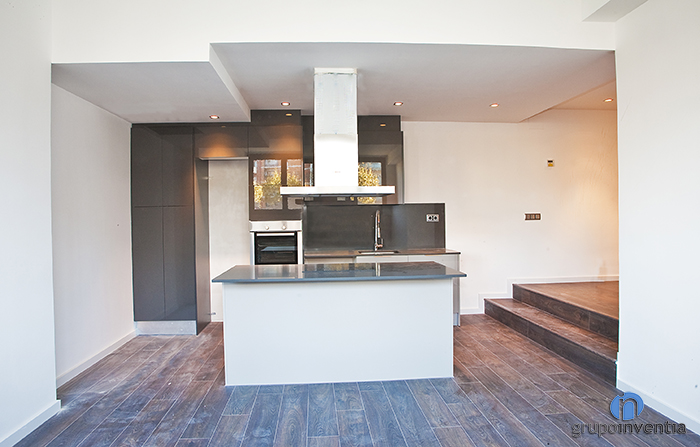 La reforma de cocina es abierta y cuenta con una isla de cocina en la que se instaló una placa vitrocerámica. A su vez, sirve de delimitadora entre el espacio de la cocina con el del amplio salón.
