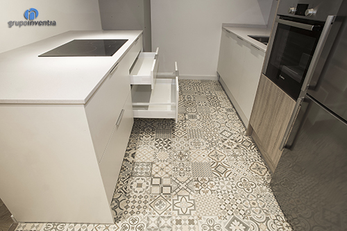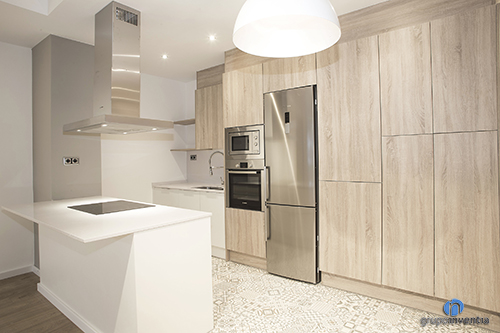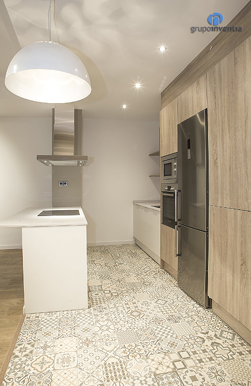 La reforma de cocina es abierta al salón se distribuyó a dos frentes, consiguiendo un espacio perfecto y aprovechando el máximo espacio disponible. En ella destaca la combinación entre los acabados en madera del mueble de cocina con el pavimento hidráulico instalado.