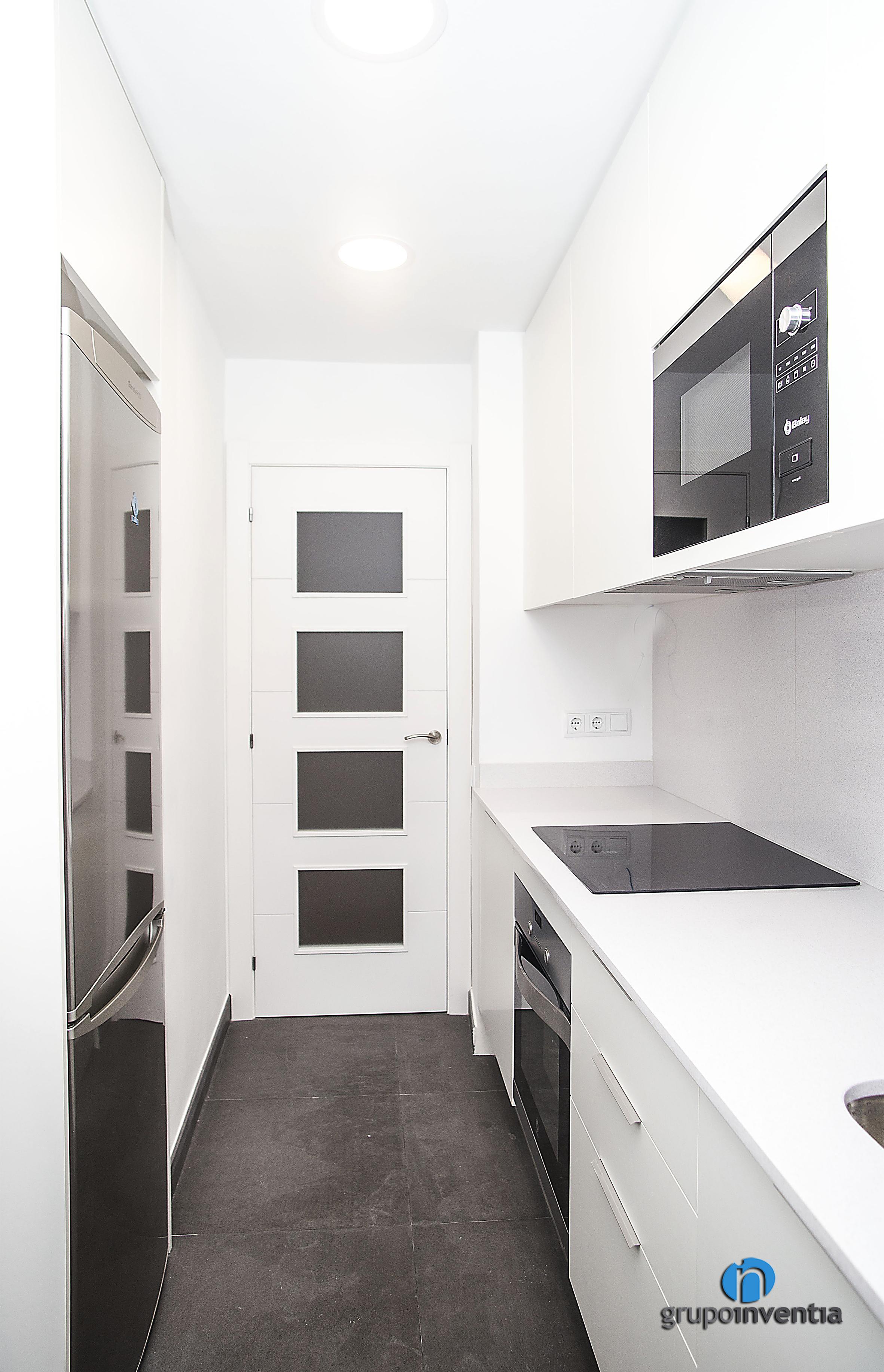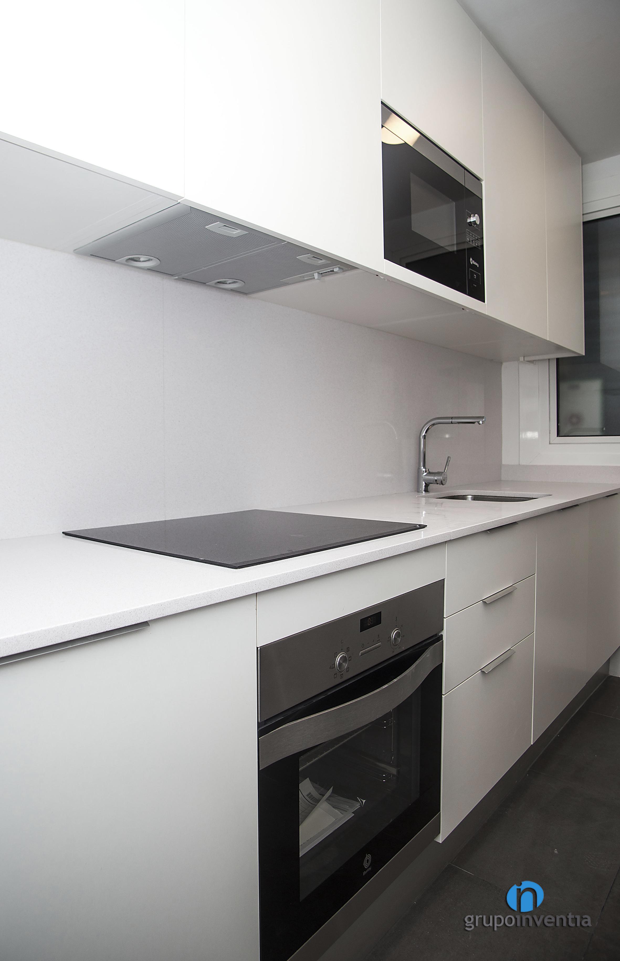 En este caso la cocina ocupa una estancia propia e independiente y para su nueva imagen se utilizó una distribución de cocina a dos frentes. En la parte derecha se encastró la nevera y seguidamente se colocó una amplia barra de cocina, convirtiéndola en el espacio perfecto para colocar pequeños electrodomésticos y poder realizar las ingestas diarias con mayor comodidad.