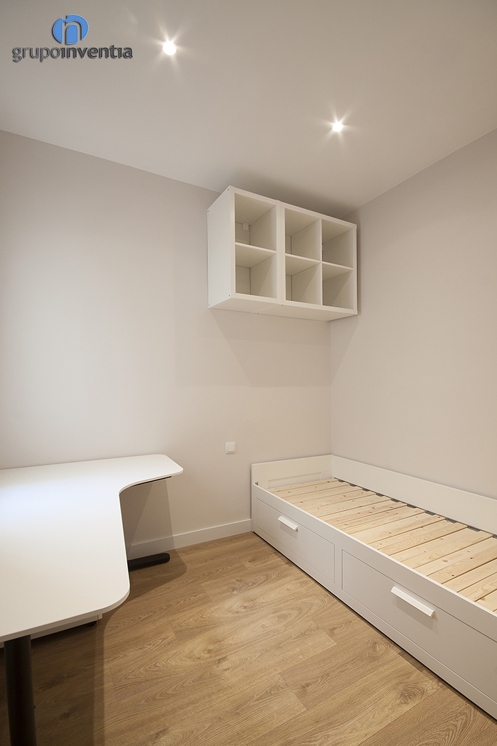 En líneas generales, utilizamos colores neutros con el objetivo de potenciar la luminosidad del inmueble y generar mayor sensación de amplitud. En cuanto al pavimento, para las zonas compartidas como el salón o los dormitorios, y la cocina, instalamos un pavimento de parquet laminado de un tono de madera muy natural. Por su parte, en el cuarto de baño instalamos pavimento hidráulico y parquet.