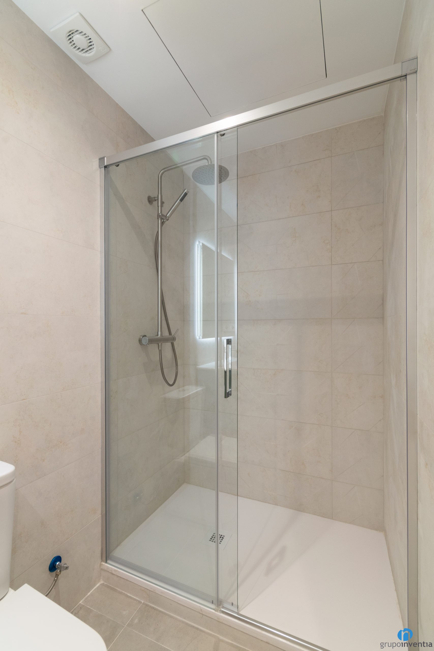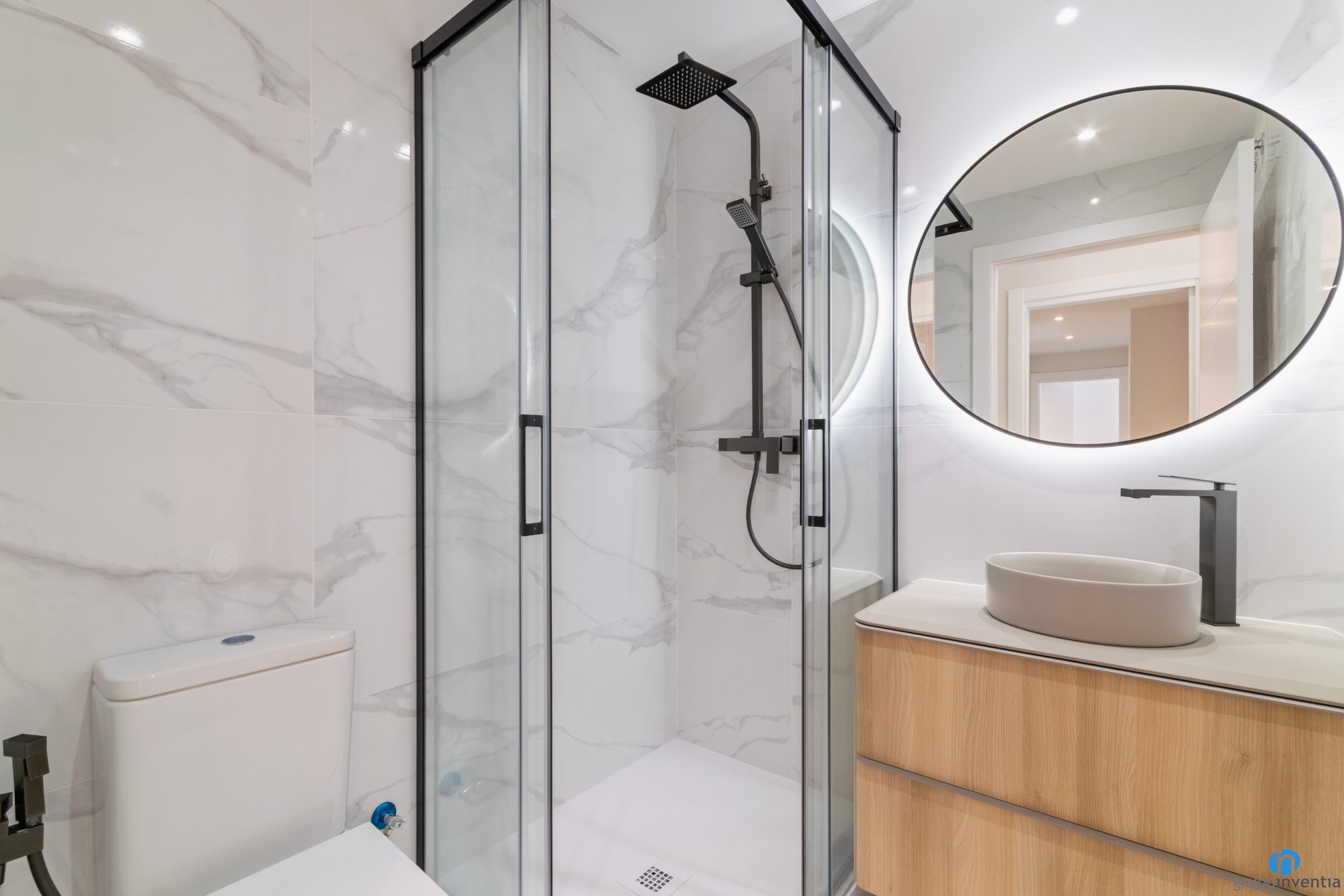 Los cuartos de baño de esta planta baja han sido diseñados para ser cómodos y relajantes. Se han utilizado revestimientos cerámicos en tonos neutros, combinados con elementos en madera y espejo. Así hemos logrado un equilibrio entre funcionalidad y estilo. Cada baño dispone de un mueble de lavabo con almacenaje, sanitario suspendido y un amplio plato de ducha con mampara de puerta corredera.