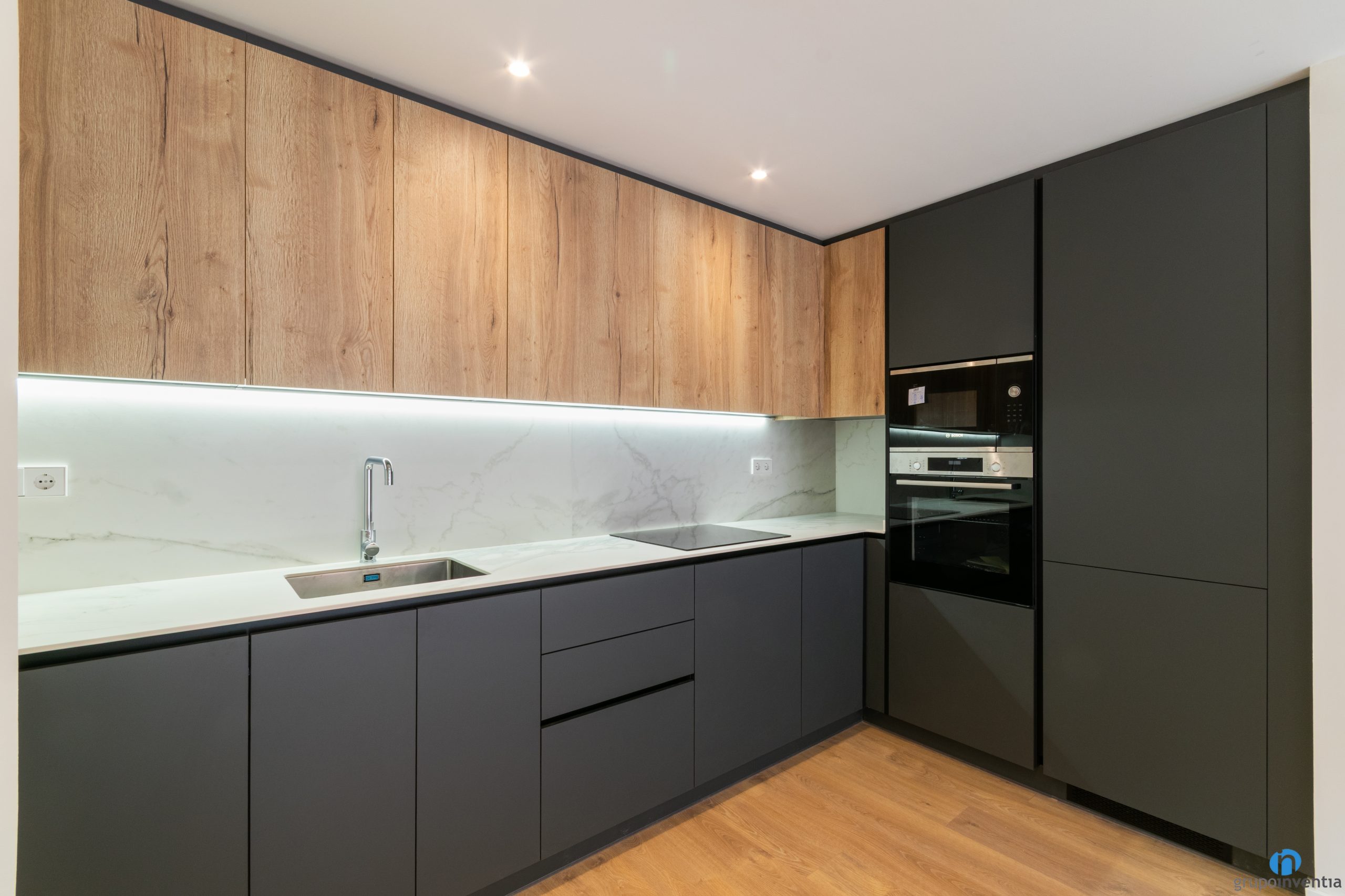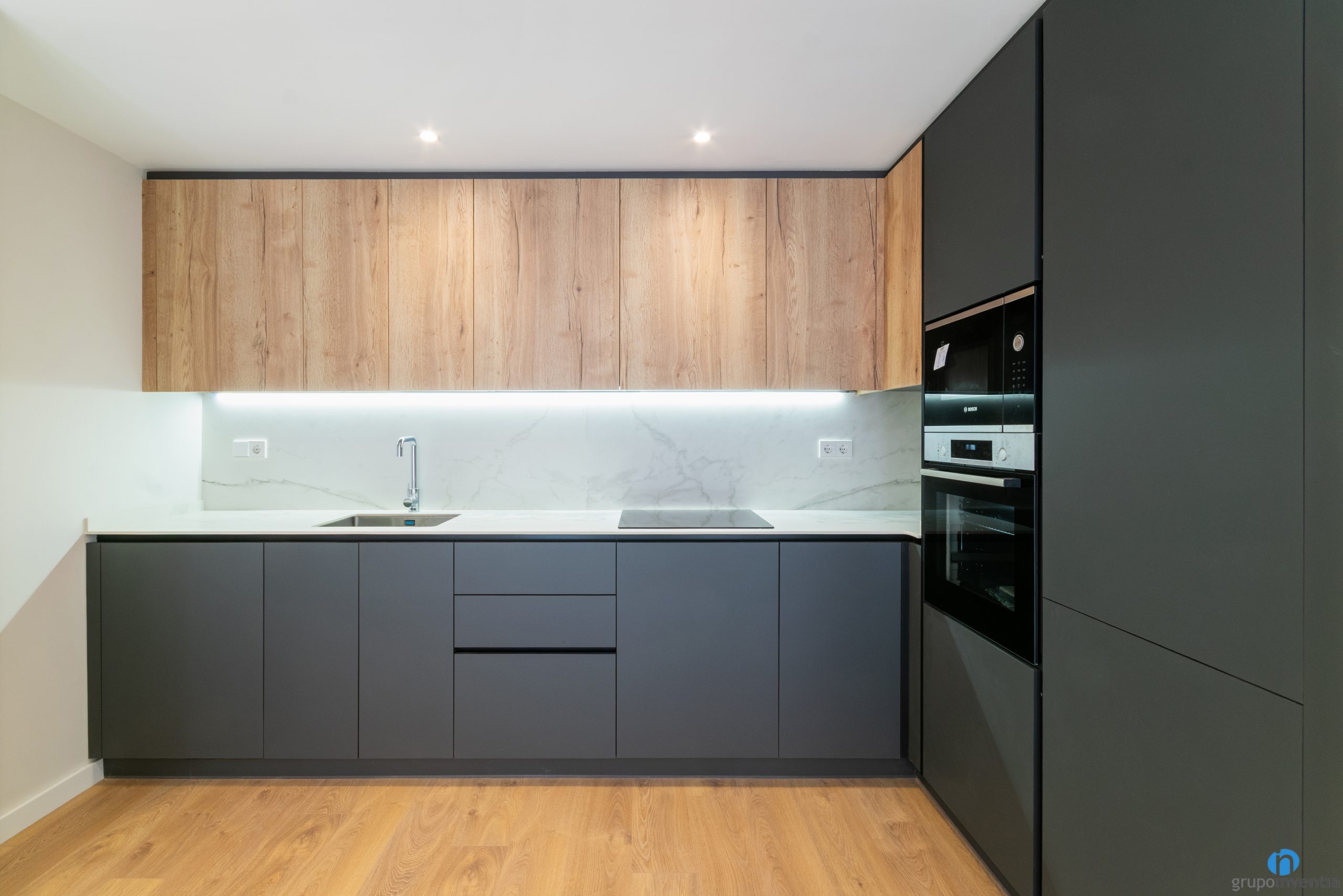 Los acabados siguen la línea del resto de la vivienda. Mobiliario negro, encimeras de superficie lisa y detalles en madera que refuerzan la calidez del conjunto. Además, la cocina está equipada con electrodomésticos de última generación integrados, lo que garantiza tanto funcionalidad como diseño. La conexión visual con el salón-comedor refuerza la sensación de espacio abierto y cohesionado.