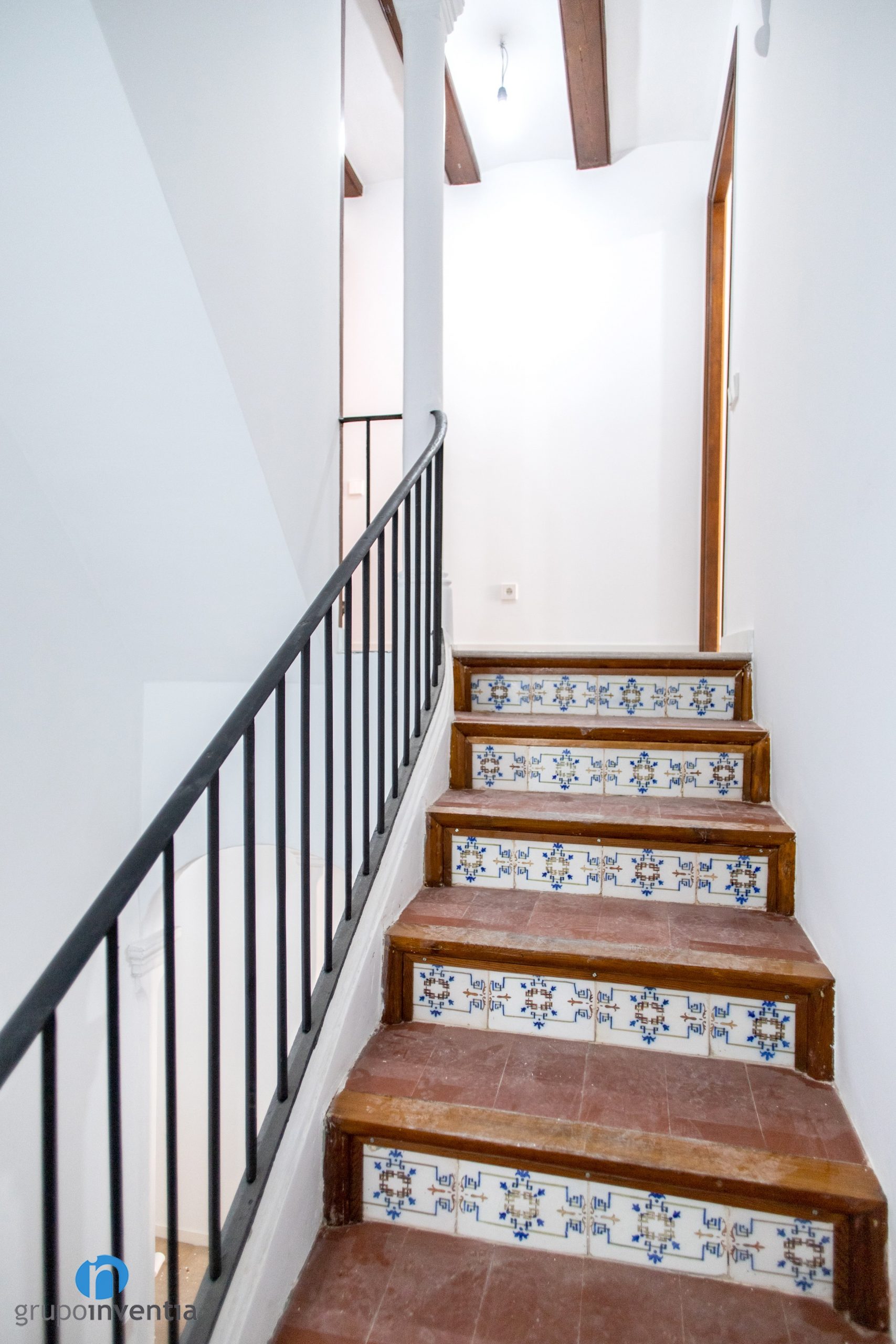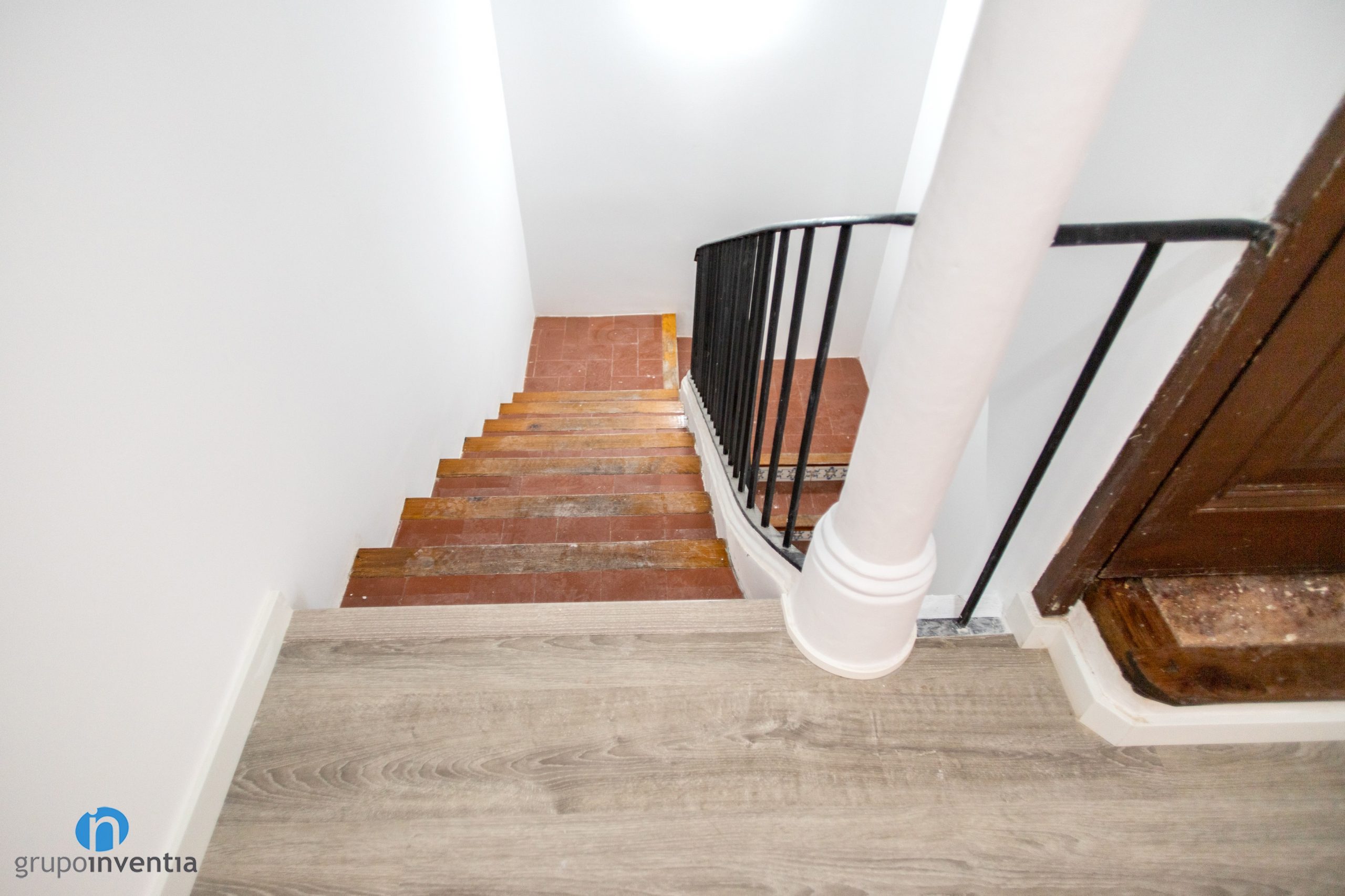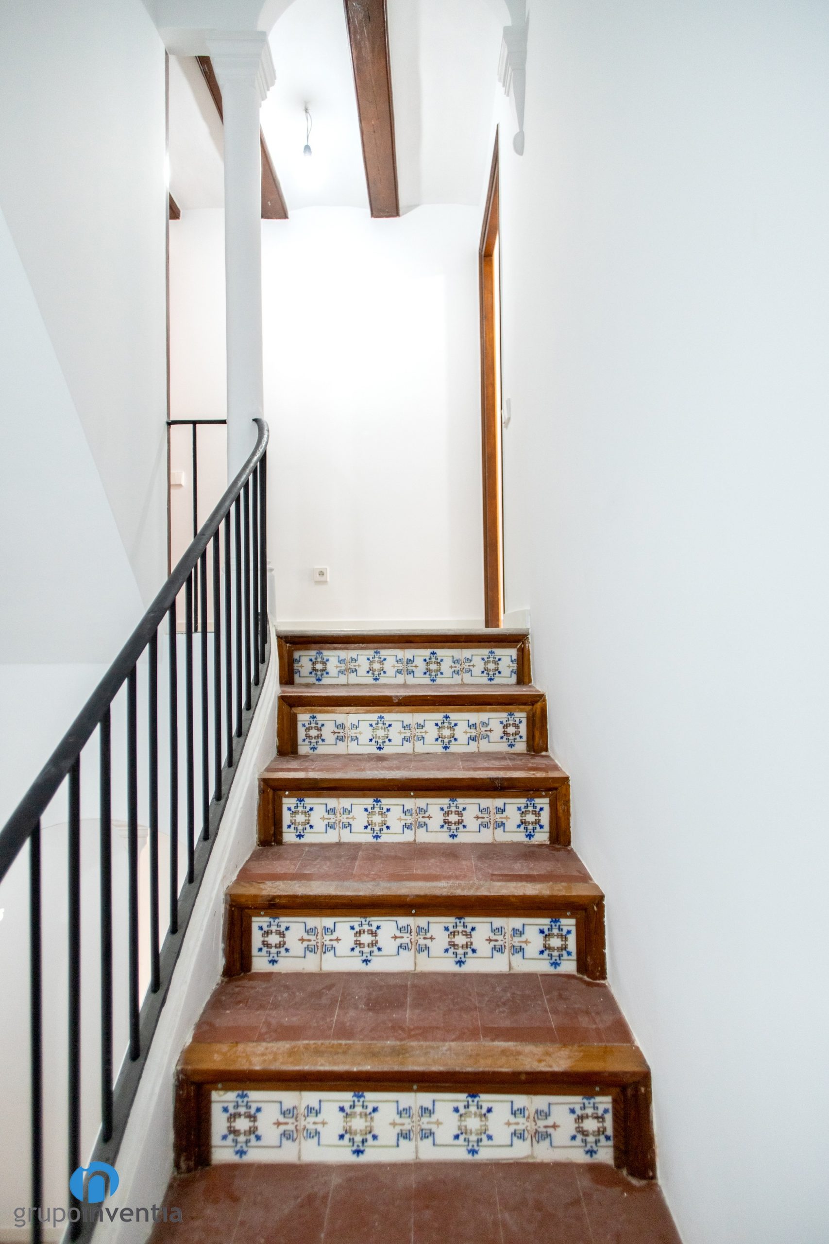 En las escaleras la madera cubre los cantos de cada peldaño. En el contrapié se han mantenido los azulejos y en los peldaños el terrazo original. Además de llevar a cabo renovaciones de vivienda, también contamos con expertos restauradores. Varios elementos de este proyecto de interiorismo (escaleras, vigas, columnas) son una buena prueba de ello.