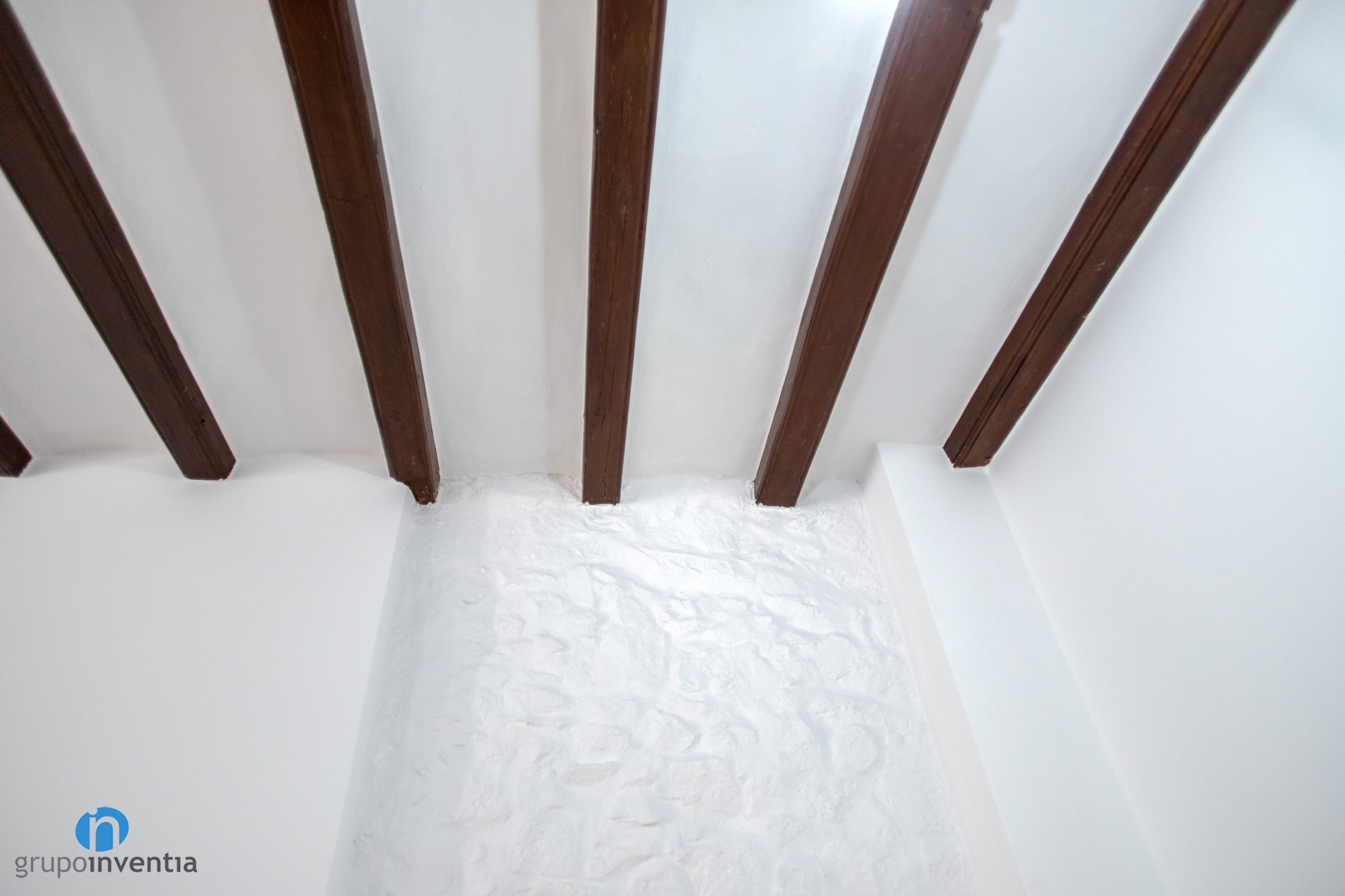 Este inmaculado color blanco de las paredes se ha combinado con la personalidad cálida que transmite la madera. Tanto las puertas y ventanas como sus marcos se presentan en tonos fuertes de madera, ofreciendo una imagen muy natural. Este es el esquema seguido con las vigas a la vista y en los peldaños de las escaleras interiores.