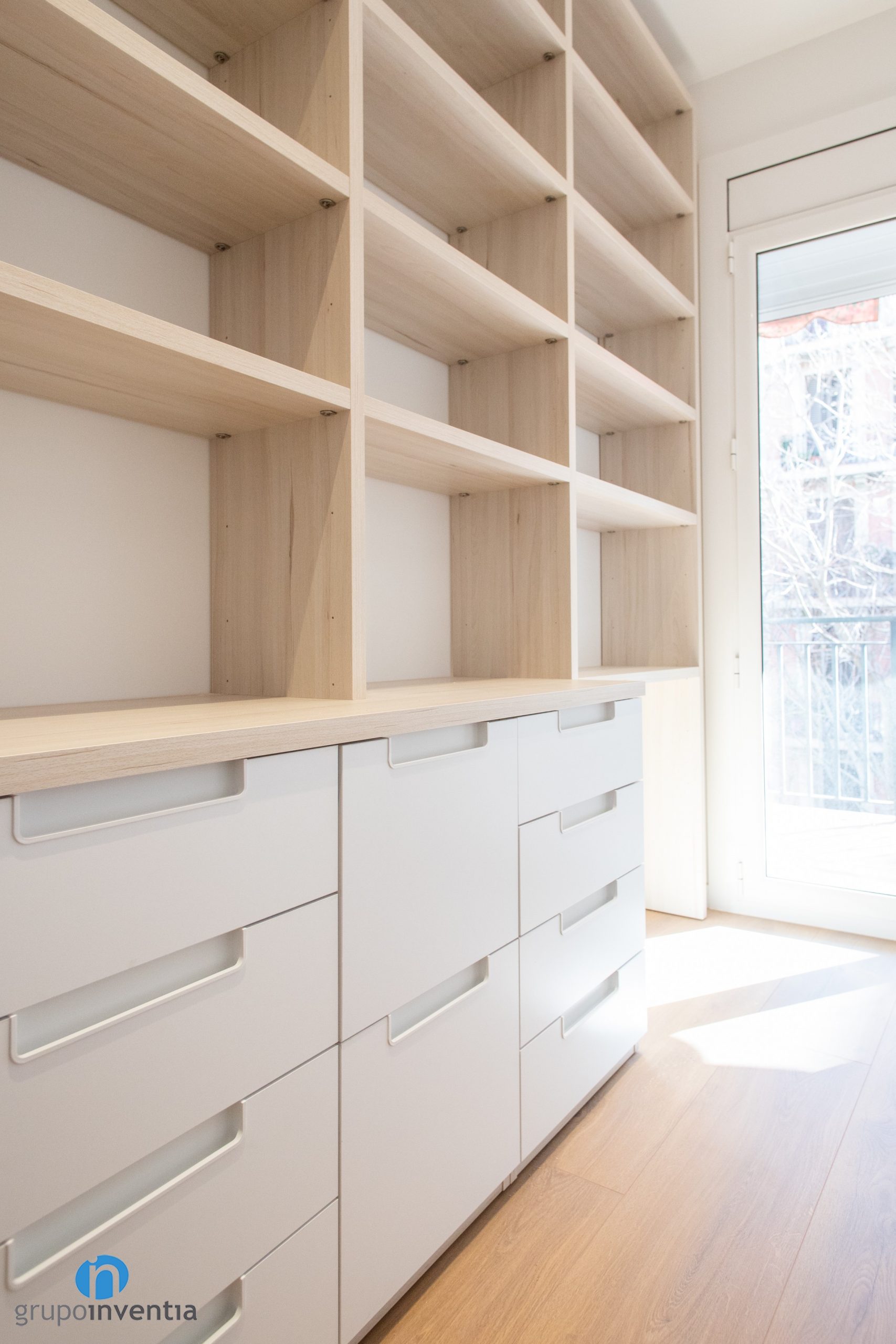 El equipo de interiorismo en Barcelona de Grupo Inventia ha encontrado el mobiliario que los propietarios necesitaba. Se ha optado por muebles que combinan acabados en madera y en color blanco. Ahora la vivienda presenta una imagen muy homogénea y dispone de un mobiliario muy funcional con amplia capacidad de almacenaje.