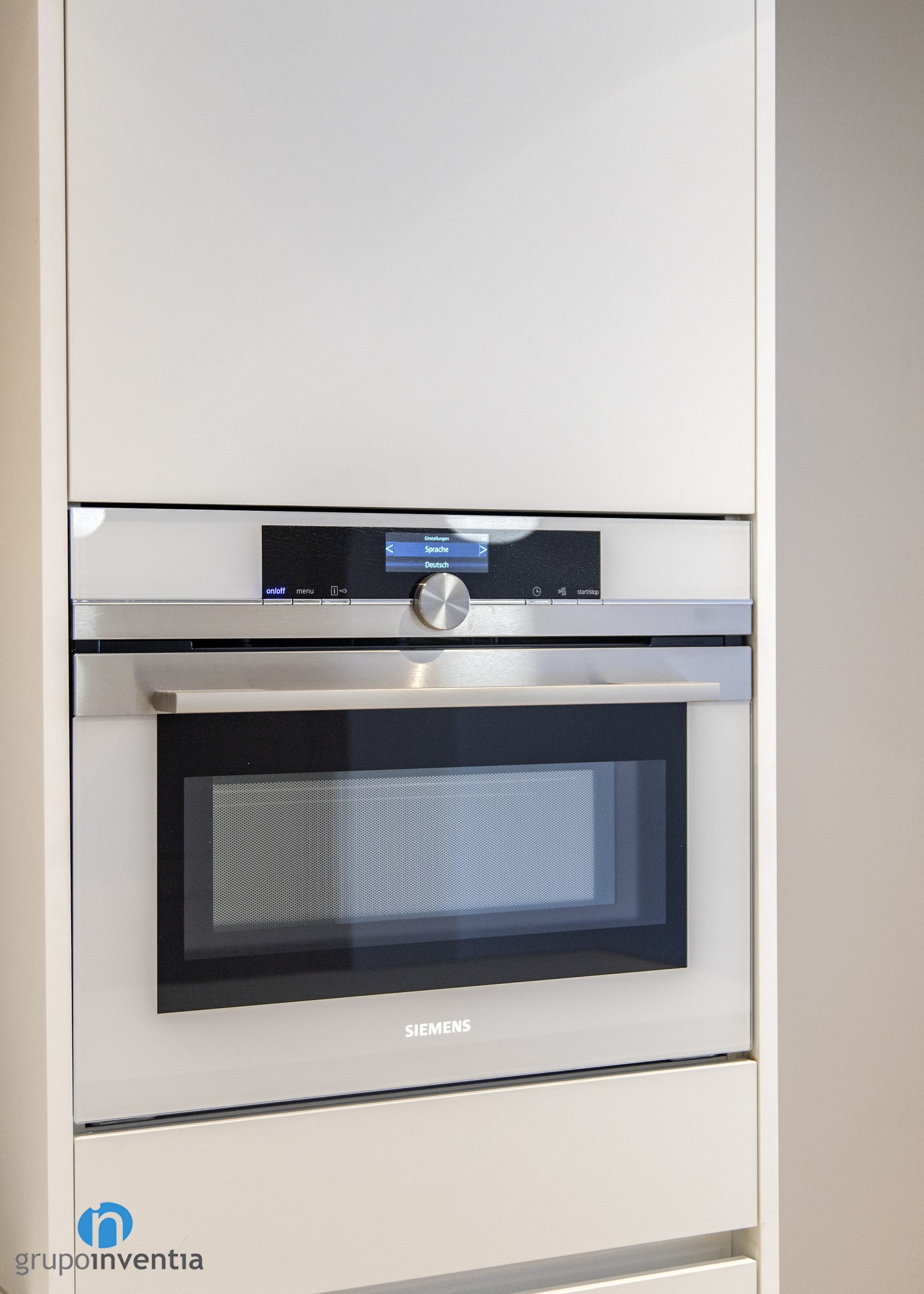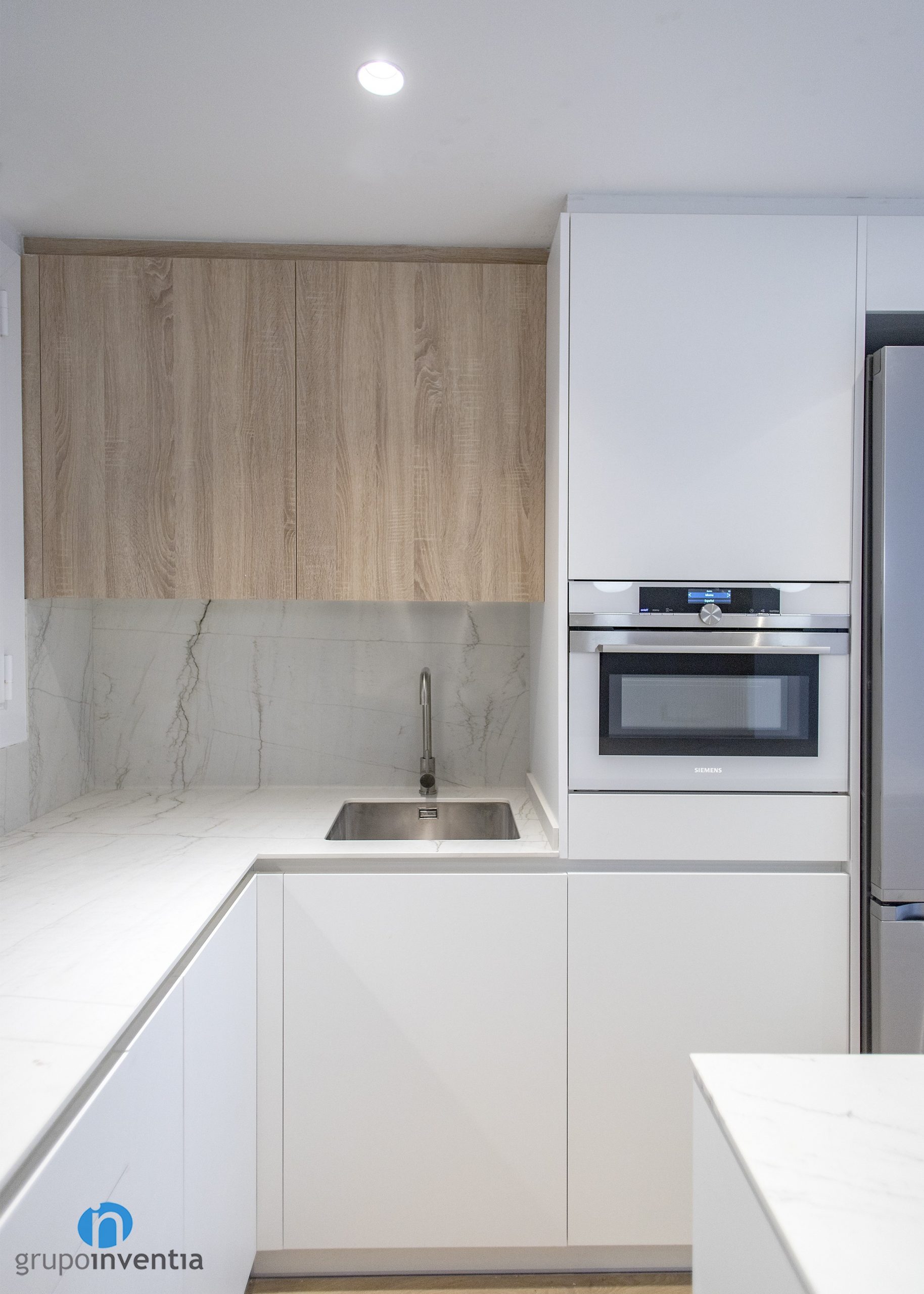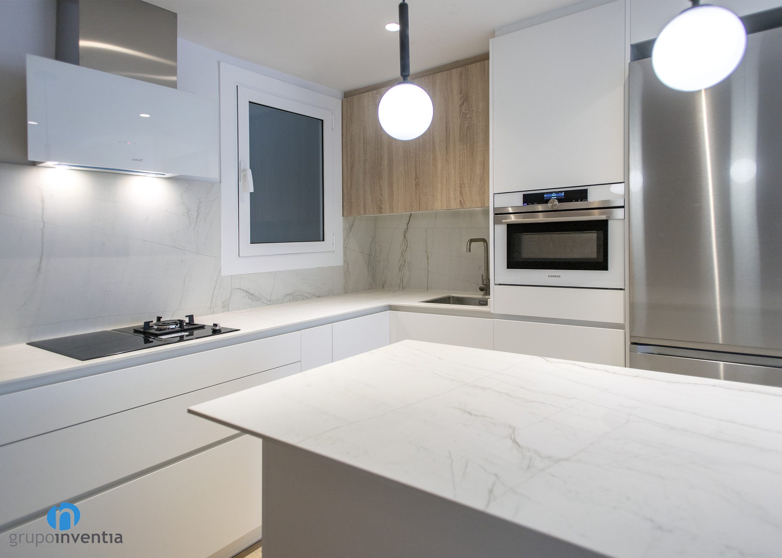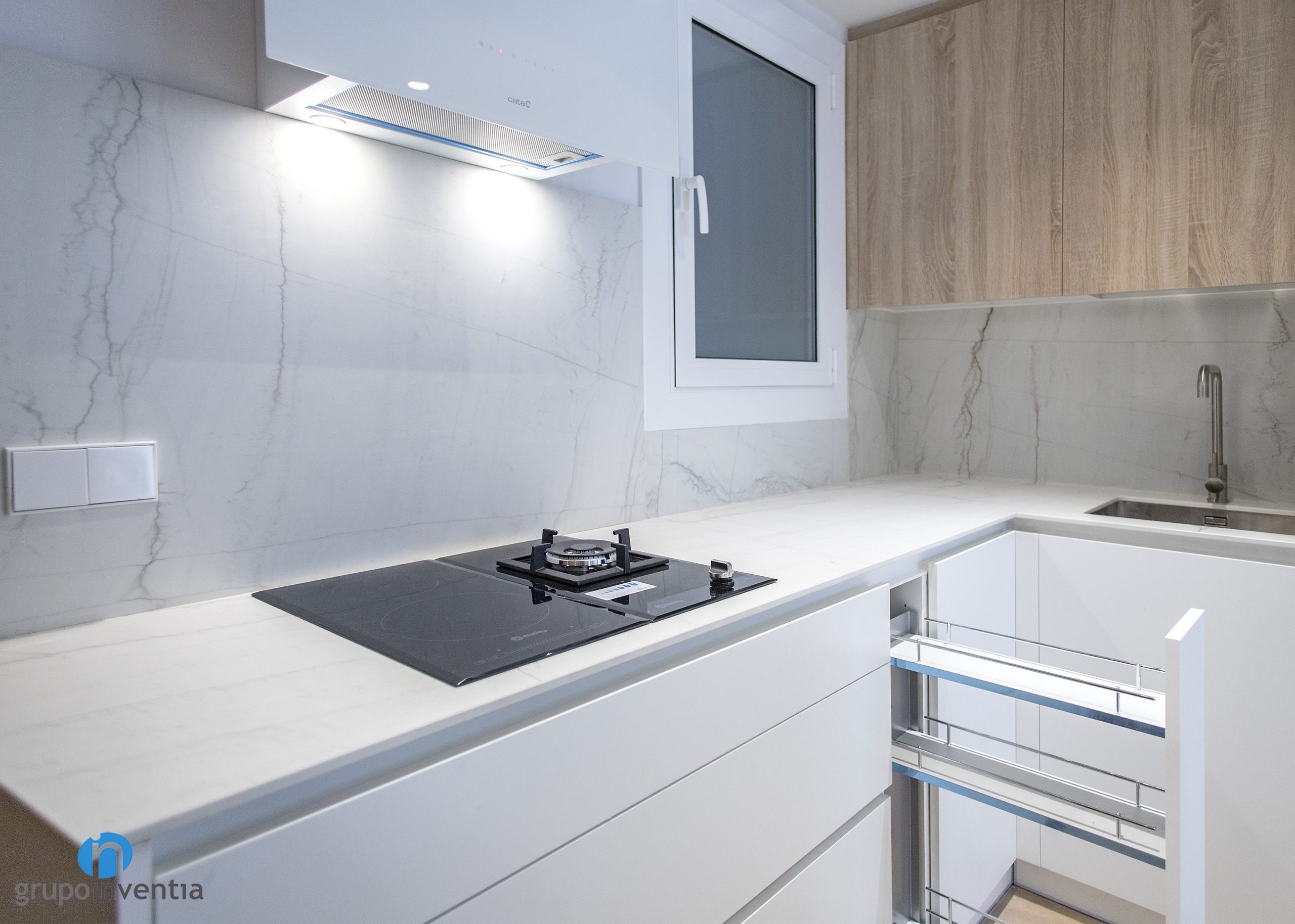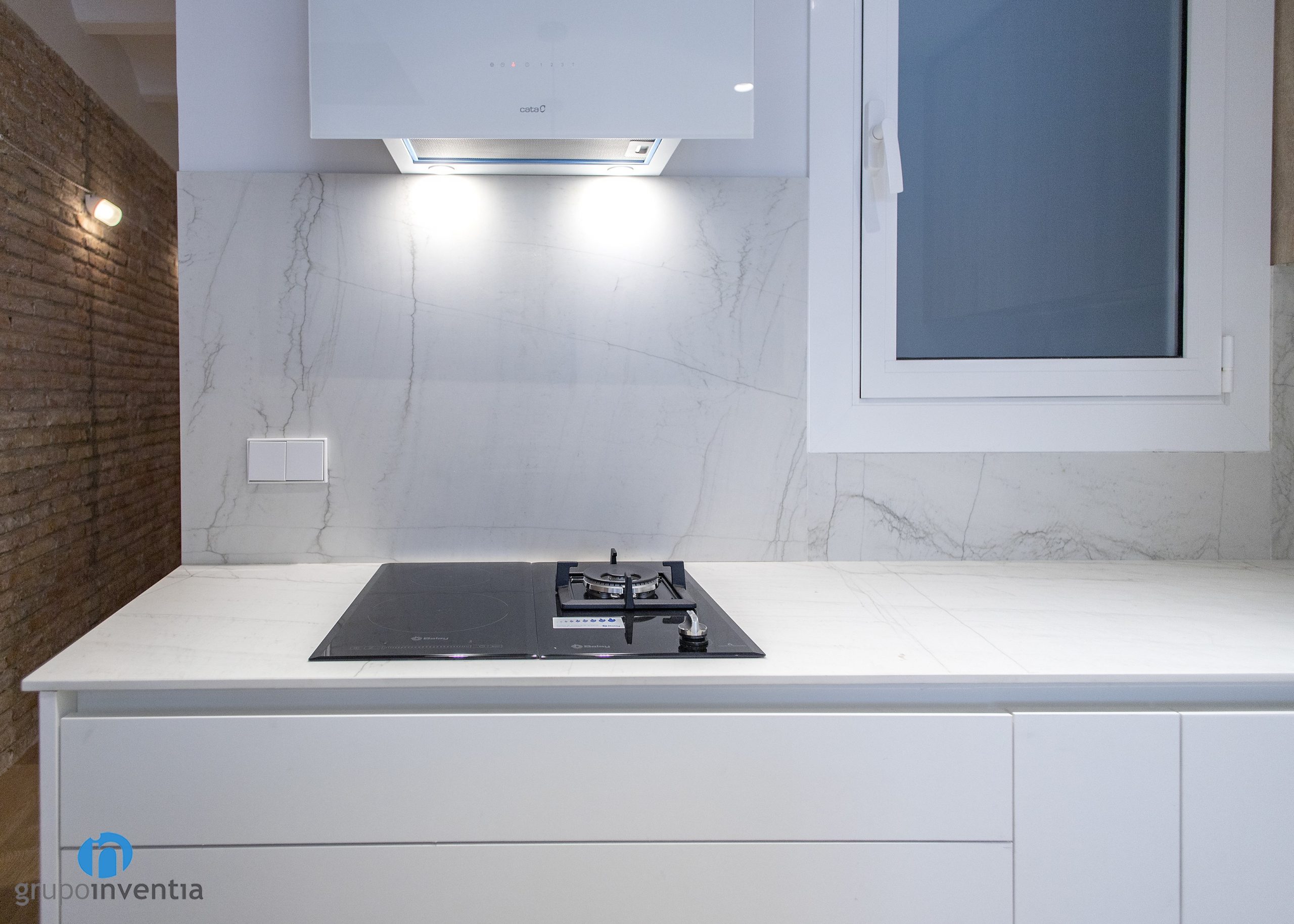 La encimera tuerce hacia la izquierda y da paso a un nuevo tramo. En este caso amplía la superficie de trabajo y está equipada con una placa vitrocerámica y un fogón. En esta reforma de cocina el color blanco es el protagonista, ya que se ha utilizado en la mayor parte del mueble de cocina. Destaca el alicatado del salpicadero con azulejos de acabado en mármol.