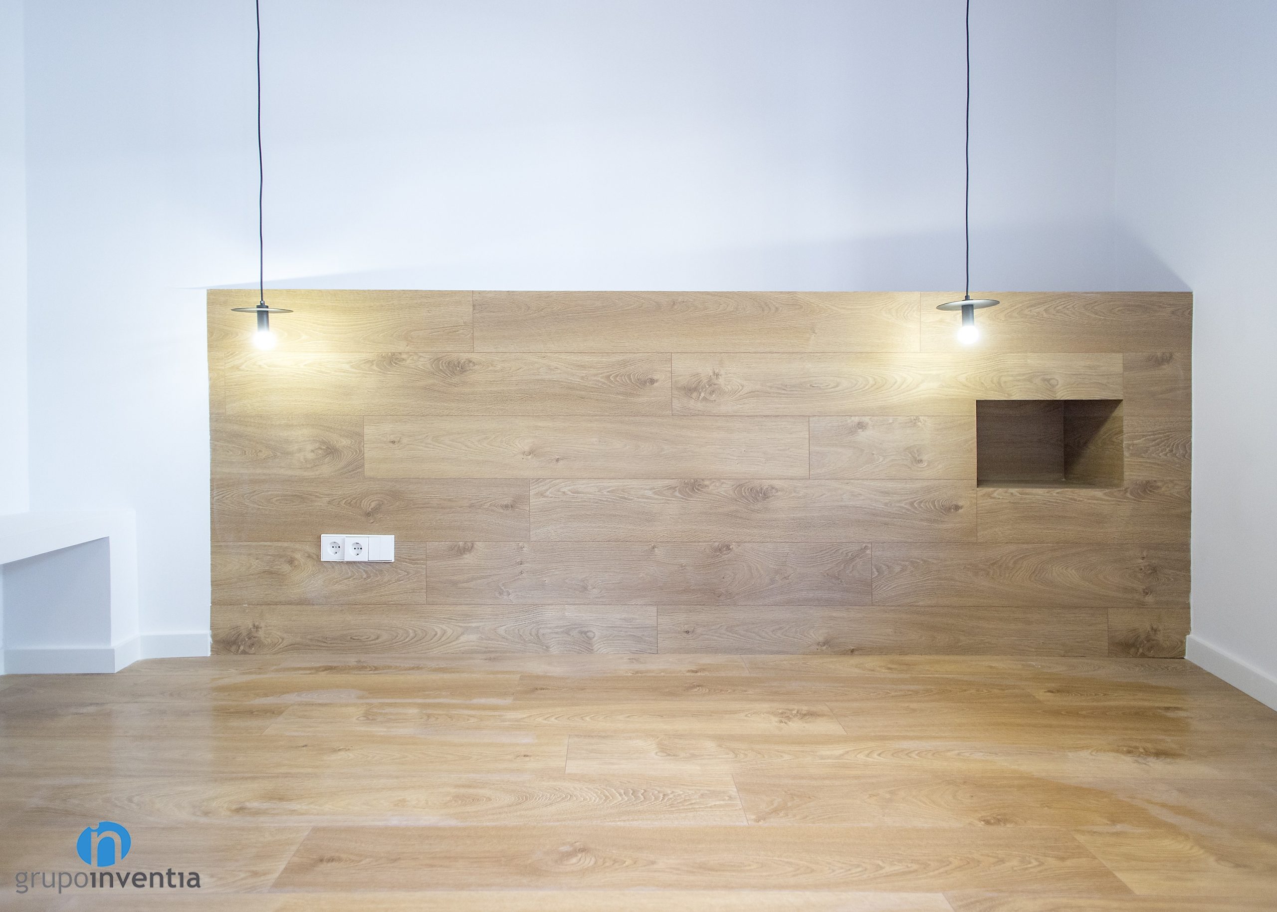Para el nuevo pavimento se ha escogido de forma acertada un suelo de parquet en tonos medios de madera. Éste es perfecto para potenciar las características mencionadas, además de aportar mayor calidez a cada estancia. Los acabados en madera también se utilizan en el dormitorio principal. En el se ha colocado un cabecero de cama a medida que parece emerger del mismo parquet.