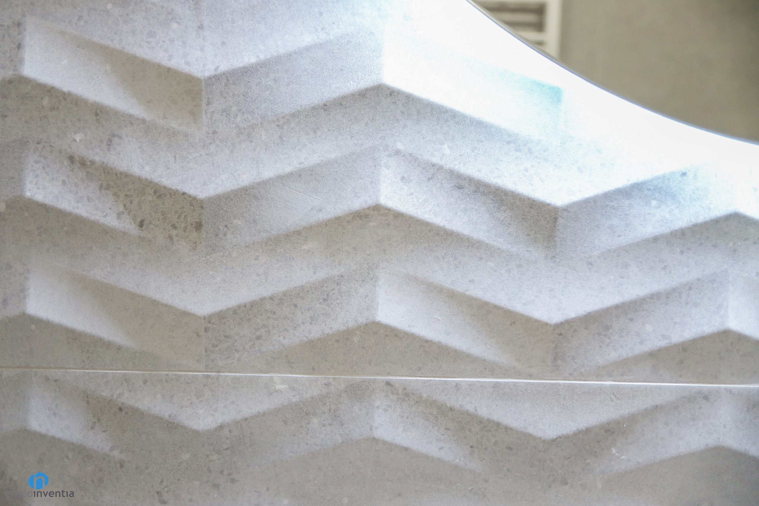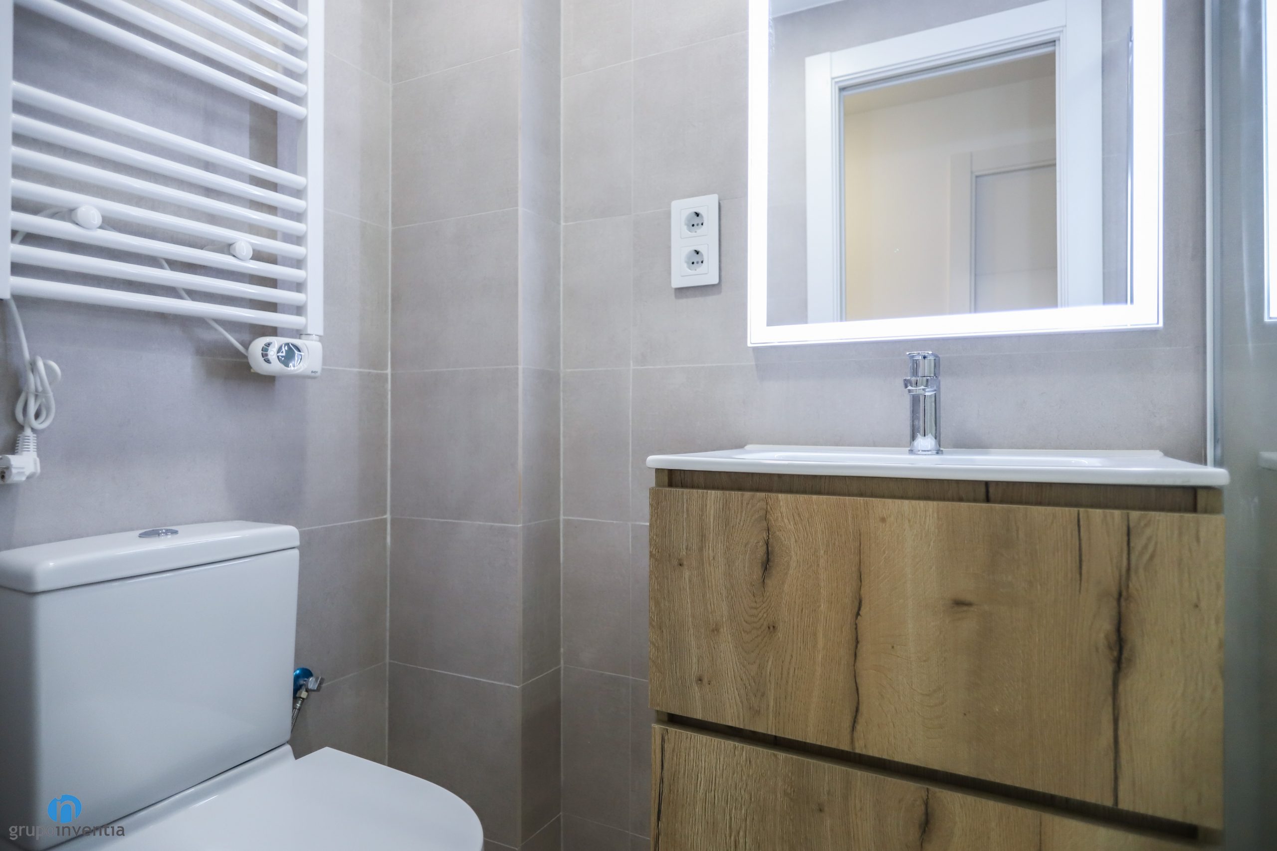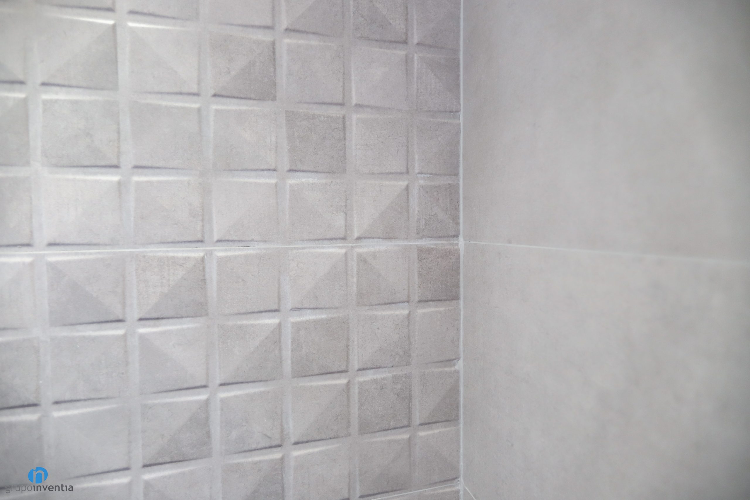 También se ha llevado a cabo una notable mejora en la imagen de los dos cuartos de baño. Se ha seguido el estilo decorativo aplicado en los demás espacios. Se han utilizado tonalidades neutras para generar espacios luminosos, amplios y acogedores. Para ello las paredes se han alicatado por completo con azulejos de color gris. También se han utilizado azulejos con diferentes acabados en relieve en paredes concretas.