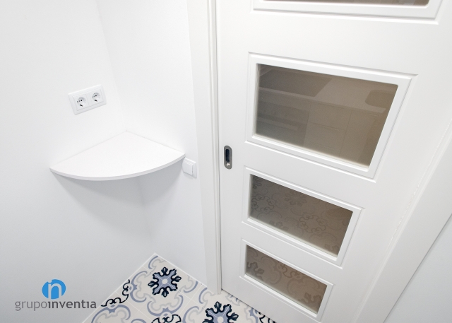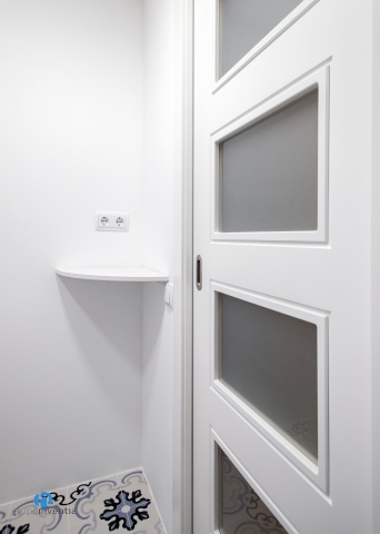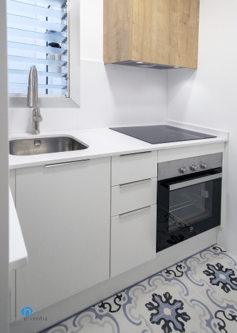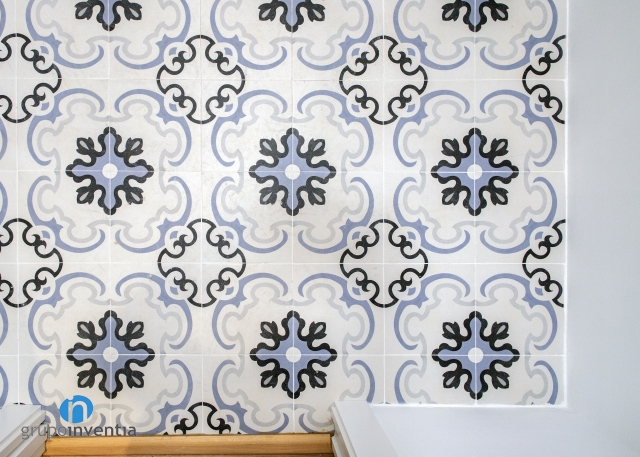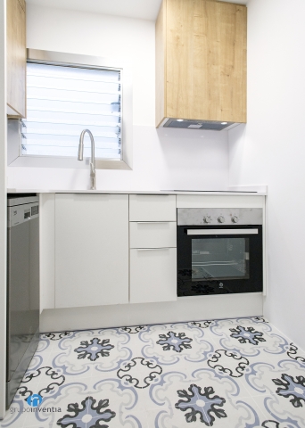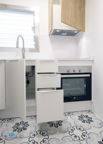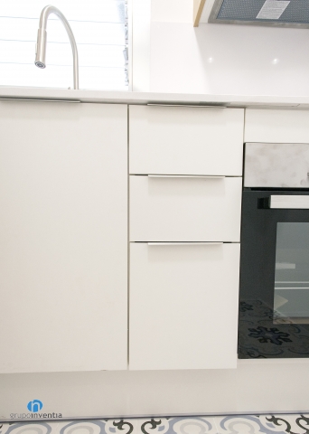 Esta tonalidad neutra permite la introducción de otros acabados, como los de madera presentes en los armarios anclados en la parte superior de la encimera de la izquierda. Otro detalle de nuevo diseño interior de la cocina es el pavimento. Para éste se optó por un suelo hidráulico, una opción perfecta tanto en imagen como en funcionalidad. Además de imprimir mucha personalidad en la estancia, se trata de una superficie de mantenimiento sencillo, un detalle a tener en cuenta en un espacio tan utilizado como lo es la cocina.