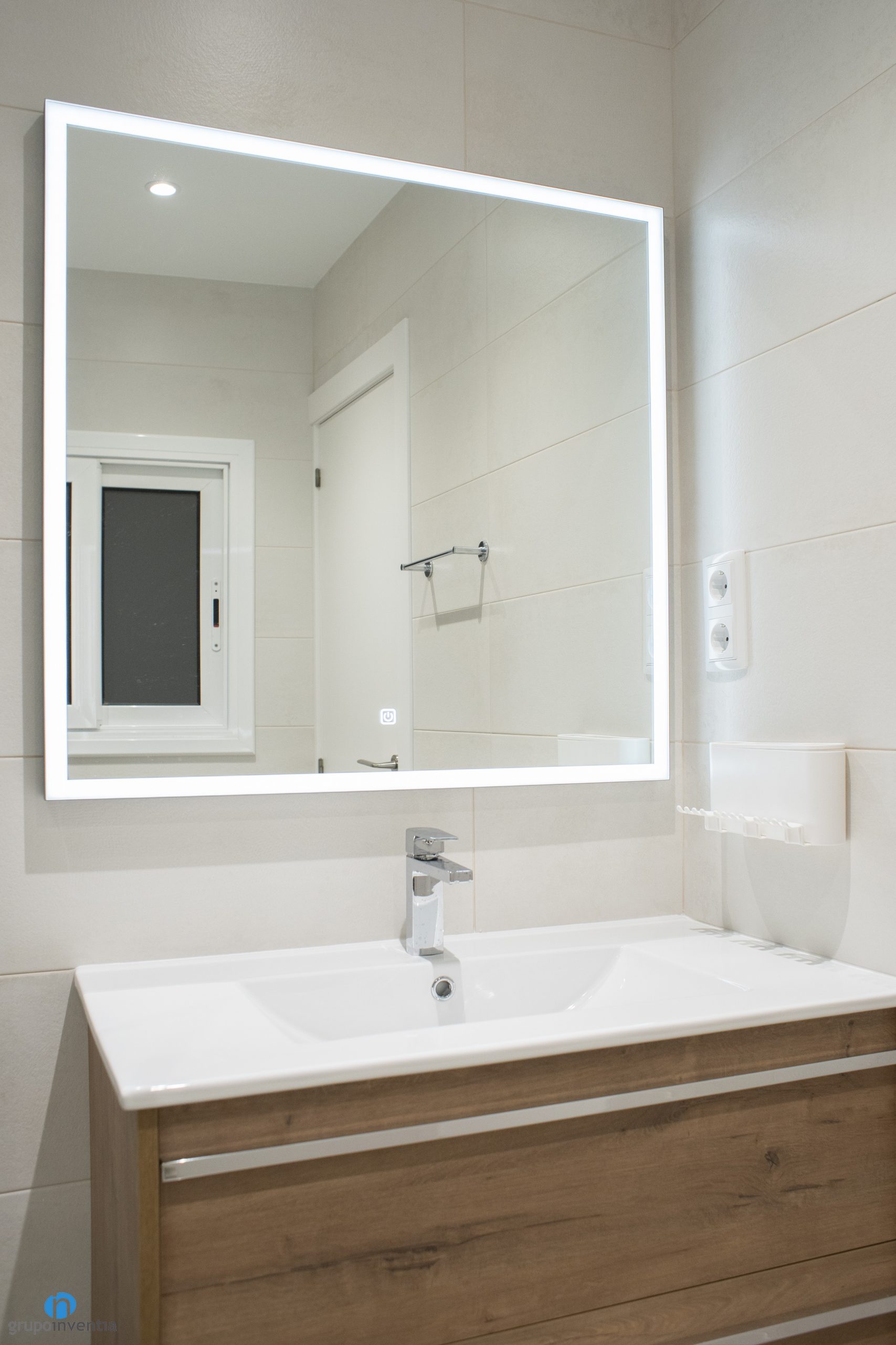Otros elementos destacables en esta reforma de baño en Barcelona son el nuevo espejo de baño de forma rectangular y con luces led. También un seca toallas eléctrico que se ha colocado cercano a la ducha.