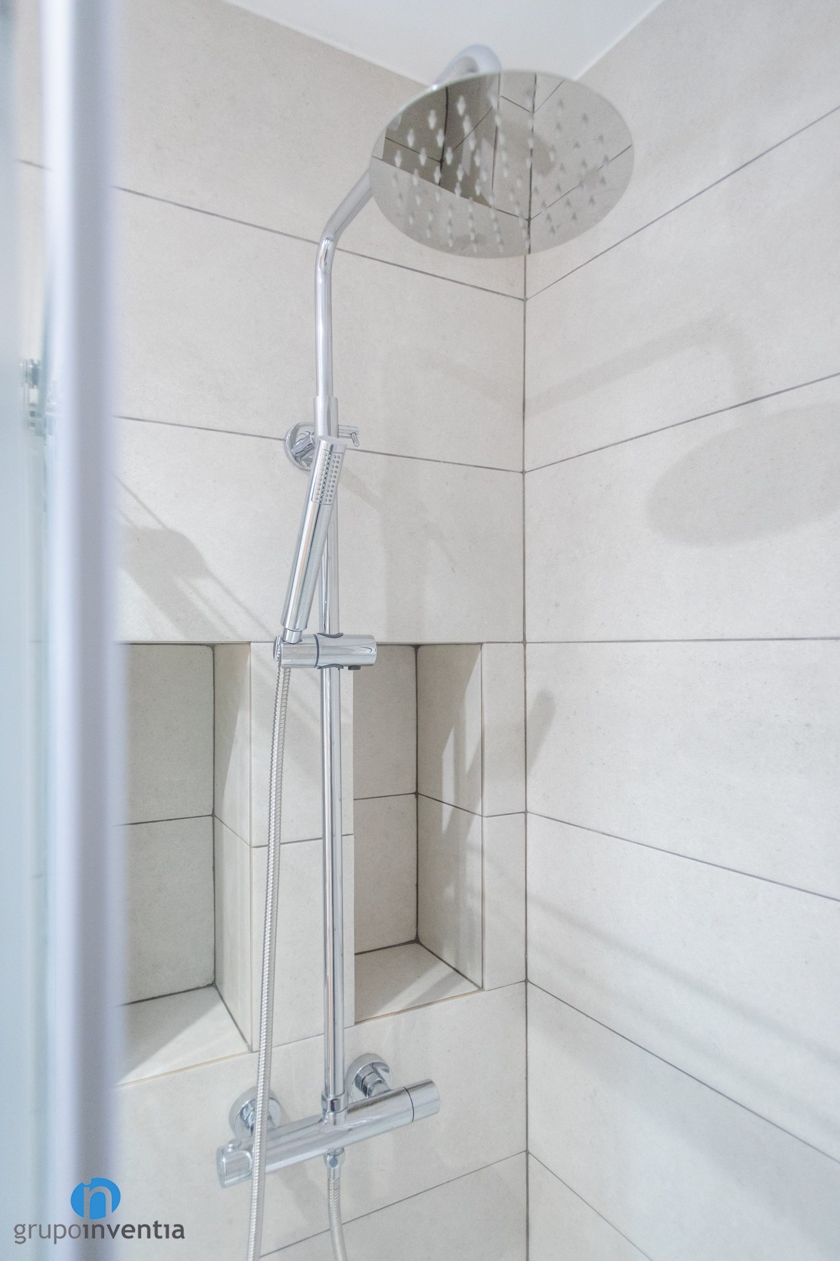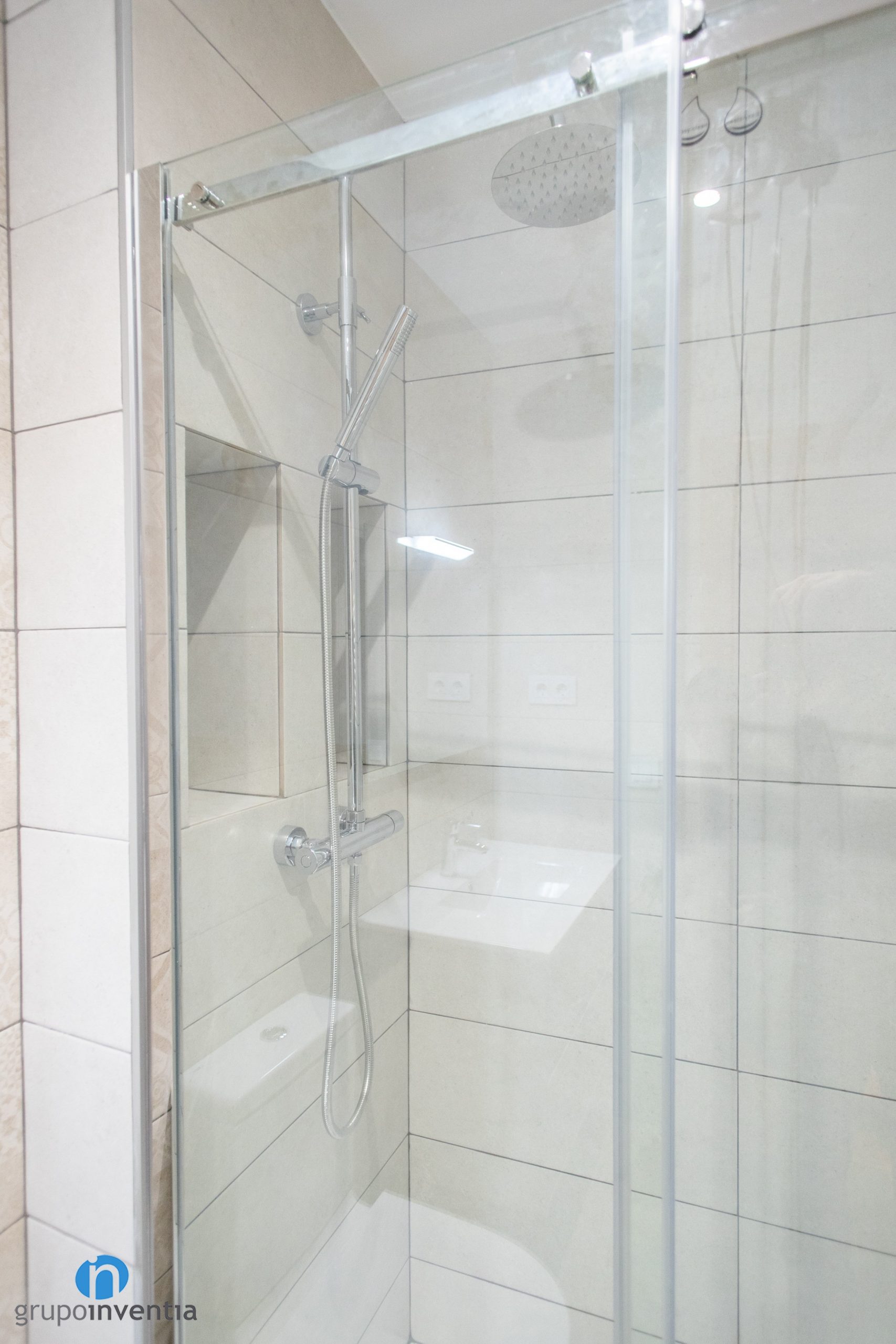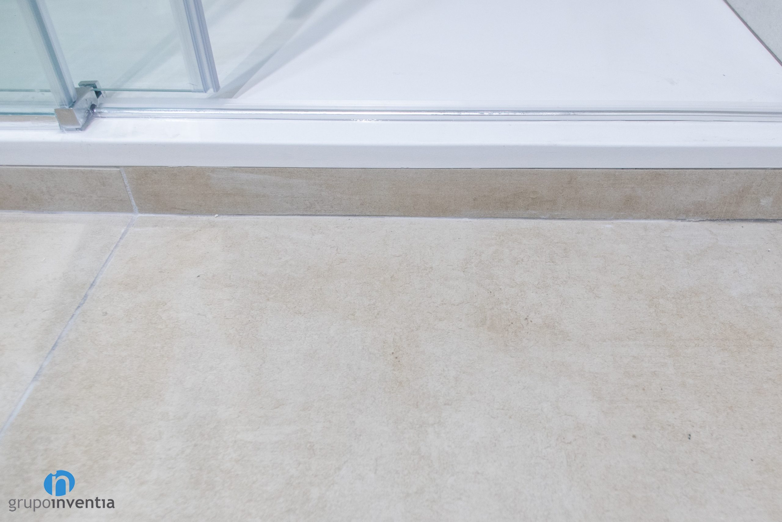 Justo a su lado aparece el inodoro. Se trata de un inodoro clásico con la cisterna en la espalda, aunque de imagen moderna y redondeada. En esta reforma de baño también se ha renovado la zona de aguas. Se ha colocado un plato de ducha de color blanco y amplio. Para los cerramientos se han escogido unas mamparas de puertas correderas. Un detalle de estas es que son transparentes, por lo que no restan espacio visual a la estancia.