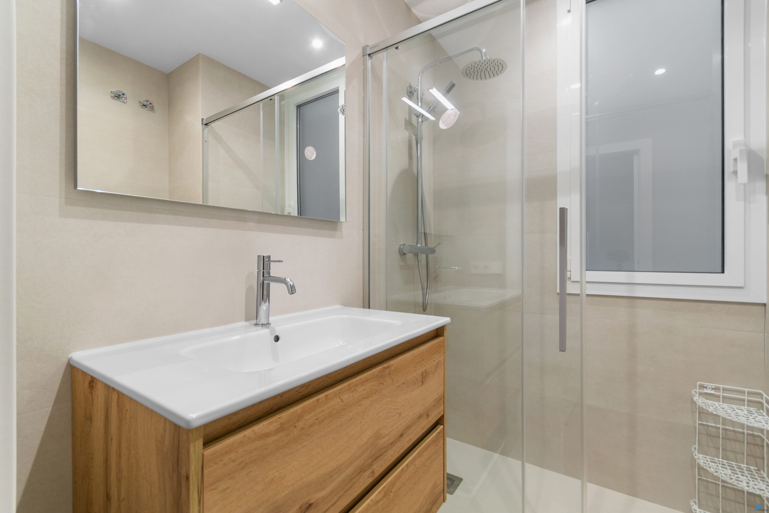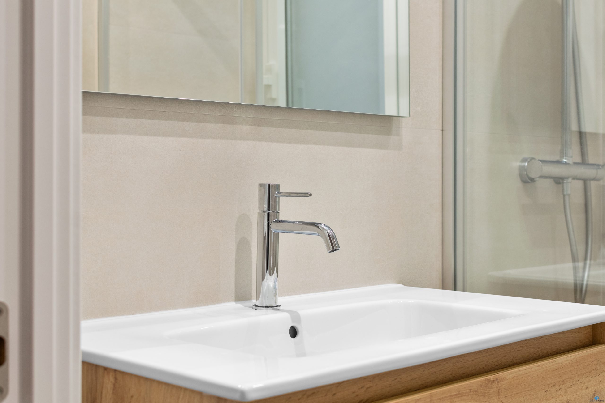 Otro de los elementos destacados en esta reforma de baño es el mueble de lavabo, con acabado en madera natural. Este detalle aporta calidez y conecta con las últimas tendencias en interiorismo. En este sentido la madera vuelve a ser protagonista en espacios húmedos gracias a su versatilidad y resistencia. La combinación entre superficies lisas, tonos suaves y materiales nobles da como resultado una imagen pulida, equilibrada y contemporánea.