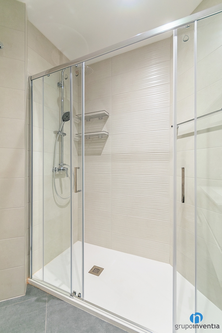 Por su parte, l inodoro cuenta con la cisterna integrada en la espalda, lo que optimiza el espacio y aporta un diseño limpio. Se ha instalado una ducha amplia protegida por mamparas correderas transparentes. Estas mamparas facilitan el acceso y refuerzan la sensación de amplitud.