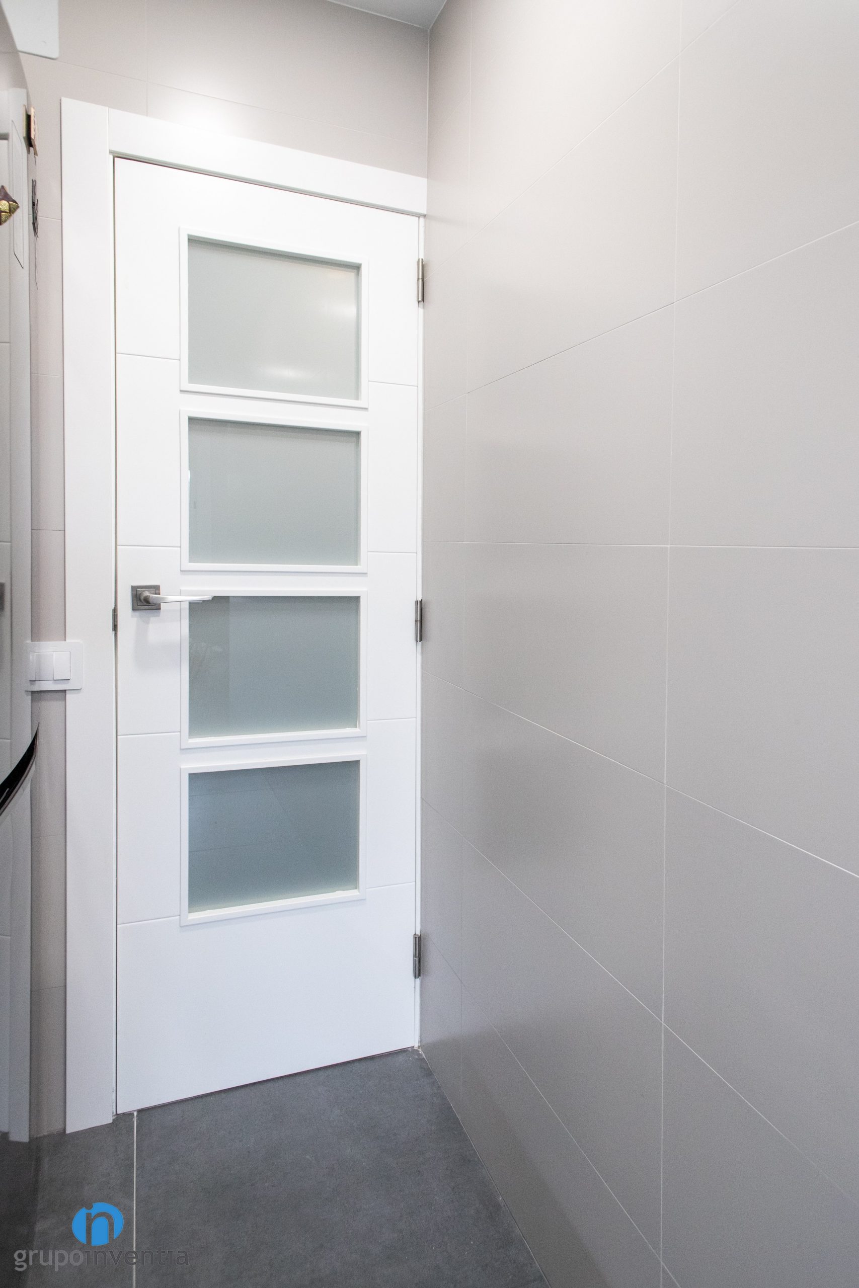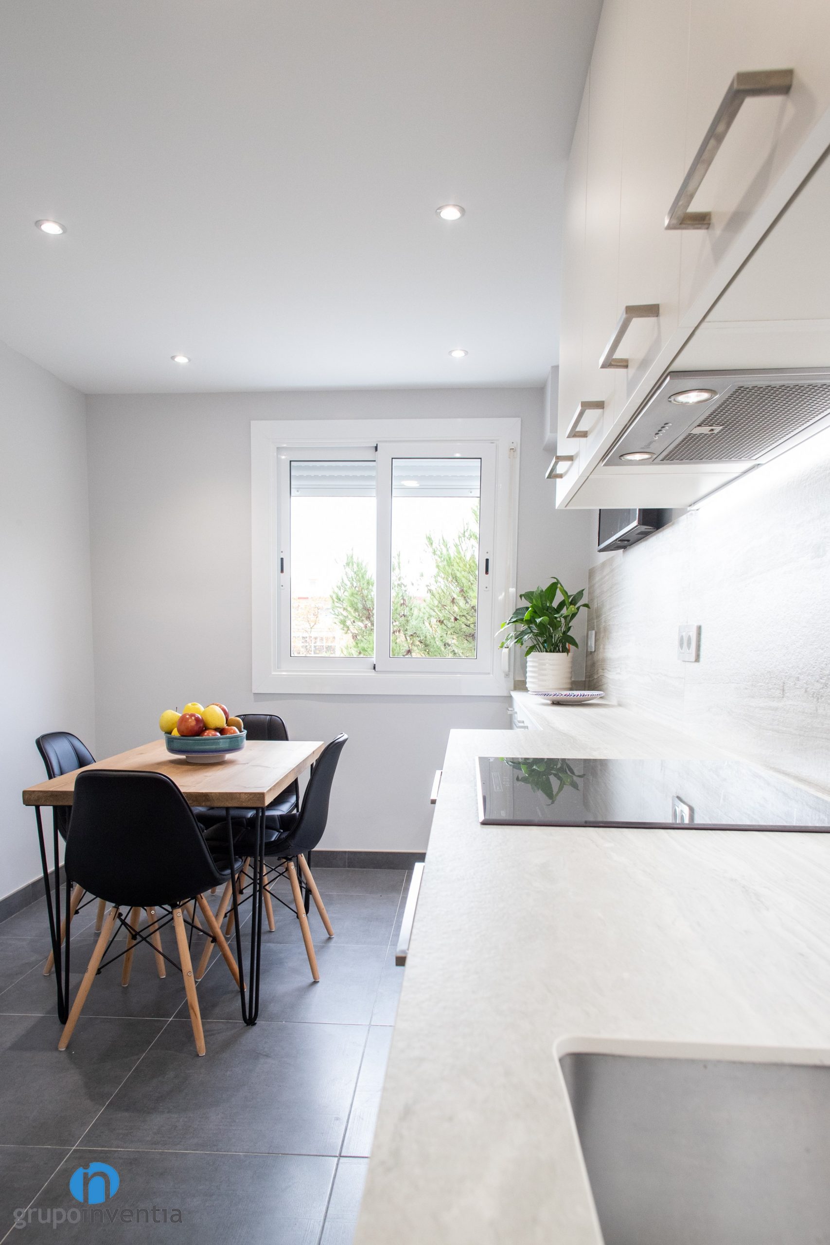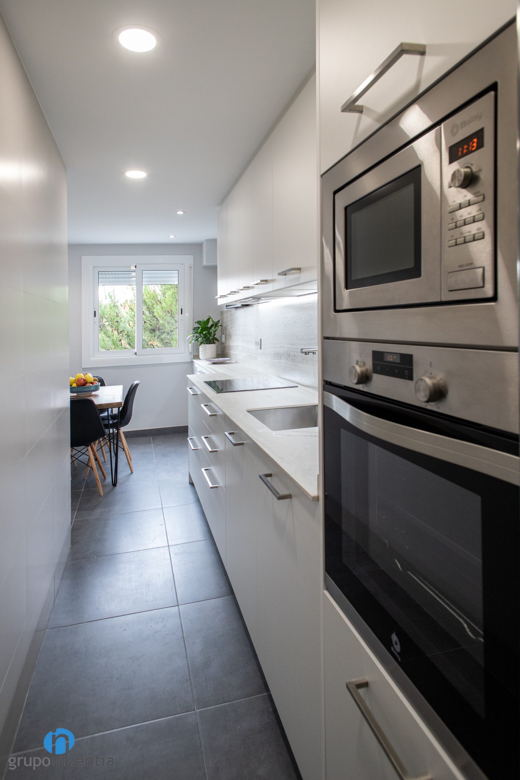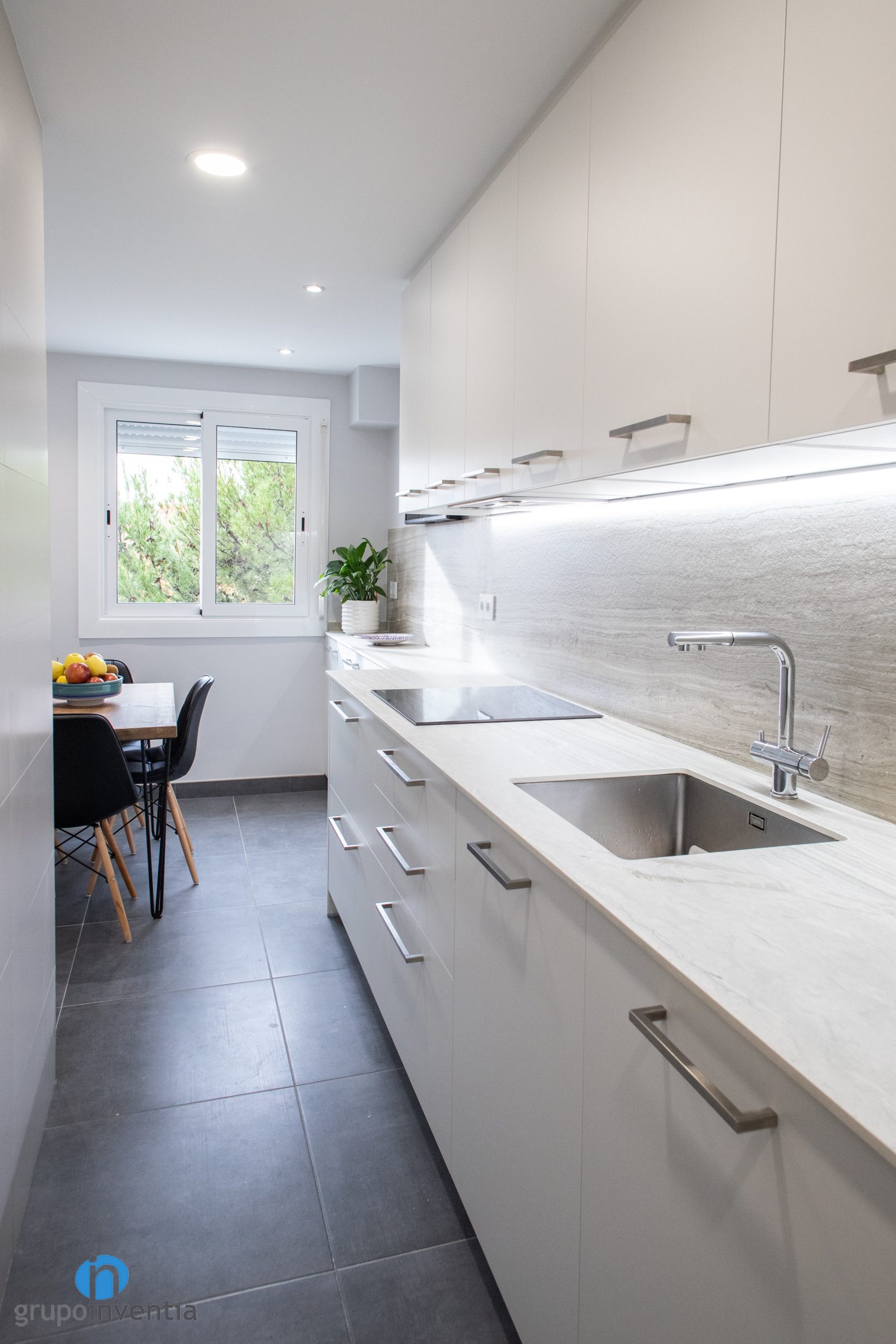 Utilizar este tipo de colores neutros permite introducir más acabados en la reforma de cocina. Los vemos en la pared, con un salpicadero en de acabado en madera o en los tiradores plateados de cajones y armarios. Otro elemento renovado ha sido el pavimento. Se ha optado por un suelo cerámico de color gris. En el apartado visual encaja muy bien y además se trata de una superficie muy resistente.