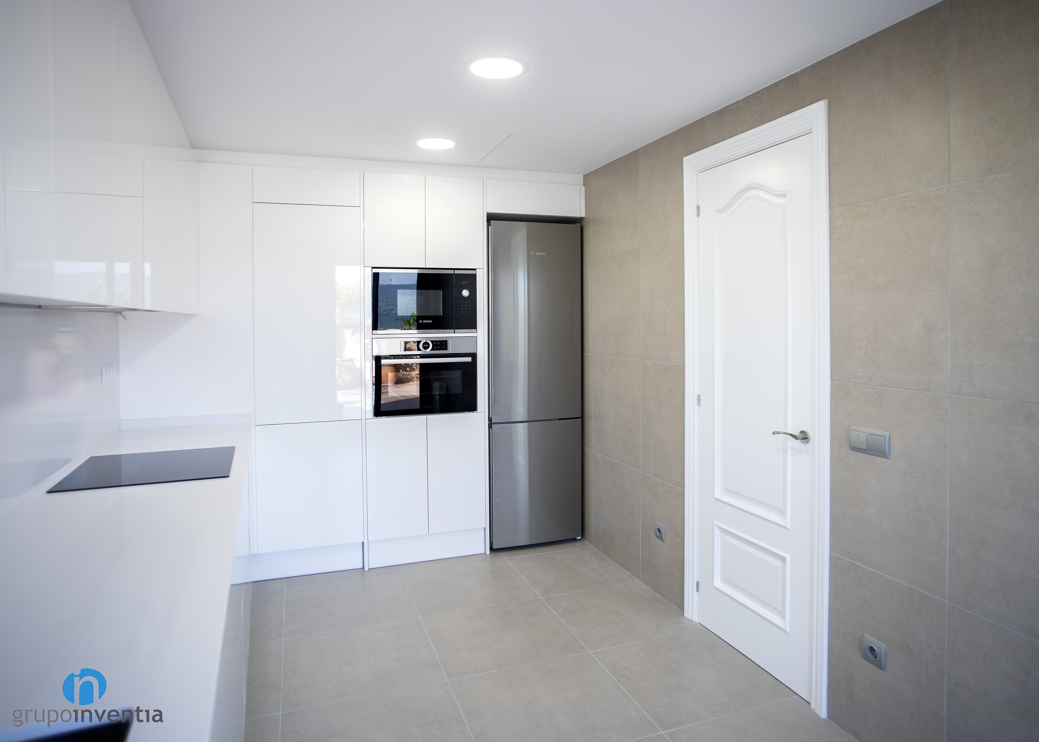 La cocina se ubica en una estancia propia y para la disposición de sus nuevos elementos se optó por una distribución en L. En la parte derecha se colocaron los electrodomésticos, todos ellos encastrados y compuestos por una nevera, un horno y un microondas.