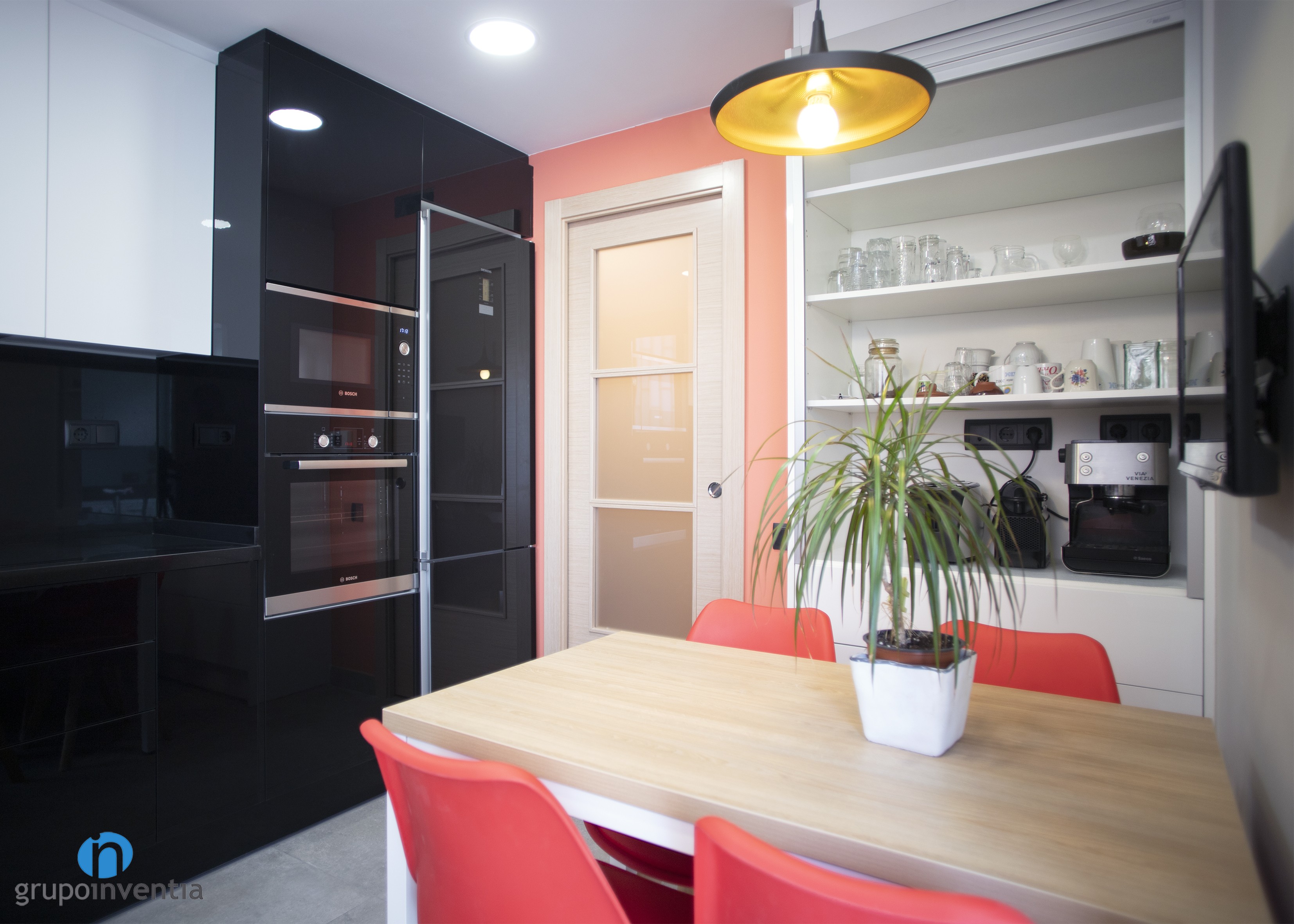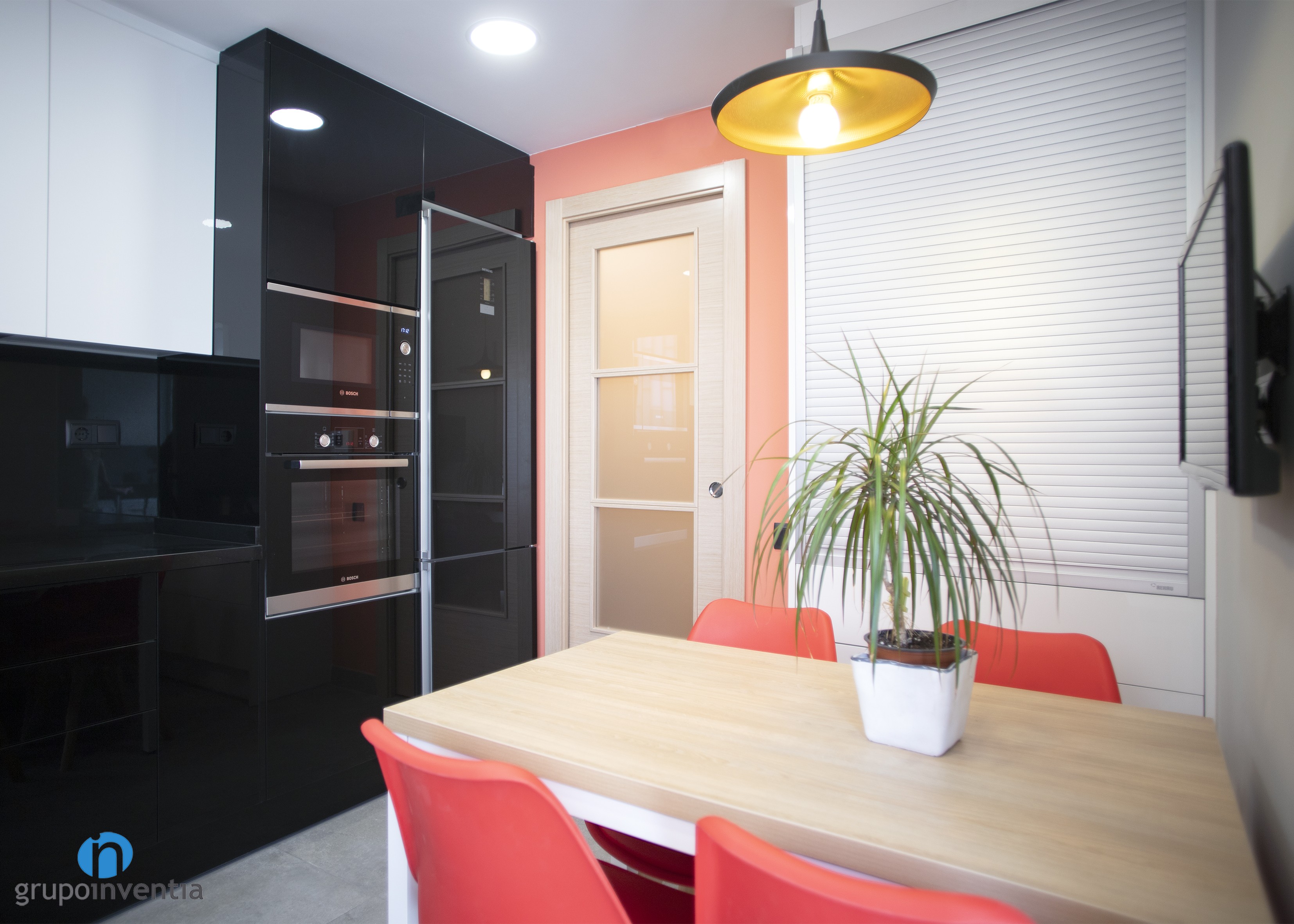 Tras la reforma, la cocina luce una imagen contemporánea y moderna en el que el color negro es el protagonista. Este se utiliza tanto en el mueble de cocina como en el acabado de los electrodomésticos. Sin embargo, la estancia es muy luminosa, ya que cuenta con una gran entrada de luz natural y se combina con colores muy vivos.