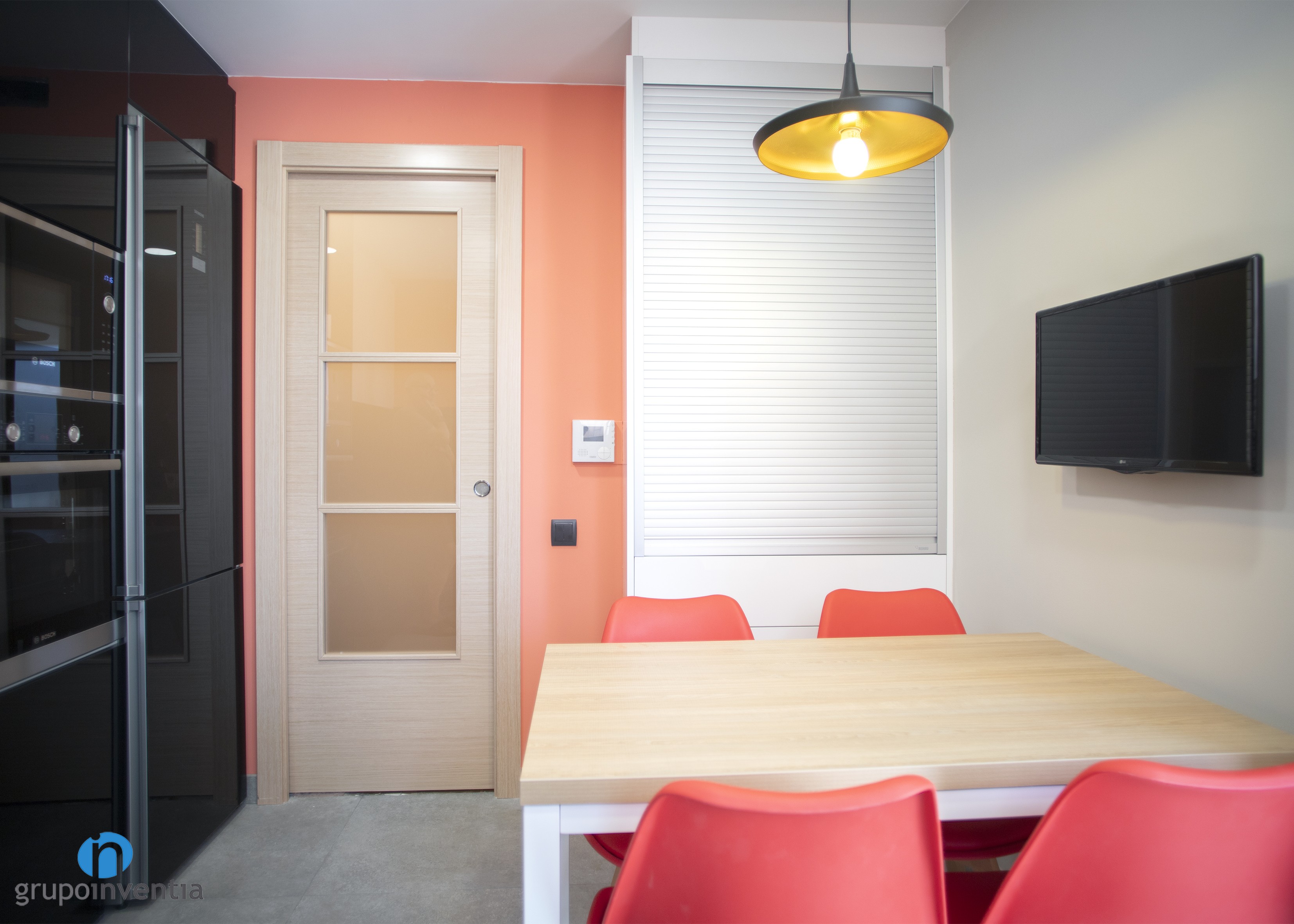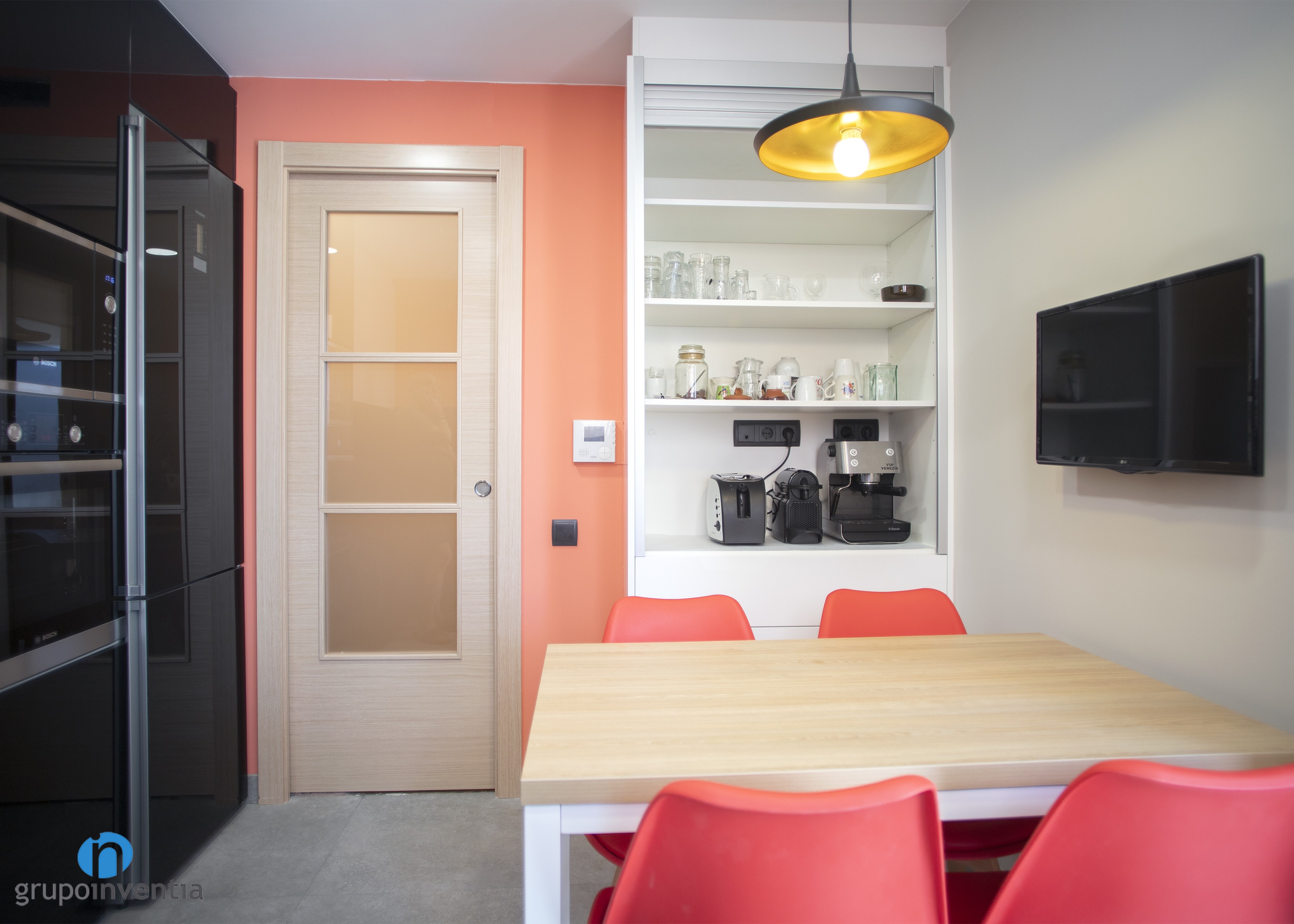 La cocina se ubica en una estancia propia y amplia, a la que se accede a través de una puerta corredera. La parte izquierda se destinó a colocar una mesa con varias sillas, consiguiendo un espacio office perfecto para comidas distendidas y recibir a las visitas.