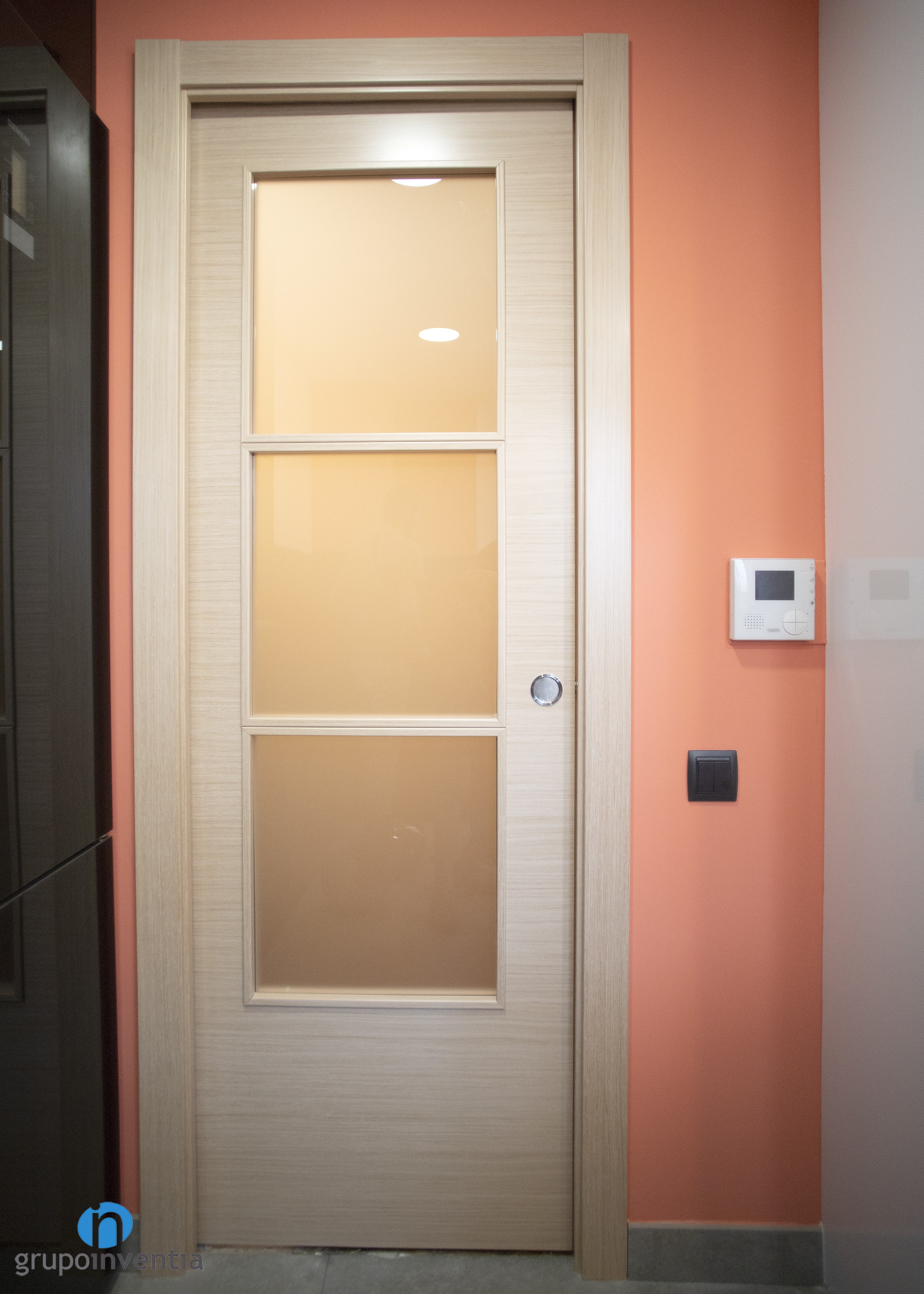 Para las paredes se utilizó el color salmón y el blanco, haciendo juego este último con el pavimento de gres colocado. A su vez, también se incorporan acabados en madera, como el de las puertas correderas que dan acceso a la estancia.