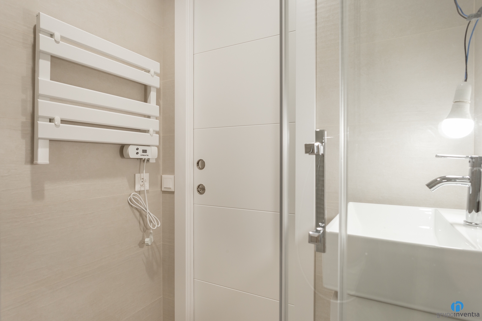 De este modo hemos instalado tres nuevas piezas sanitarias. Se componen de un lavabo con mueble de almacenaje de color blanco incorporado, un inodoro de iagen clásica y una ducha. La zona de aguas es esquinera y que perfectamente aislada por unas mamparas. A su vez, hemos instalado un seca toallas eléctrico.