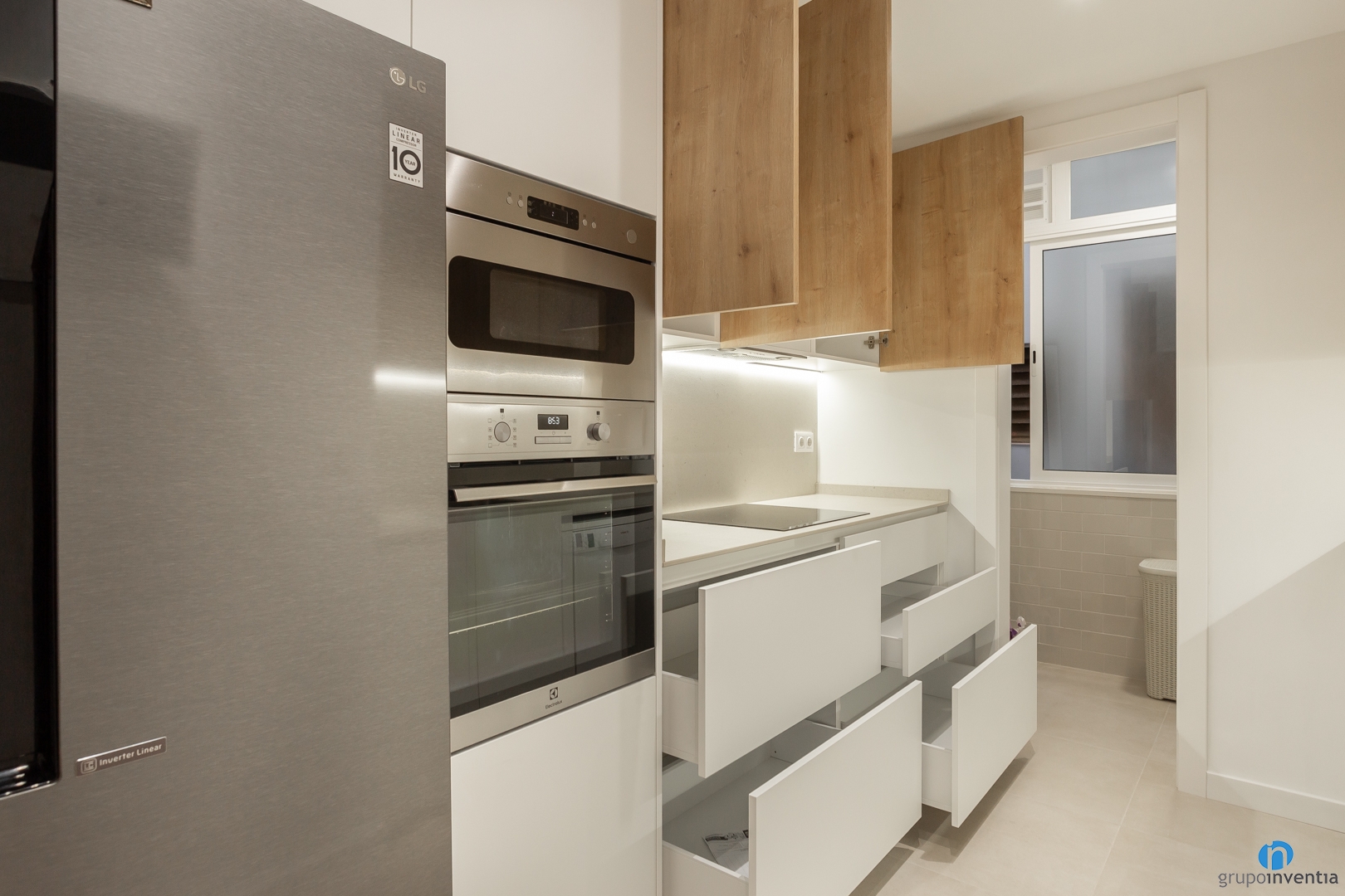 En esta ocasión la cocina está situada en un espacio independiente y está distribuida a dos frentes. Gracias a esta disposición hemos conseguido generar una movilidad perfecta en la cocina. Además, todos los nuevos elementos estás ubicados en la zona más funcional. Se trata de una reforma de cocina pensada para ofrecer las mejores prestaciones a diario.