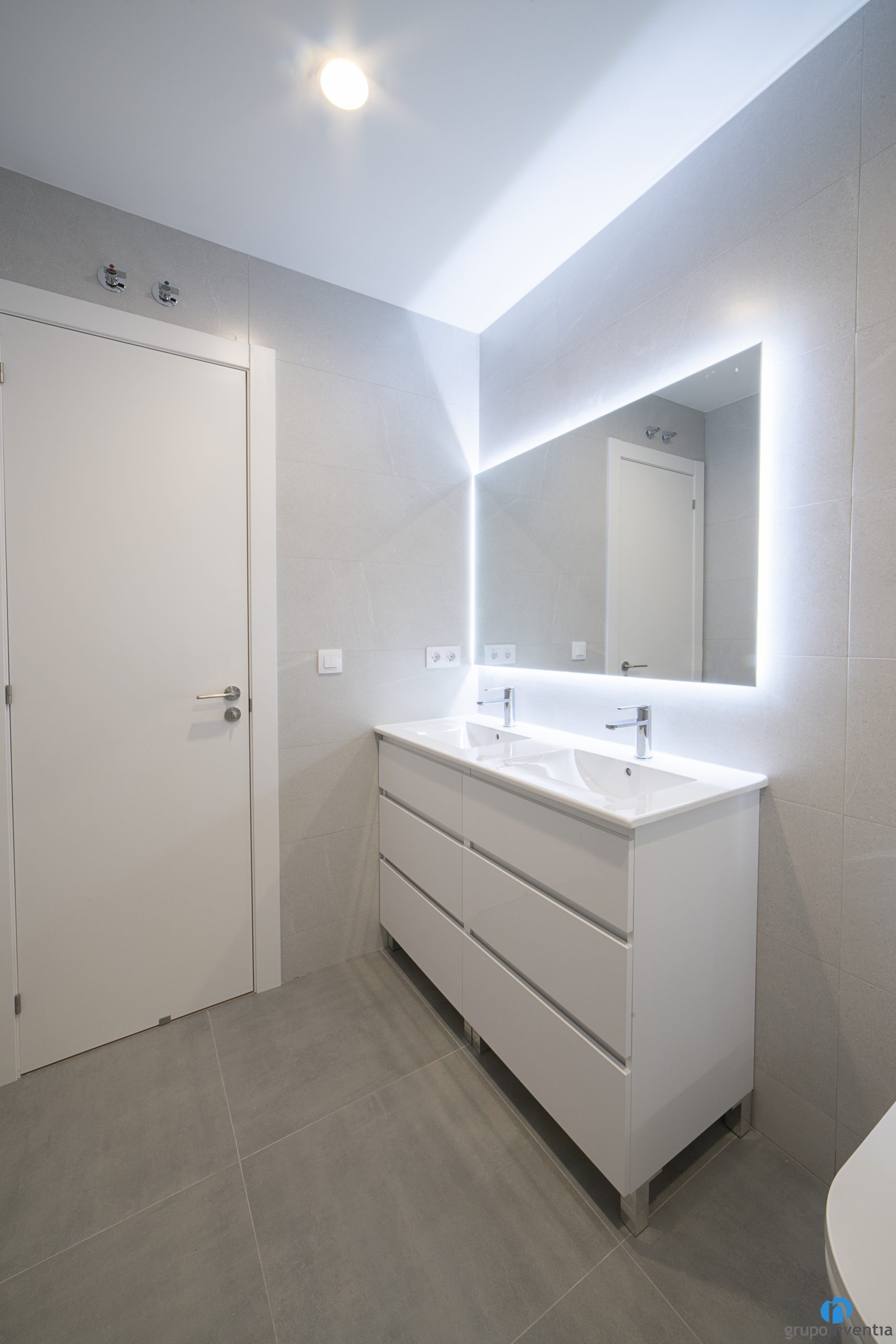 Las paredes del baño las hemos alicatado con azulejos de tono gris suave. Generan un ambiente muy acogedor y combinan perfectamente con las baldosas grises del suelo. El mueble del lavabo es de color blanco y contribuye a generar mayor luminosidad y sensación de amplitud en la zona de aseo.