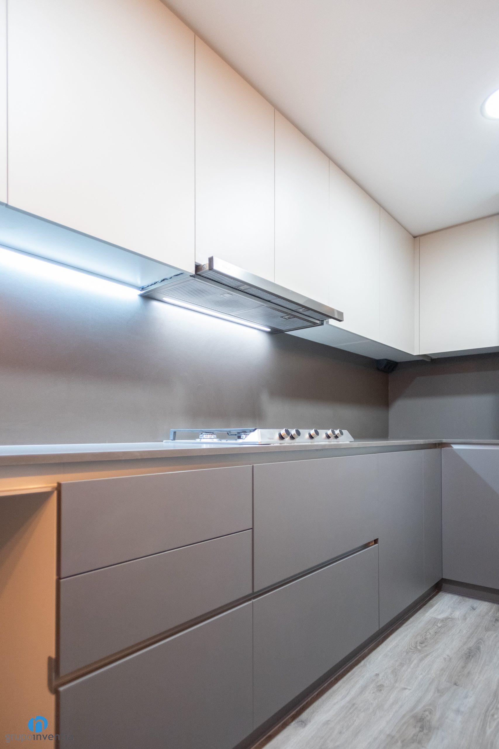 La cocina está distribuida en forma de U. De este modo genera una amplia superficie de apoyo y también de almacenaje. En las zona inferior y superior de ambos frentes se han dispuesto varios cajones y armarios. Así ocurre en el lado izquierdo de esta reforma de cocina dónde se ha colocado una encimera equipada con una placa de cocción de cinco fogones.