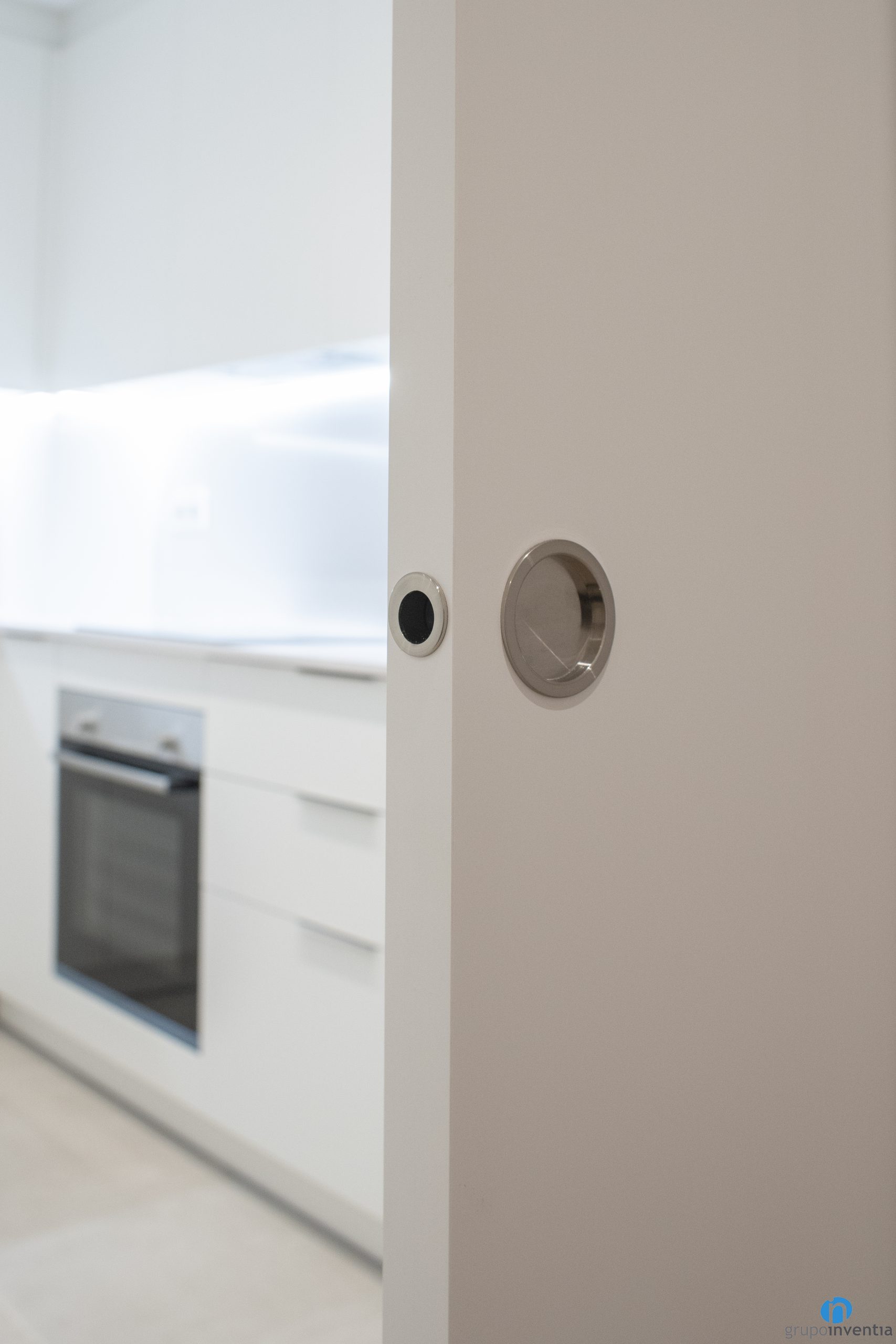 El diseño de la cocina mantiene la imagen contemporánea del resto del piso. El mueble de cocina en blanco y las encimera también. Los armarios superiores son de panel liso y los cajones inferiores se abren con un discreto tirador en color plateado. En esta reforma de cocina también hemos colocado un nuevo suelo de baldosas beige.