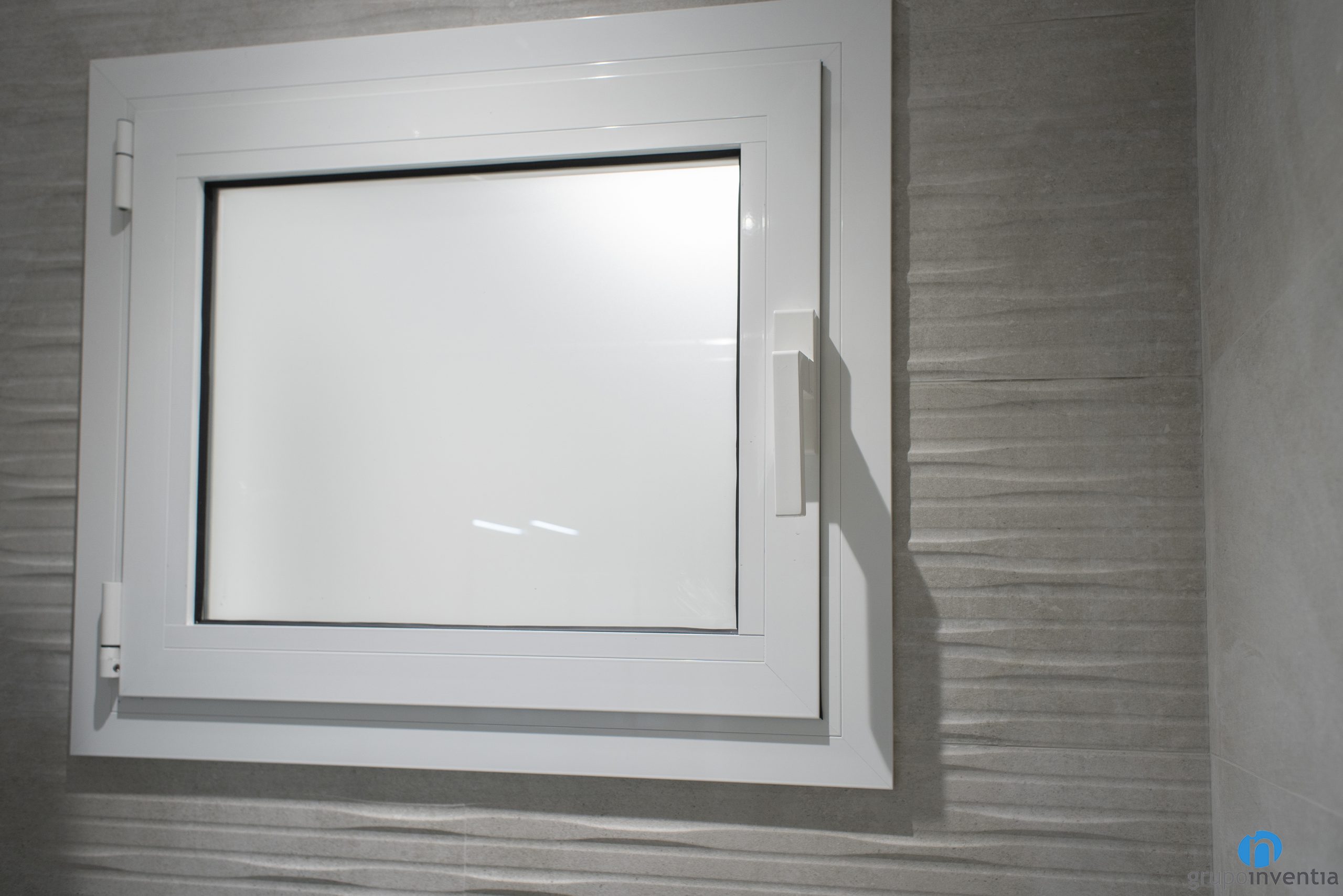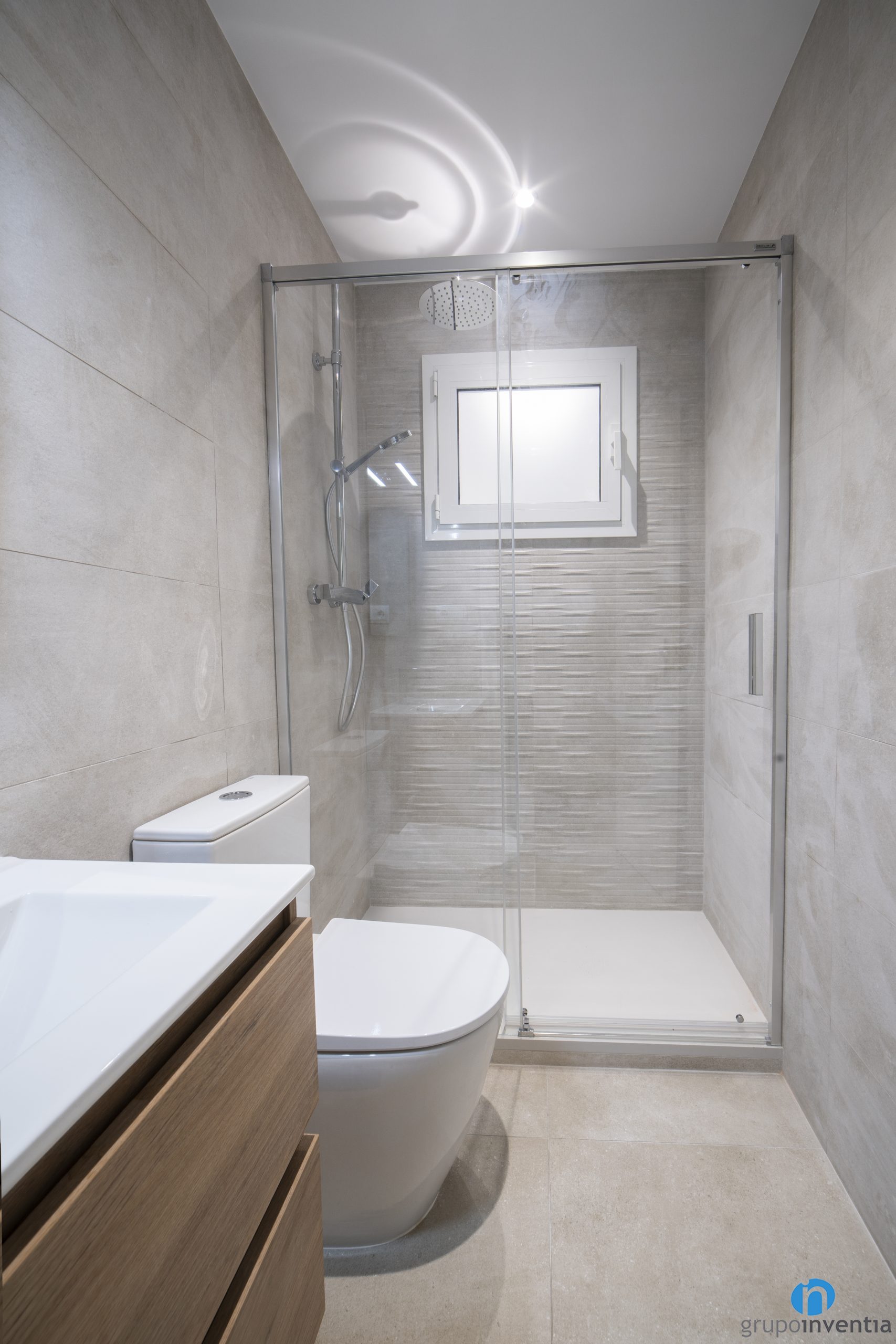 Para el equipamiento sanitario hemos instalado un lavabo con un mueble de dos cajones. Así aprovechamos el espacio y generamos un espacio de almacenaje perfecto. Le acompañan un inodoro de líneas modernas y una zona de aguas. En esta hemos colocado un plato de ducha que queda protegido por unas mamparas de puerta corredera.