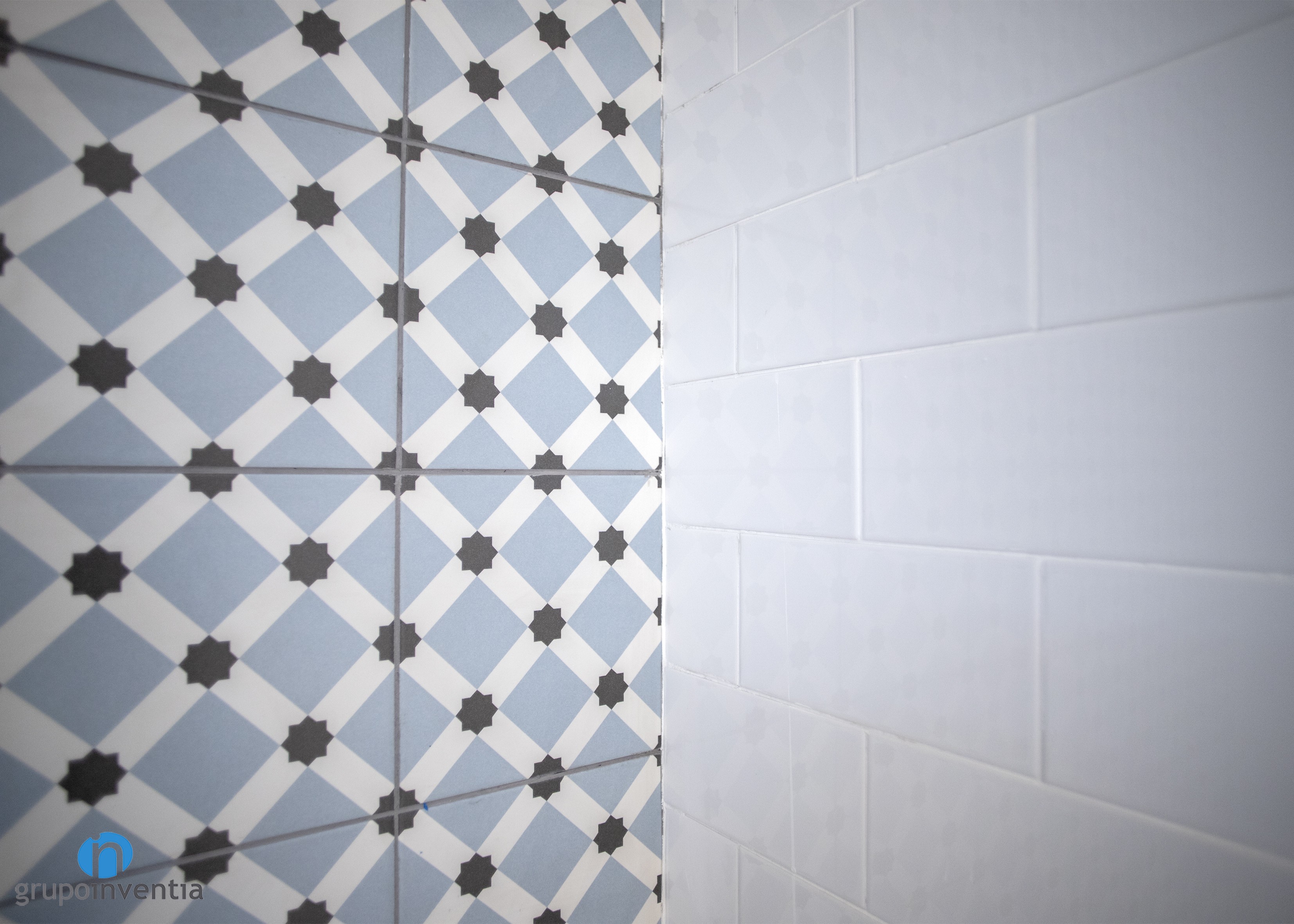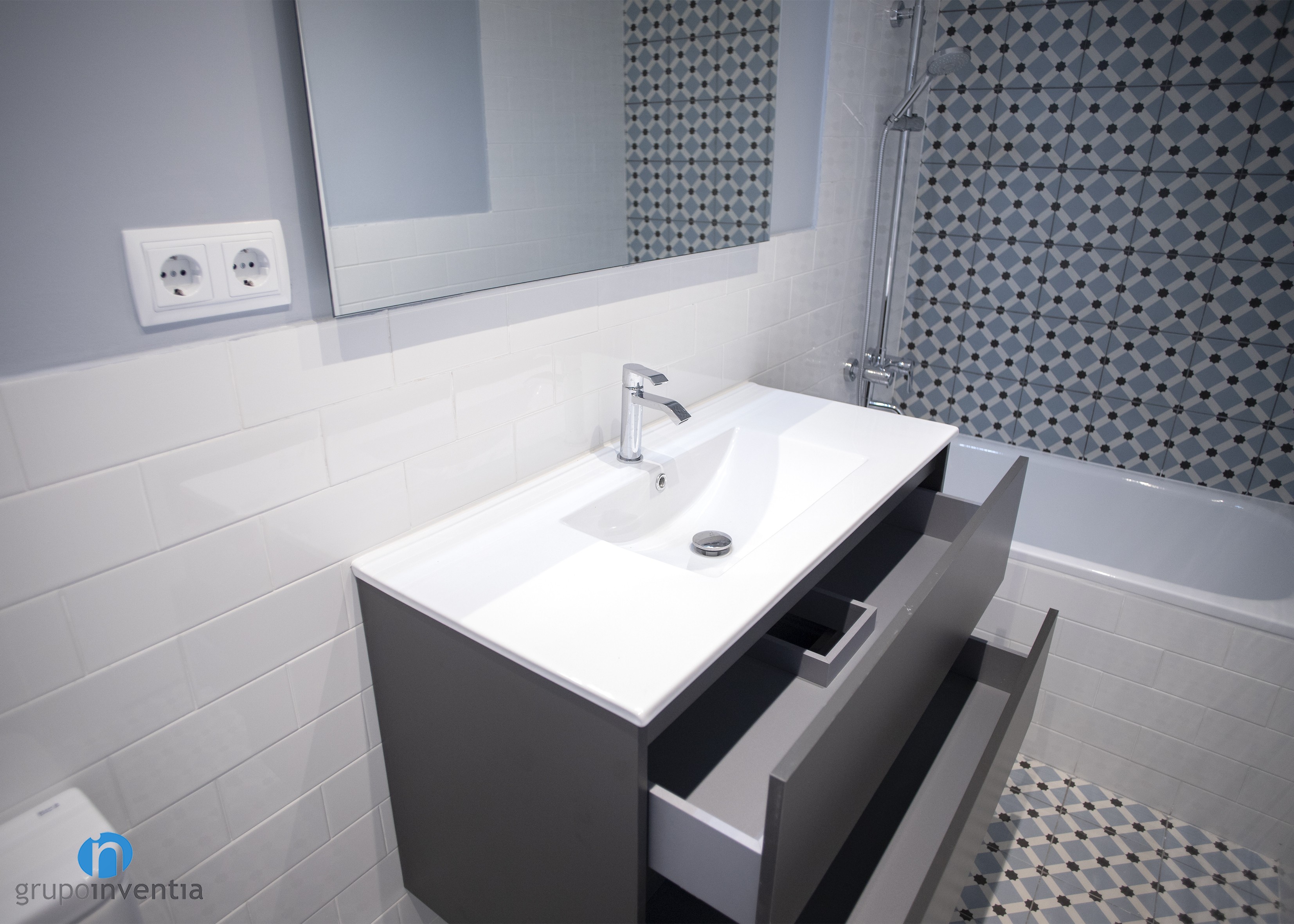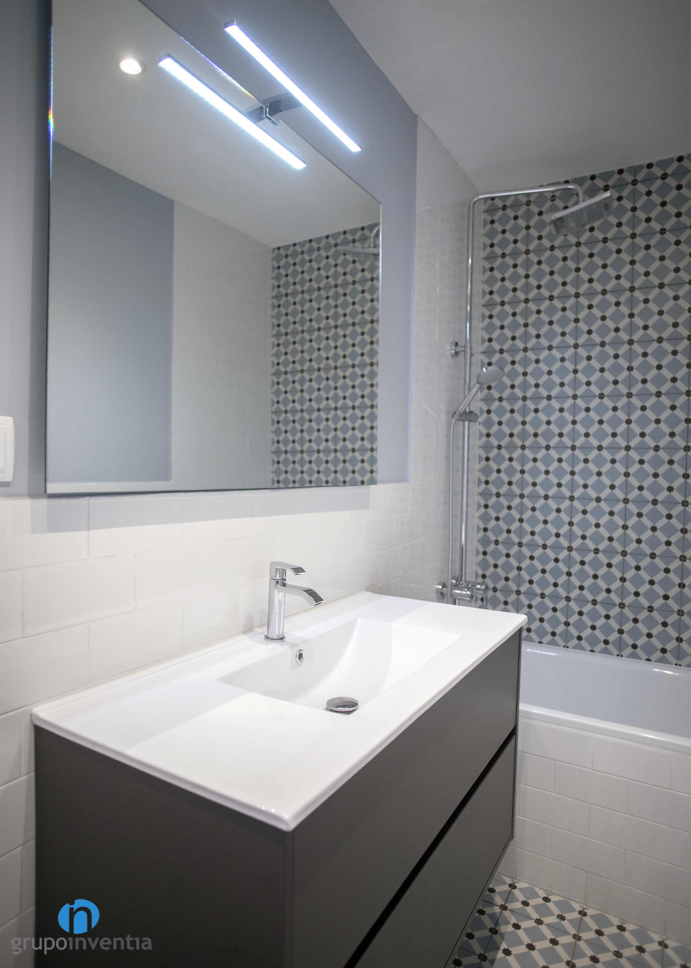 En cuanto al diseño, las paredes se alicataron a media altura con azulejos tipo metro de color blanco y se pintó de gris el resto hacia el techo. La nota de color en esta estancia la aporta el alicatado de la pared de la bañera, con azulejos que crean figuras de color azul y negro.