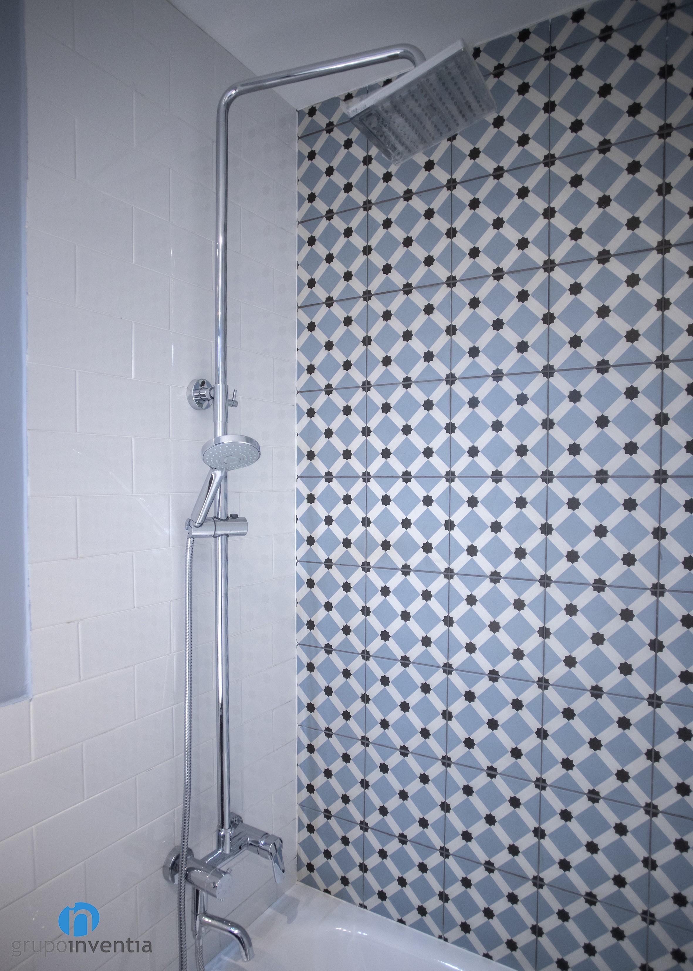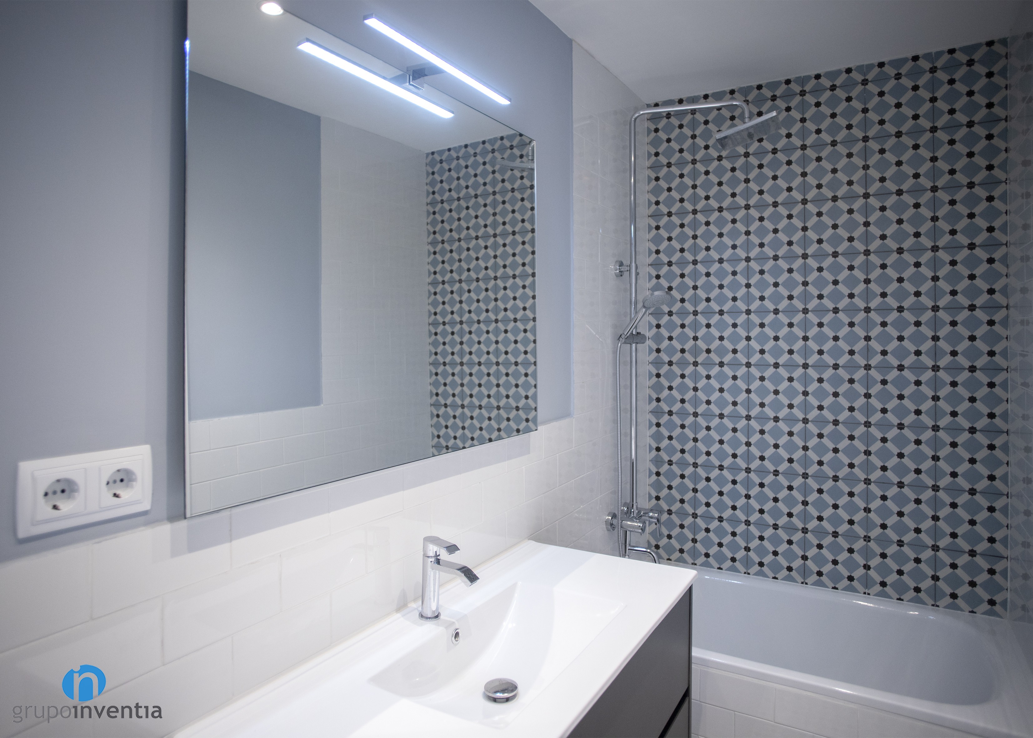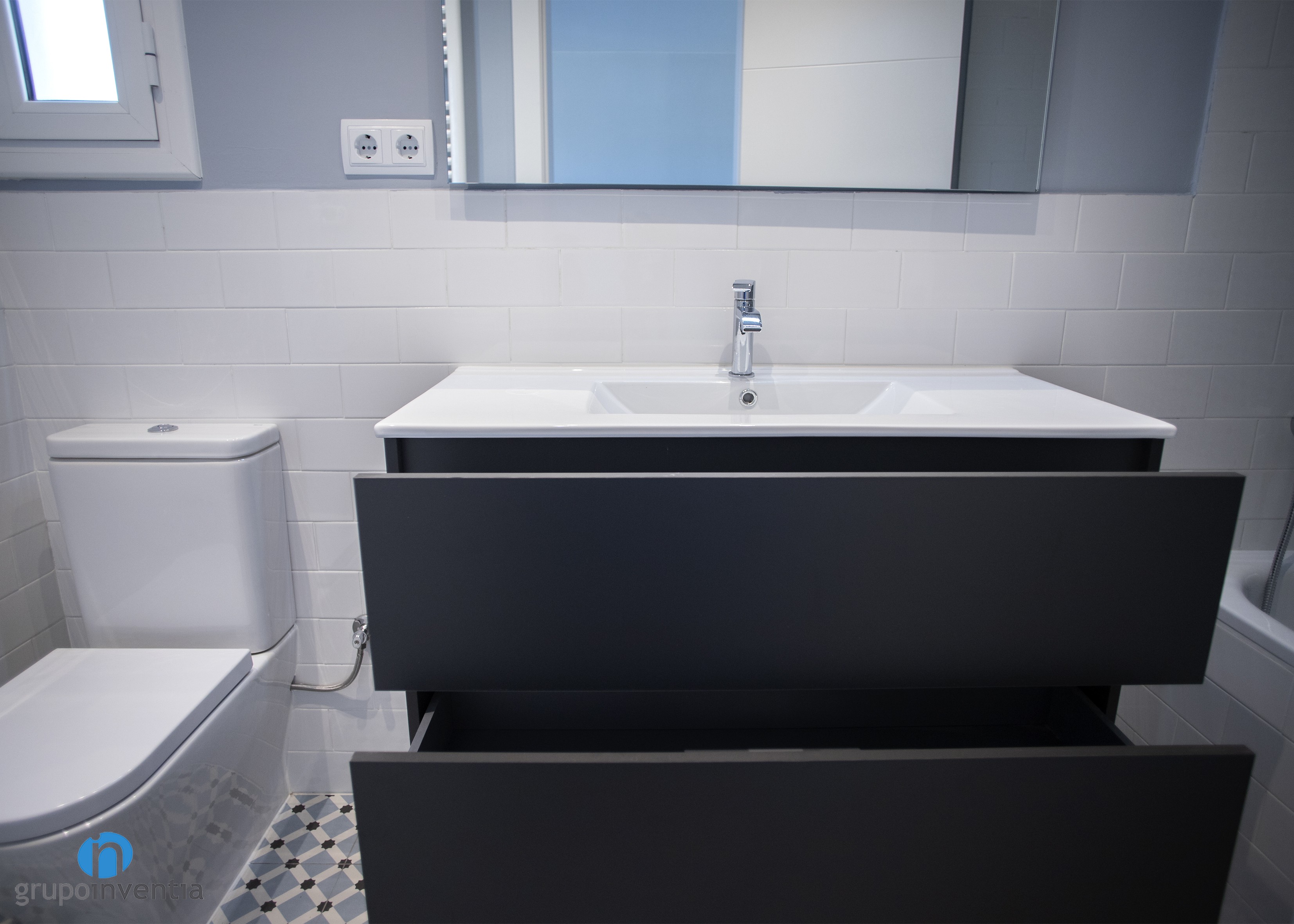 En cuanto al diseño, las paredes se alicataron a media altura con azulejos tipo metro de color blanco y se pintó de gris el resto hacia el techo. La nota de color en esta estancia la aporta el alicatado de la pared de la bañera, con azulejos que crean figuras de color azul y negro.
