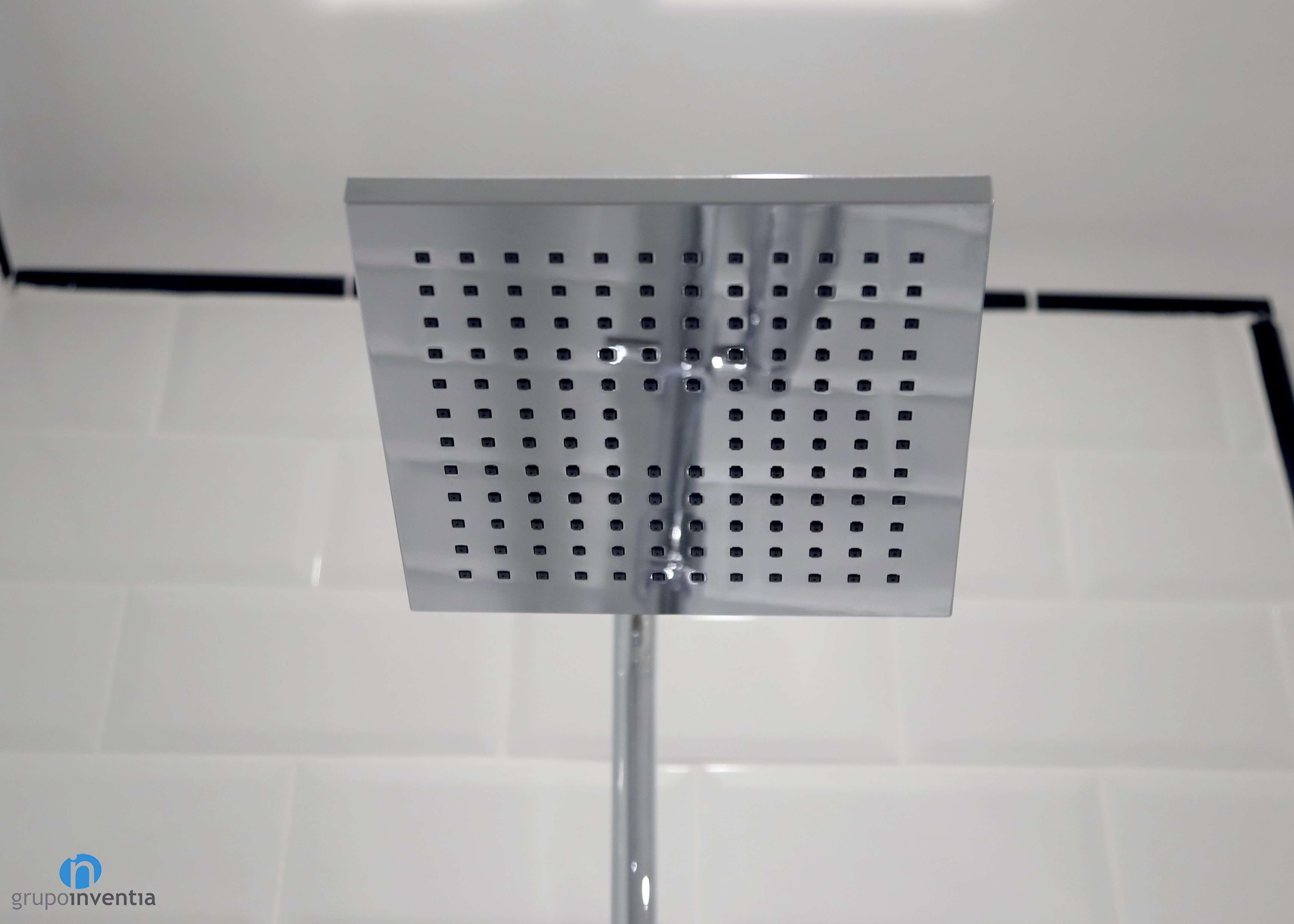 Tras la reforma, el cuarto de baño vio mejorado su equipamiento sanitario con creces, pudiendo ofrecer las mejores prestaciones y funcionalidad en su uso. Éste se compone de un lavabo con mueble de almacenaje incorporado, un inodoro y una ducha protegida por mamparas de puerta corredera.