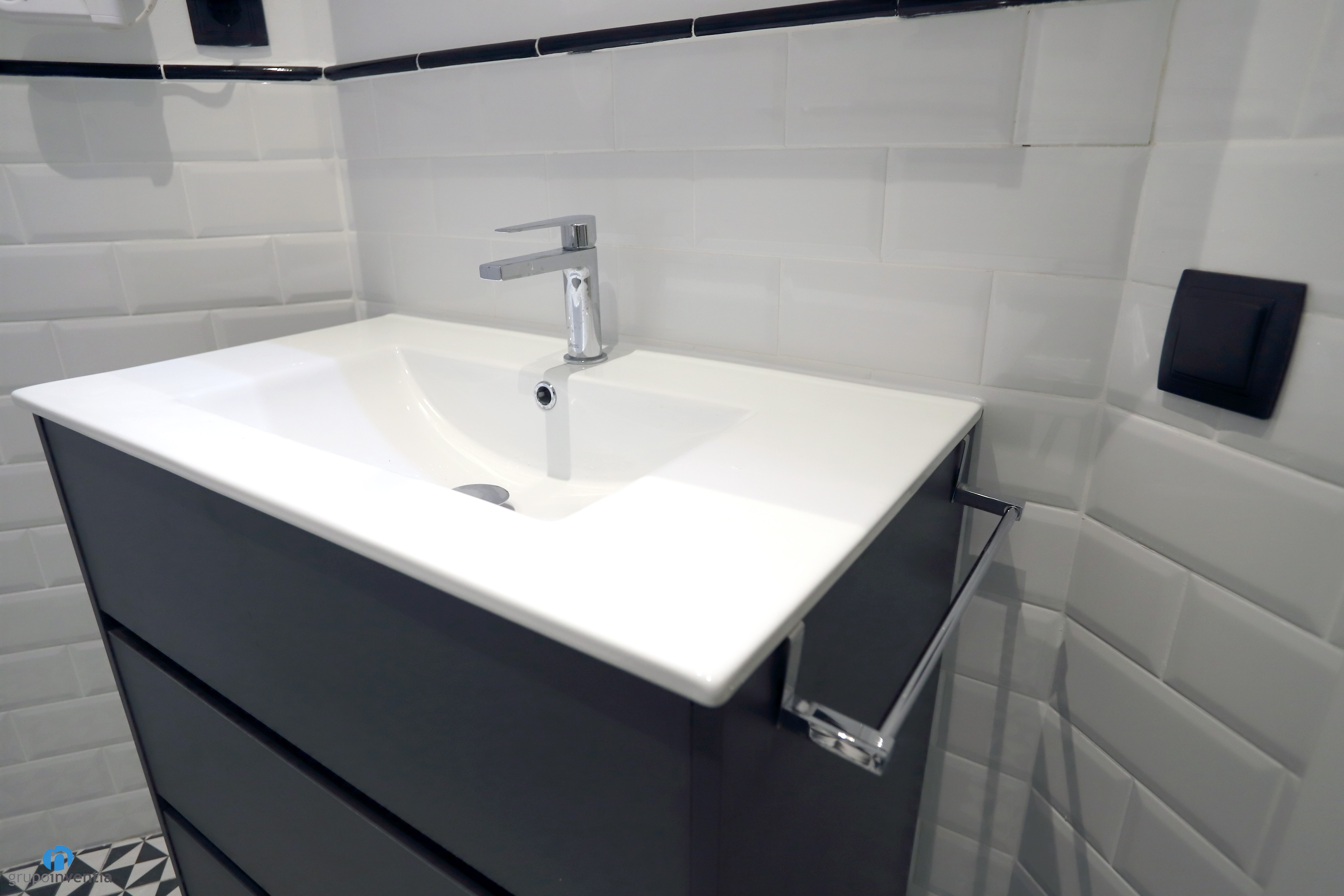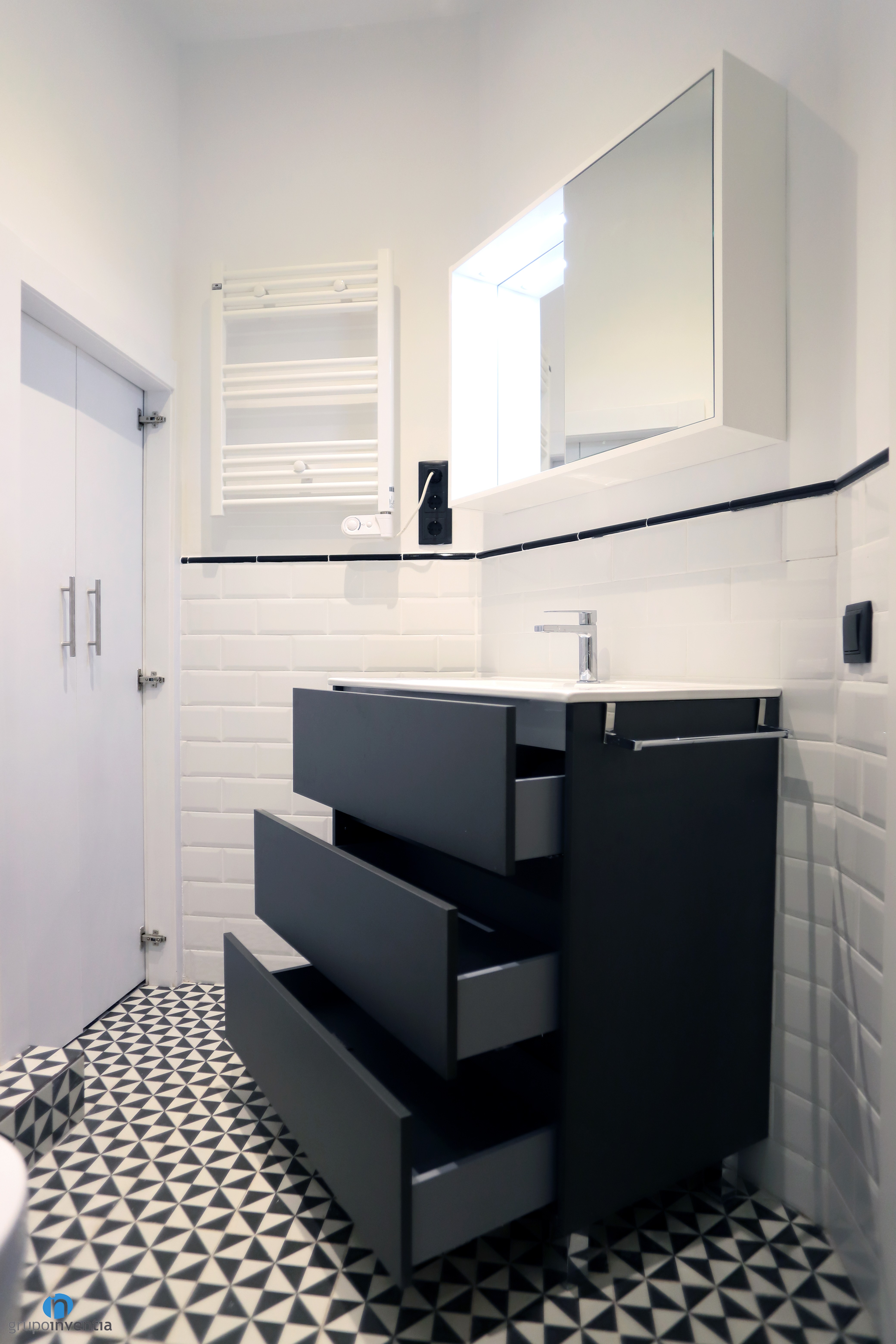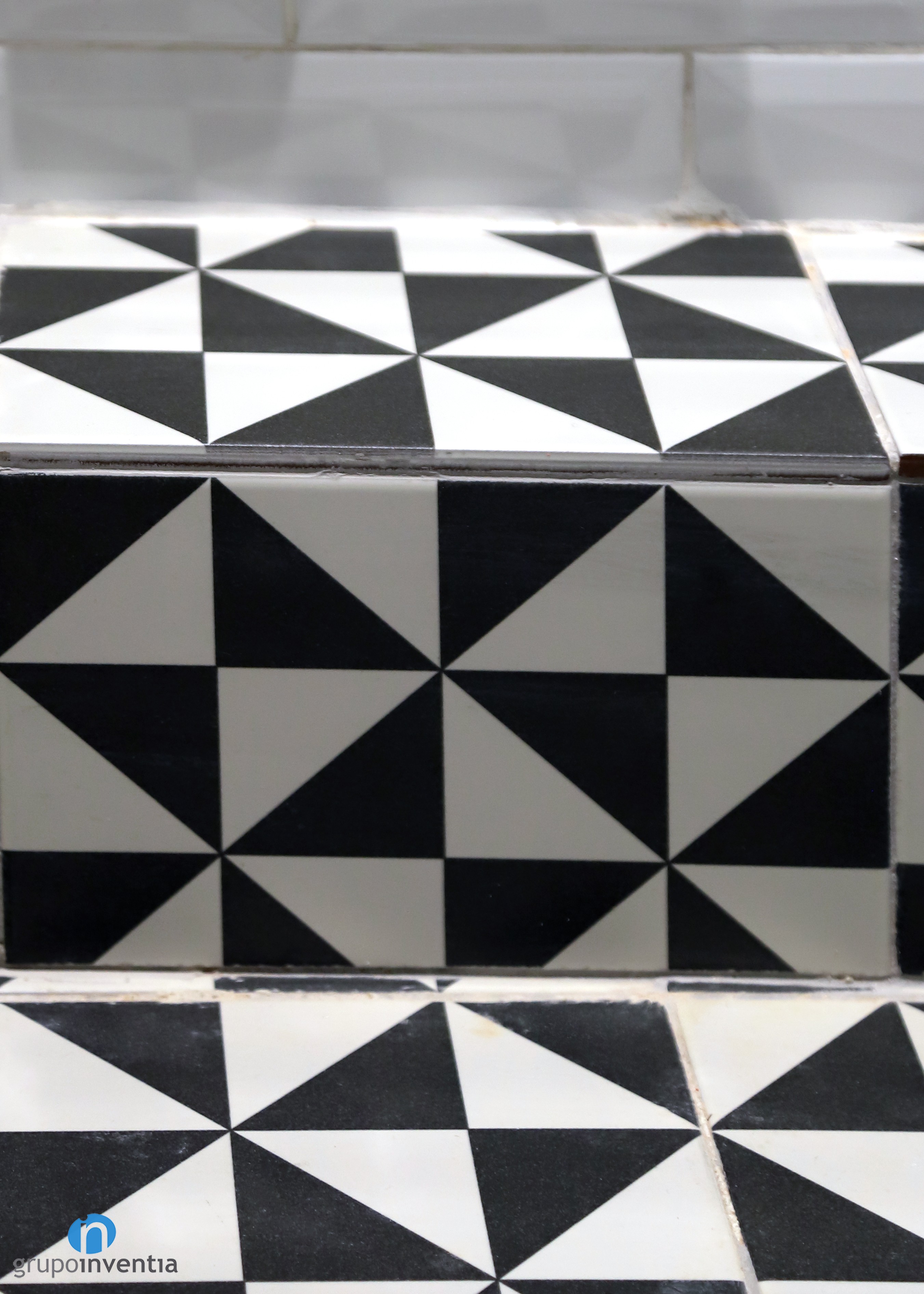 Para el diseño de la estancia se apostó por generar luminosidad y sensación de amplitud. Así, las paredes se alicataron a media altura con azulejos tipo metro blancos y se pintó del mismo color el resto hasta llegar al techo. Éste se combina con el negro, utilizado en el pavimento hidráulico, en una fina línea en los azulejos de la pared y en el mueble de baño.