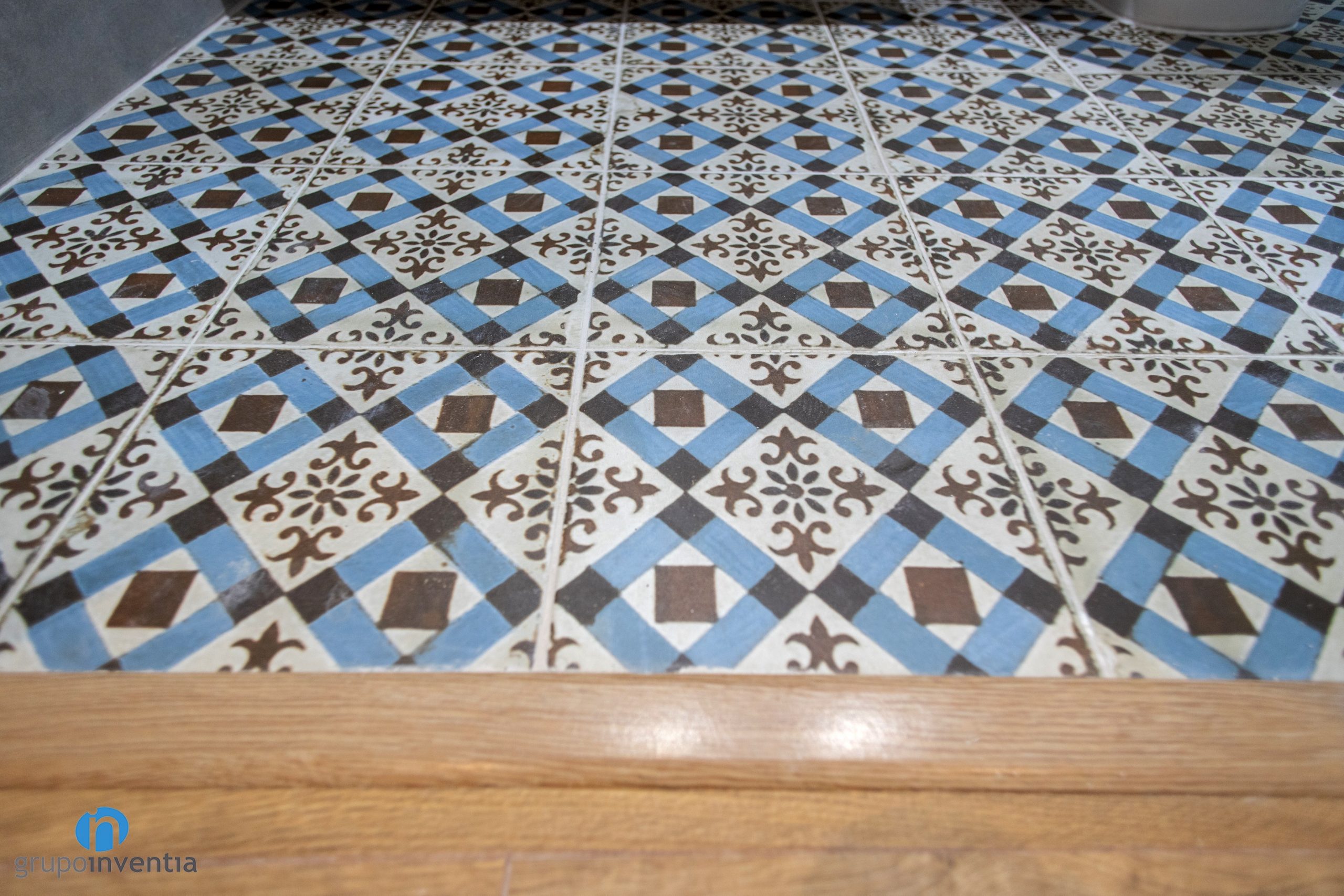Siguiendo la línea decorativa general de la vivienda, en el baño también hay presencia de tonos neutros. Concretamente las paredes se han alicatado con azulejos blancos. Esto ha permitido introducir otros acabados. Se pueden ver en el mueble de baño con acabados en madera o en el suelo hidráulico original restaurado.