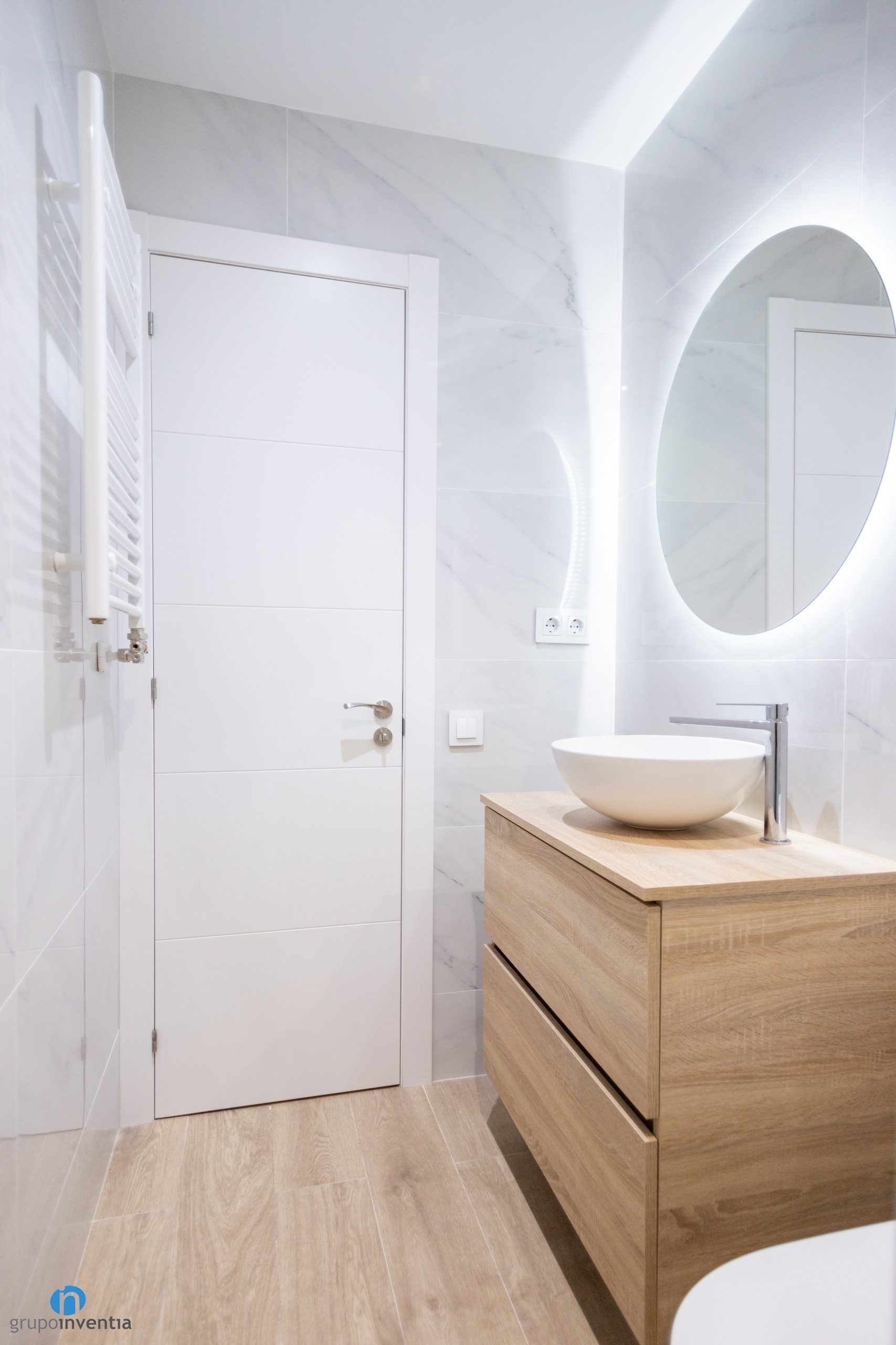 Al tratarse de una reforma integral también nos hemos encargado de renovar por completo el cuarto de baño. La nueva imagen es similar al del resto de la vivienda. Un diseño contemporáneo con tonos neutros que generan un espacio de ambiente acogedor. Las paredes se han alicatado con baldosas grandes de color blanco con detalles de mármol. El suelo cerámico imitación madera combina muy bien con el nuevo mueble de baño.