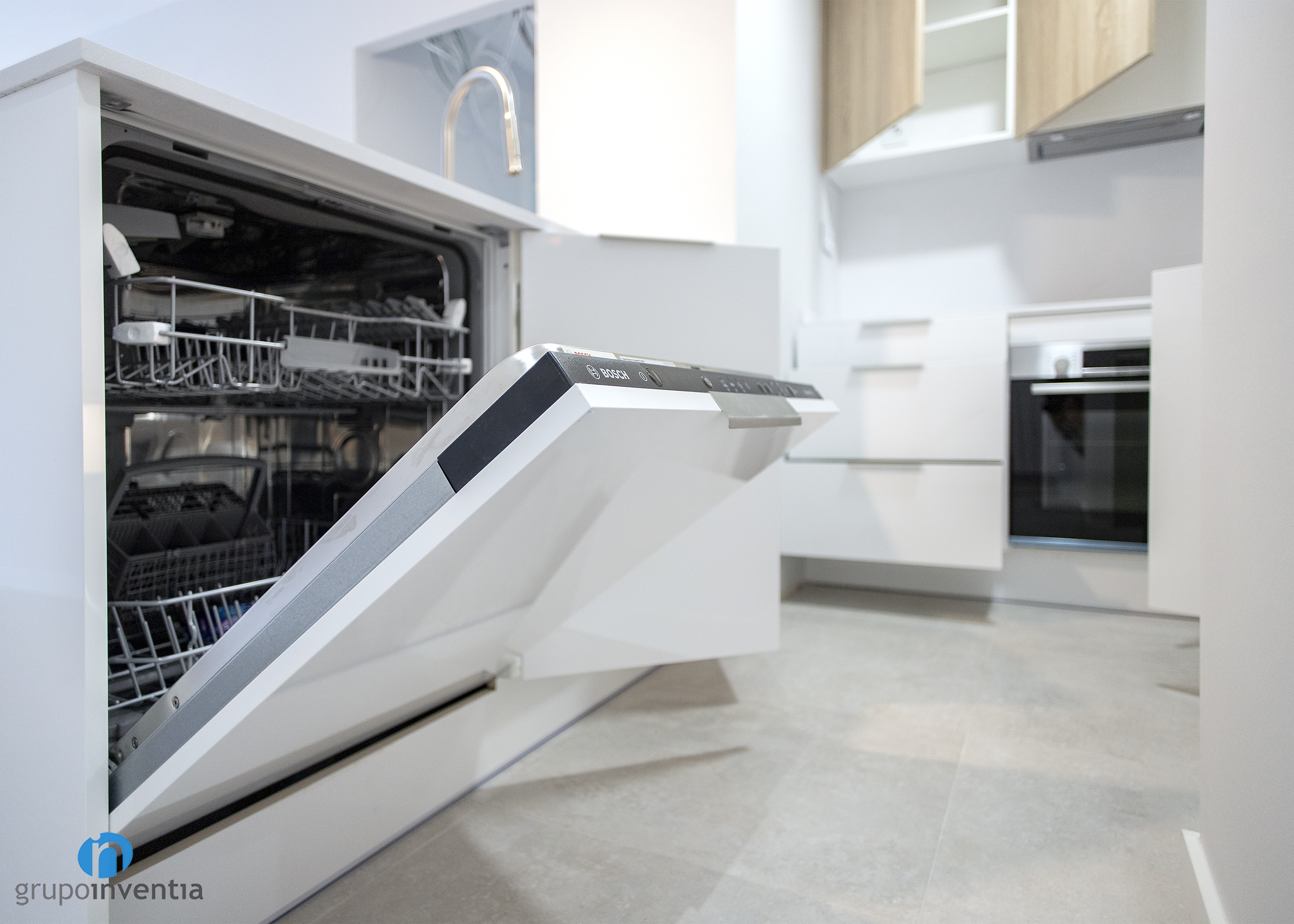 La cocina es una de las estancias indispensables en cualquier vivienda y en este caso se trabajo para que ofreciera las mejores prestaciones y funcionalidad en su uso. Se trata de una cocina distribuida en forma de U y que está abierta al salón. En el lado abierto se colocó un tramo de encimera equipado con un fregadero y que a su vez tiene función de barra de desayuno.