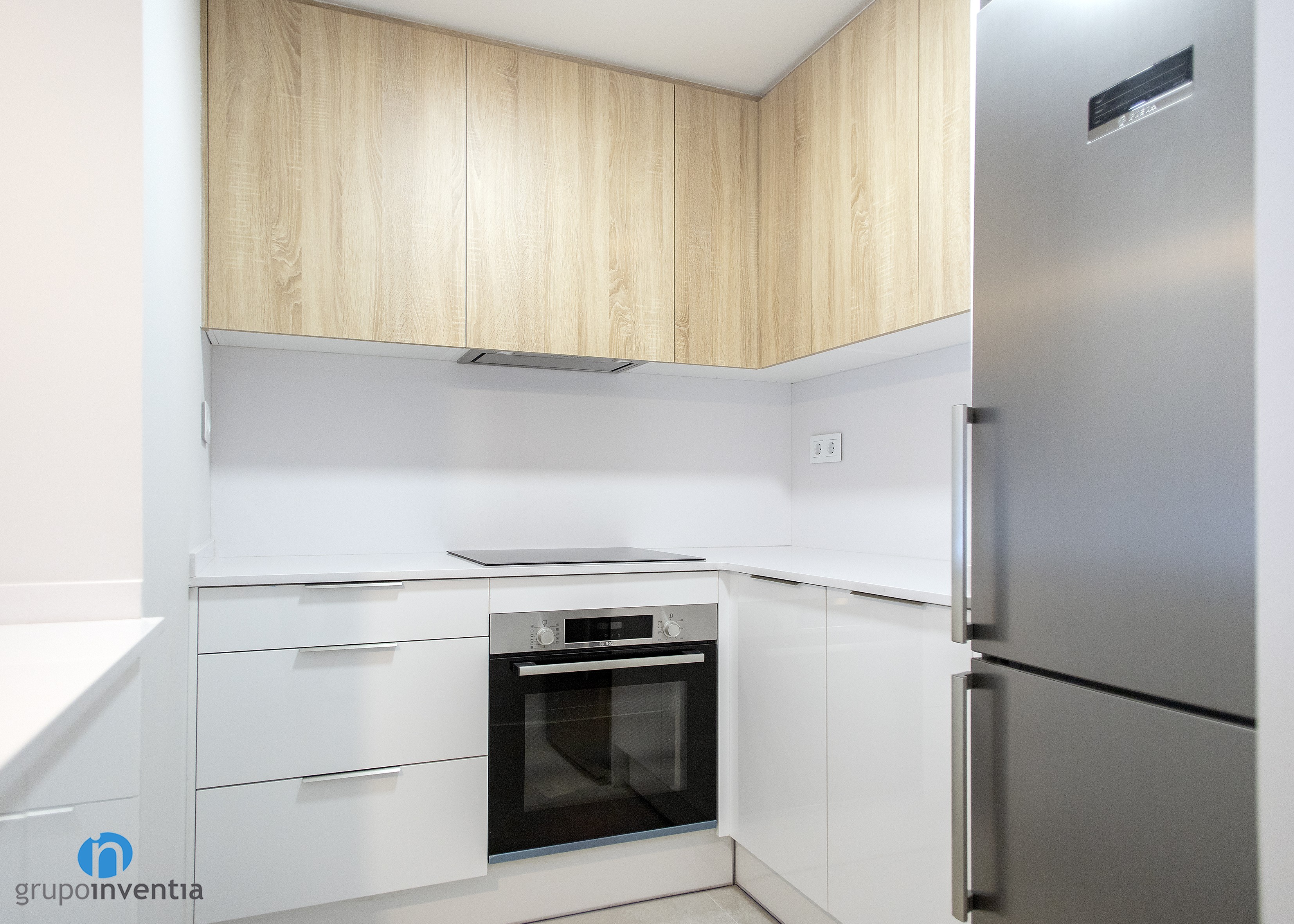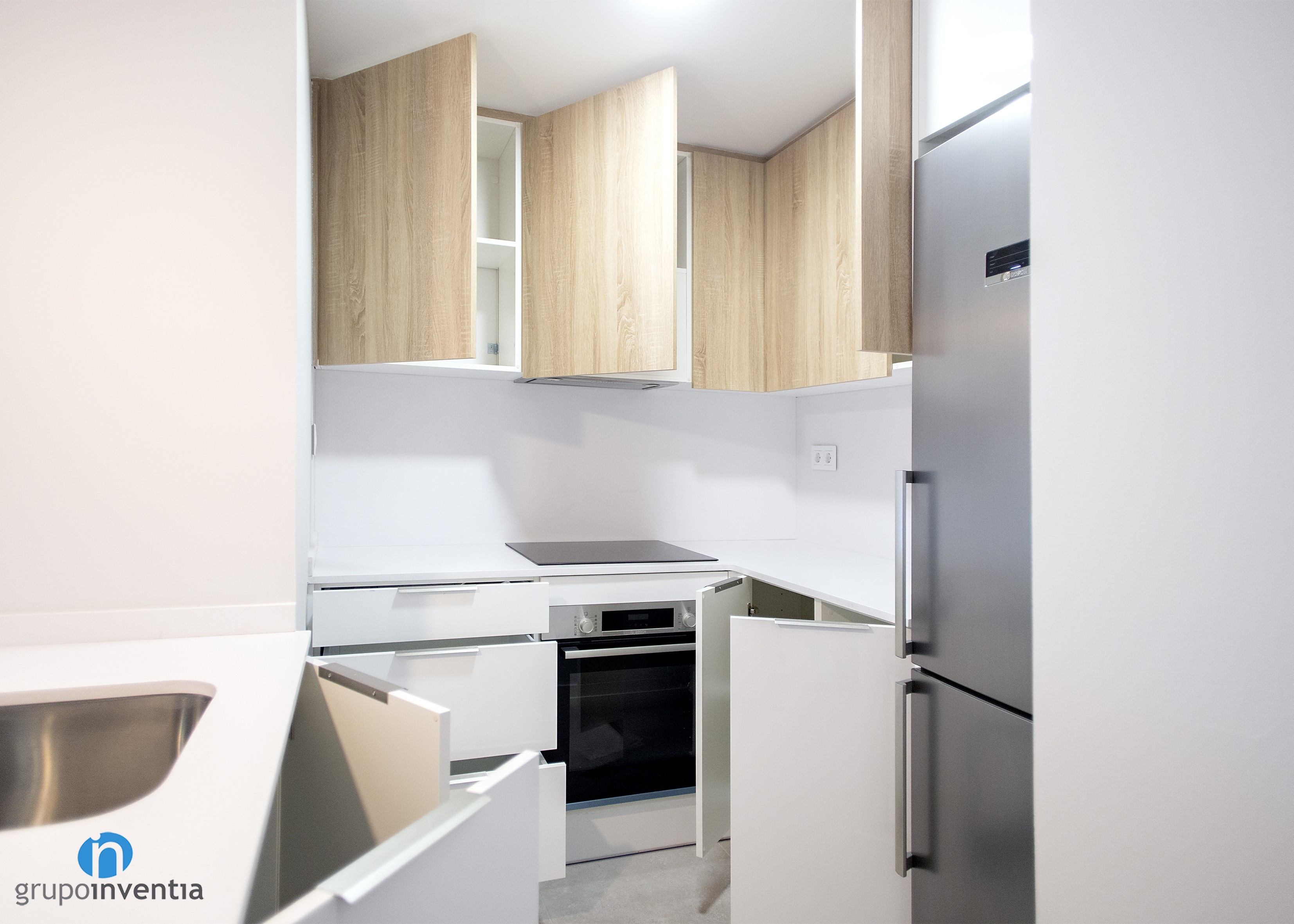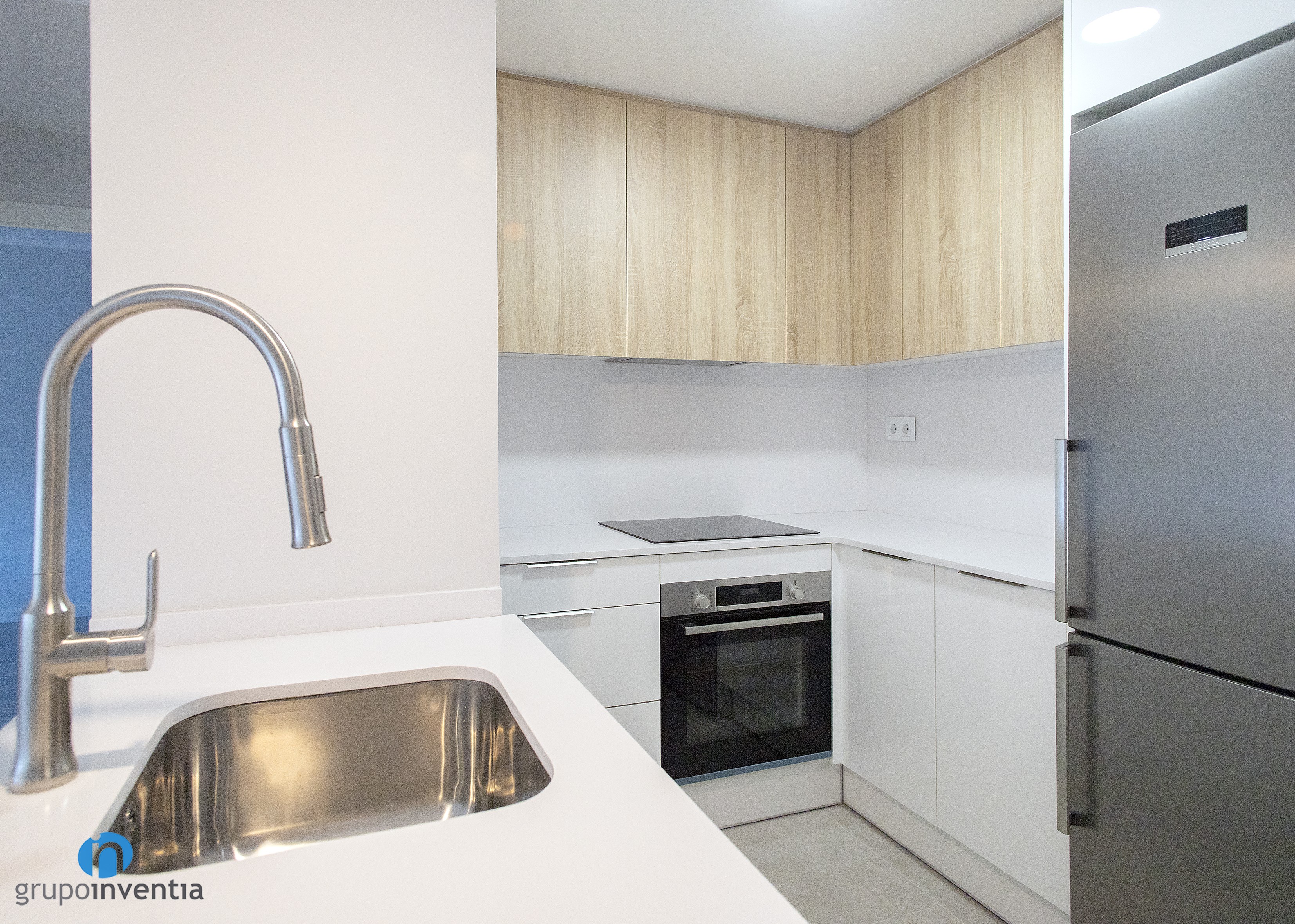 En la parte central de esta reforma de cocina se dispuso un tramo de encimera sobre el que se instaló una placa vitrocerámica y se encastró el horno justo debajo. En el lado derecho aparece una nueva encimera que aporta superficie de apoyo, mientras que en el extremo se dispuso un hueco a medida para encastrar la nevera. Con todo ello, la capacidad de almacenaje en la cocina también se amplió con creces.