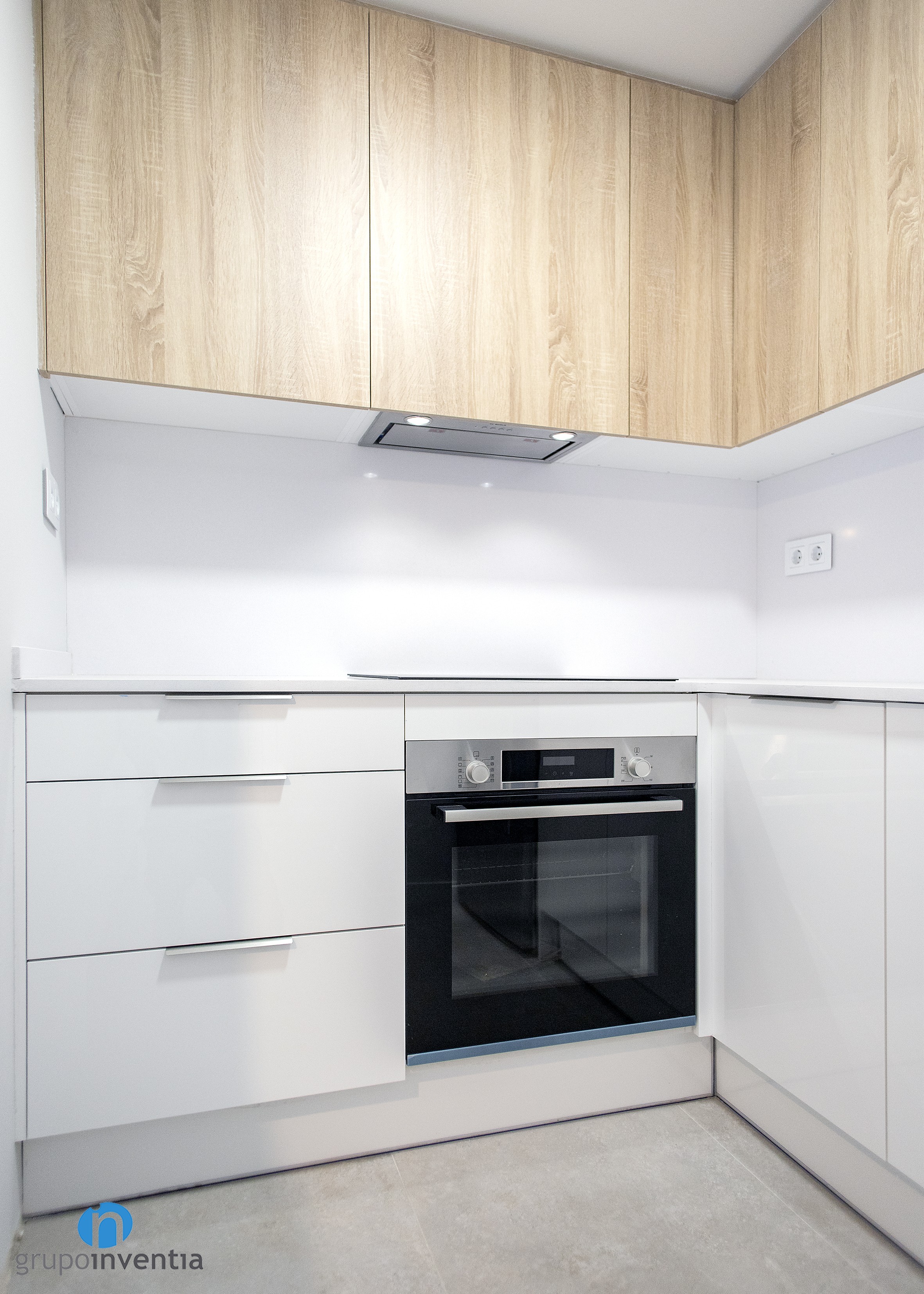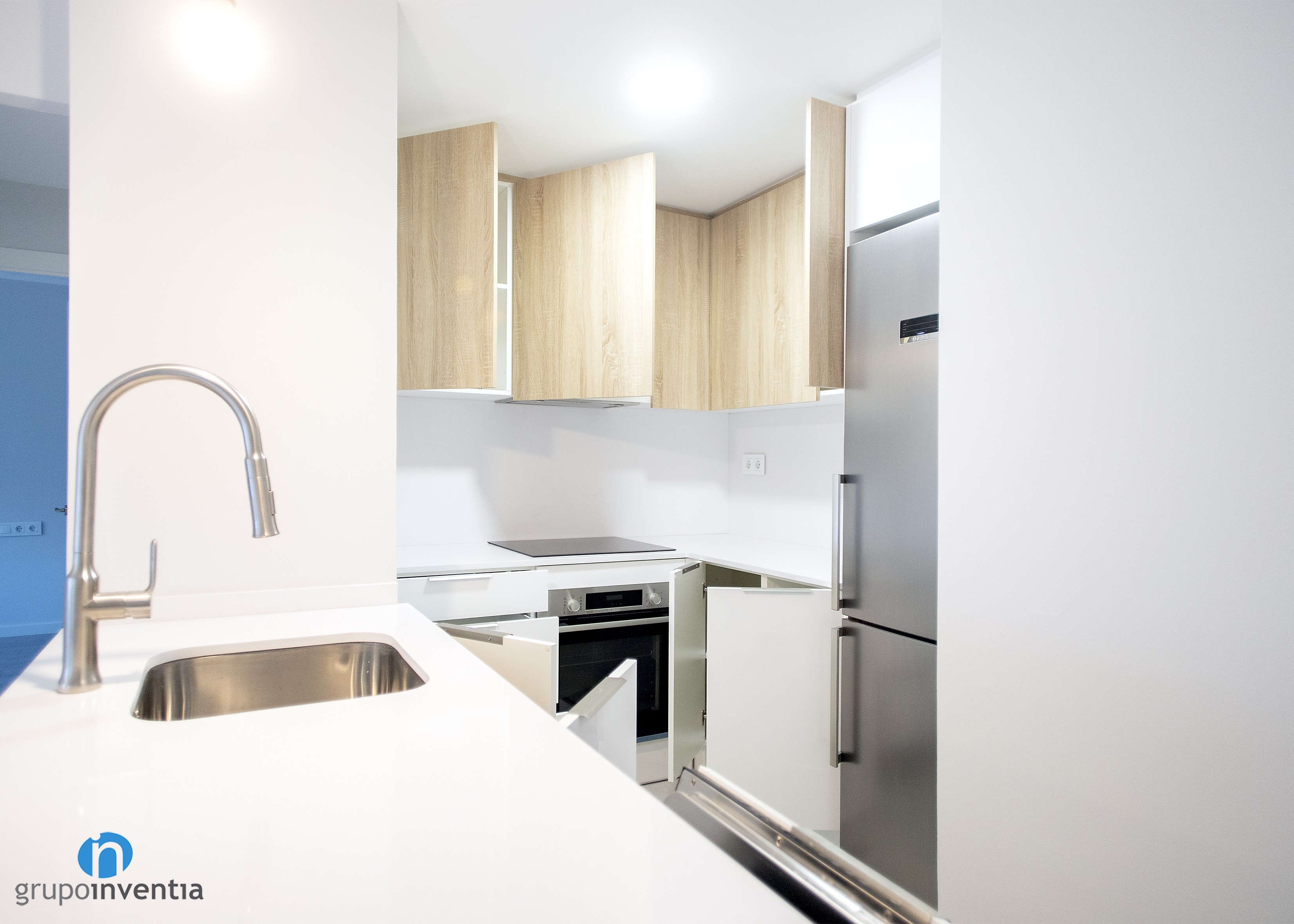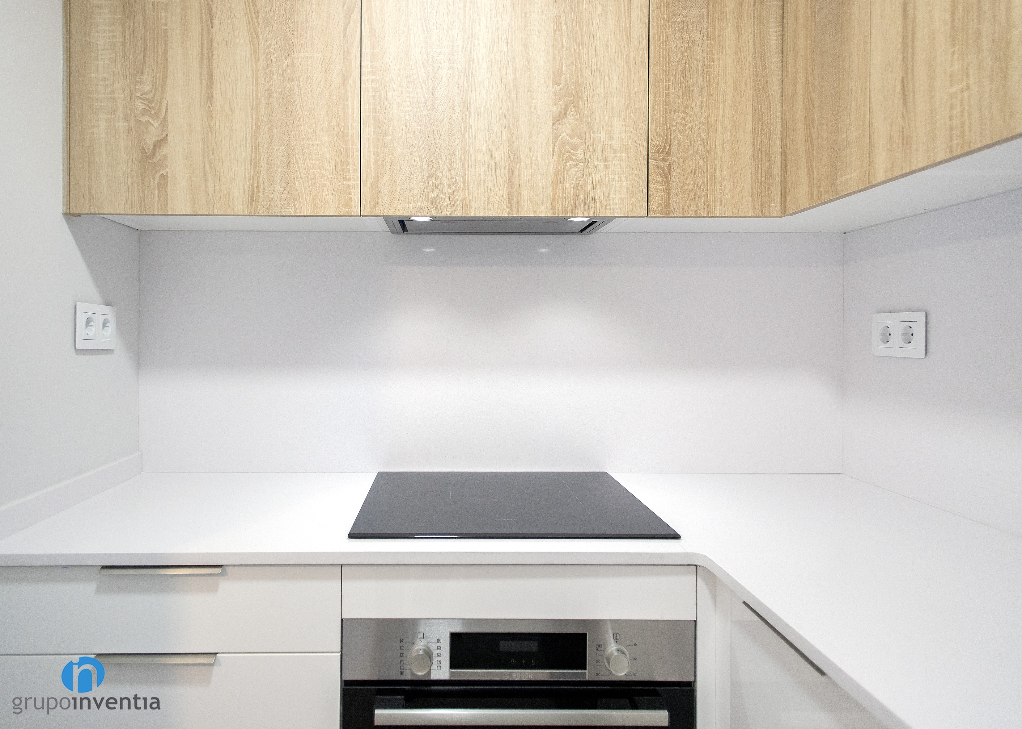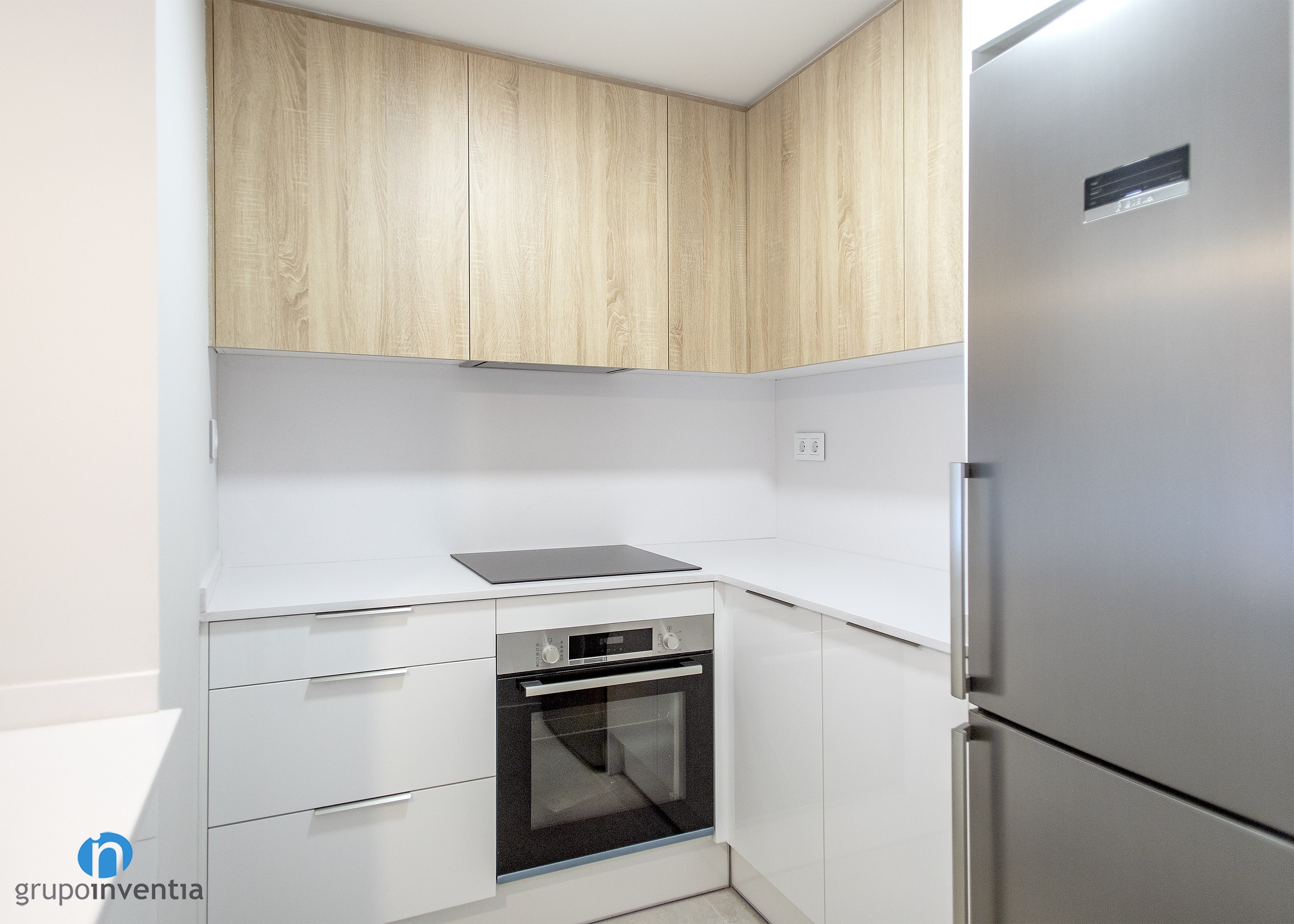 En la parte central de esta reforma de cocina se dispuso un tramo de encimera sobre el que se instaló una placa vitrocerámica y se encastró el horno justo debajo. En el lado derecho aparece una nueva encimera que aporta superficie de apoyo, mientras que en el extremo se dispuso un hueco a medida para encastrar la nevera. Con todo ello, la capacidad de almacenaje en la cocina también se amplió con creces.