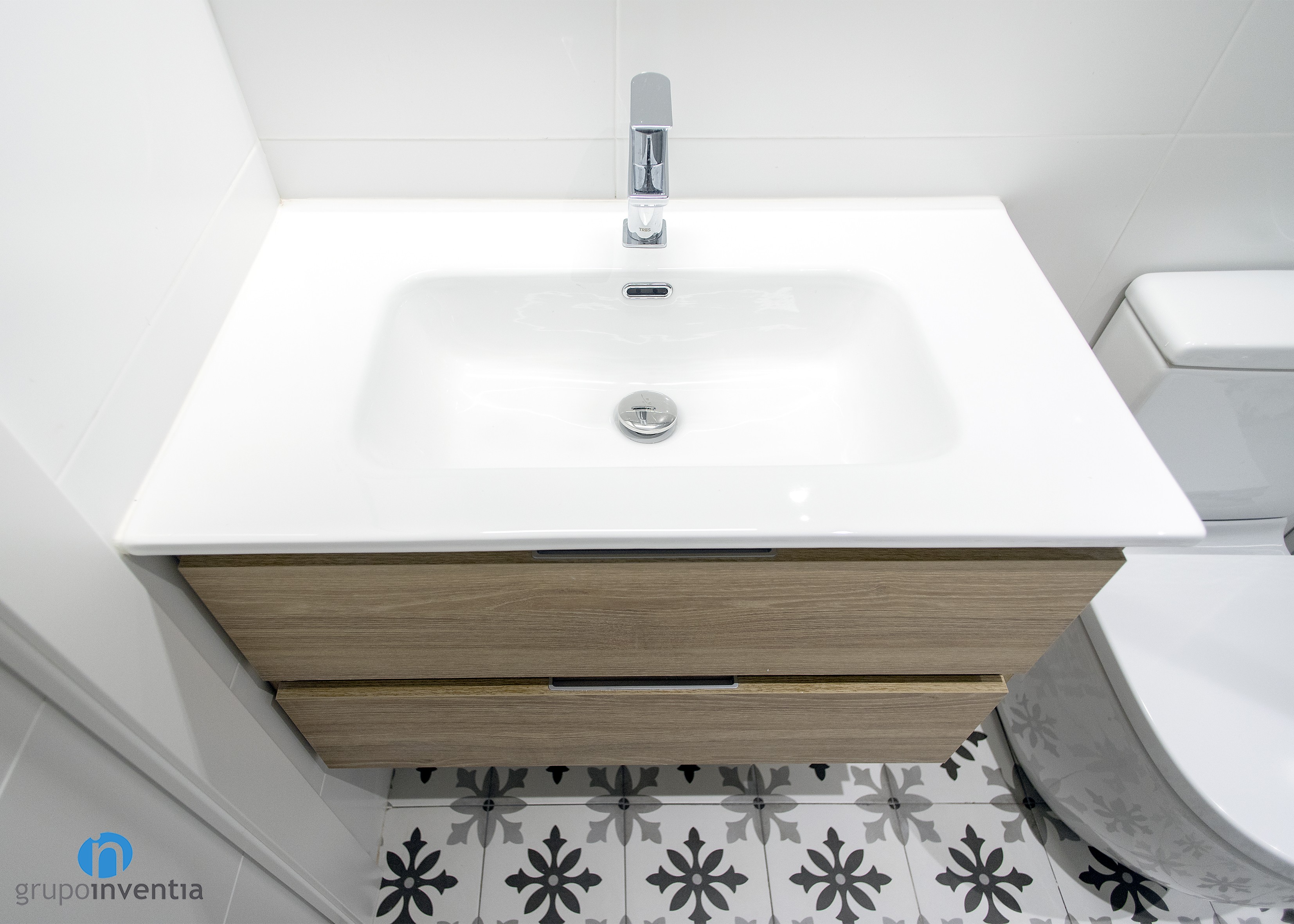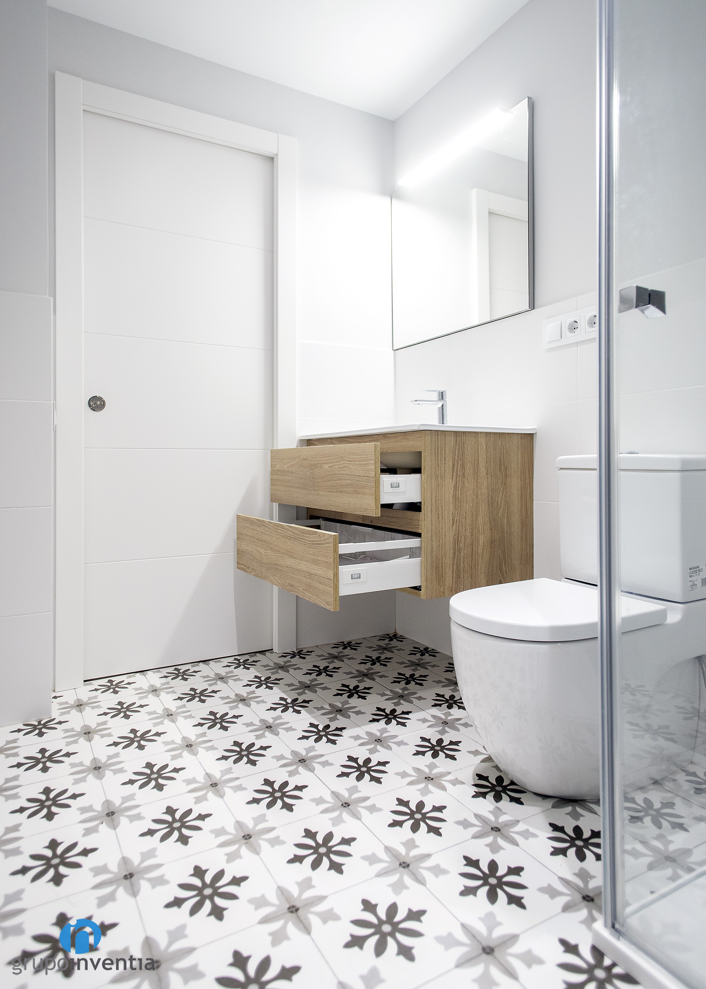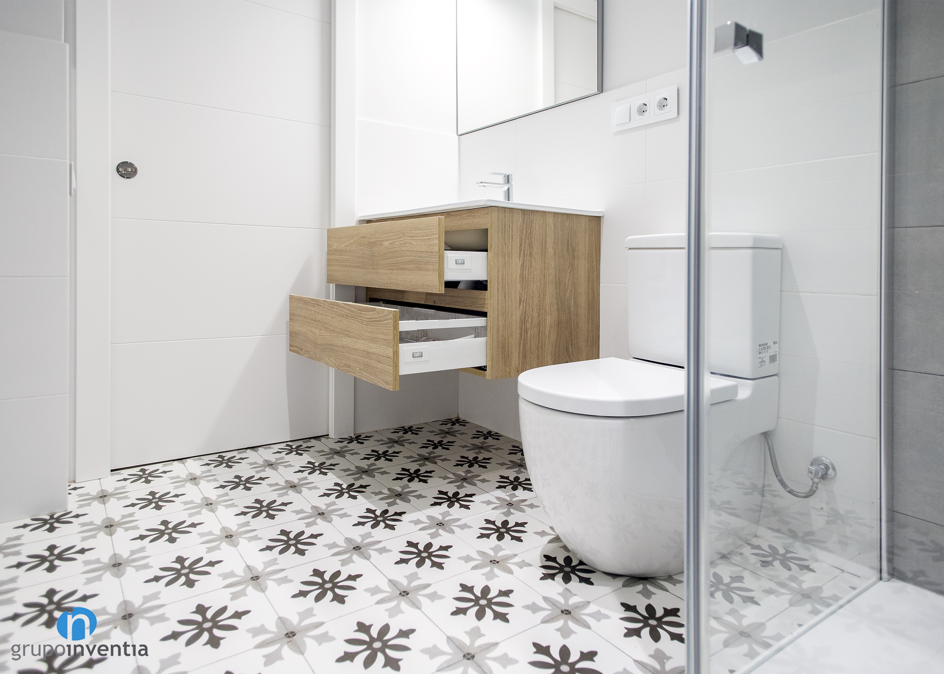 El cuarto de baño, al cual se accede a través de una puerta corredera, nos recibe con un excelente pavimento tipo hidráulico que deja claro que se trata de una estancia con mucha personalidad. A éste le acompaña un alicatado a media altura con azulejos blancos, mismo color con el que se pintó el resto de la pared. Gracias a estas tonalidades neutras, otros acabados también son bienvenidos en esta reforma de baño, como la madera que luce el mueble del lavabo.