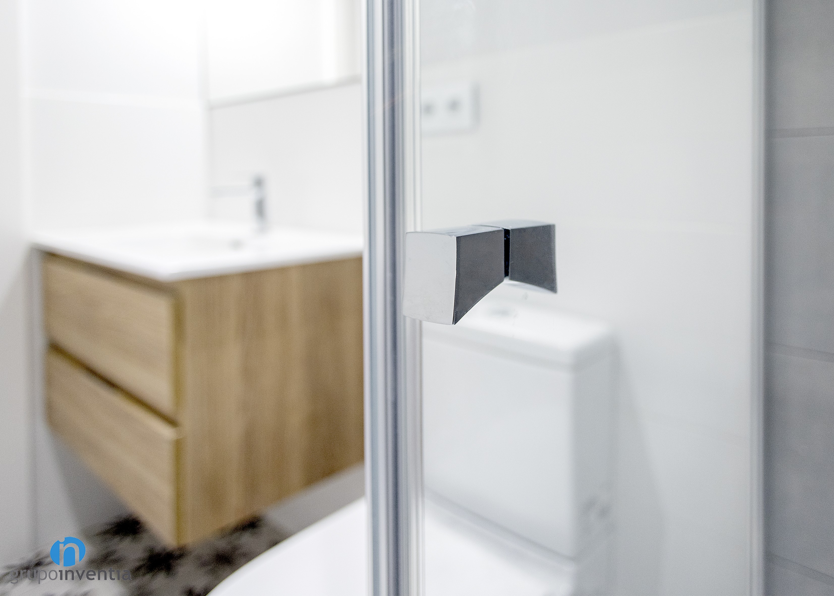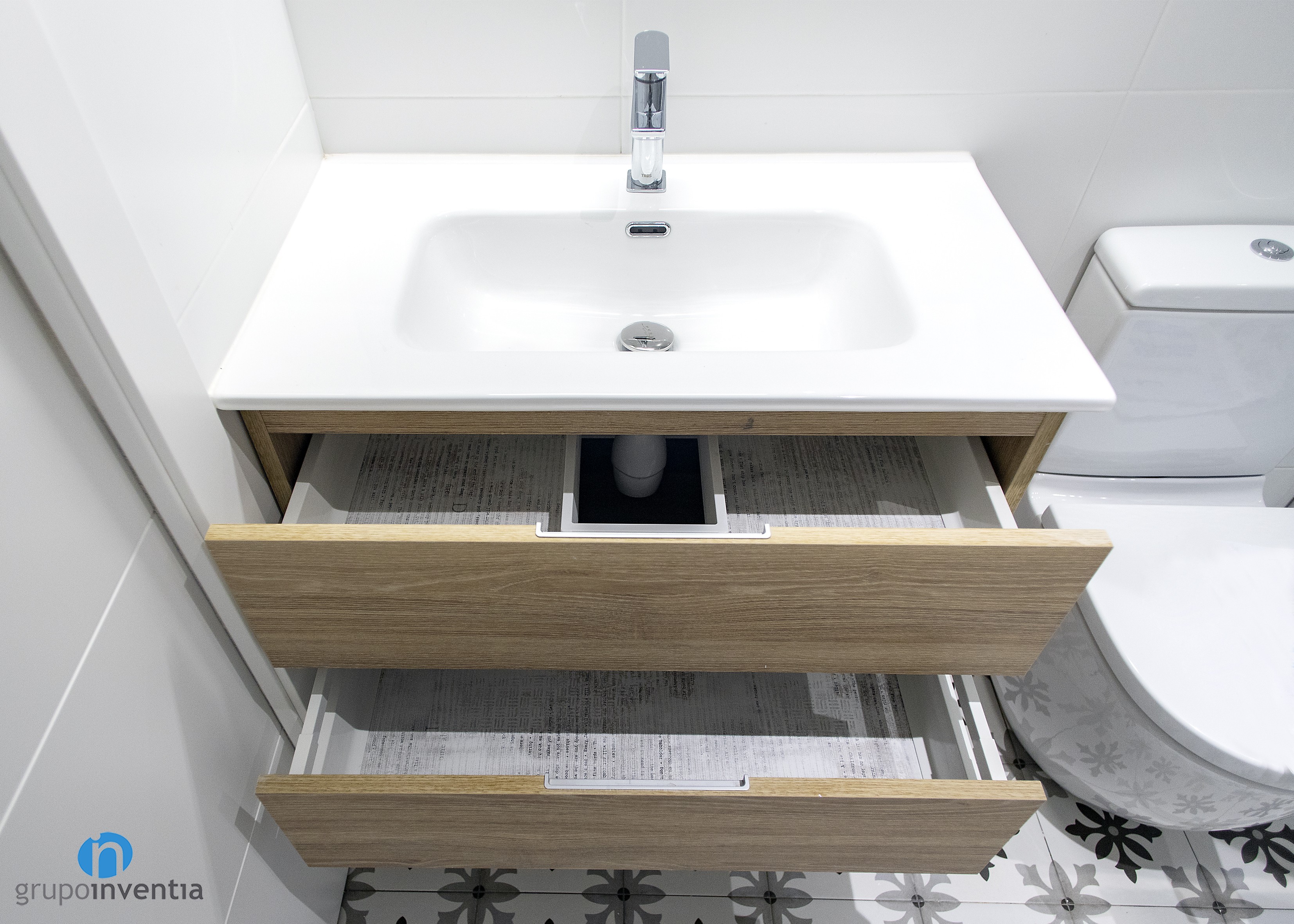 Si el diseño interior del cuarto de baño se renovó por completo, no podía ser menos el equipamiento sanitario. Ahora la estancia cuenta con elementos modernos que ofrecen las mejores prestaciones en su uso. Éste se compone del citado lavabo con mueble de almacenaje en su parte inferior, un inodoro y una práctica ducha protegida con mamparas de puertas correderas.