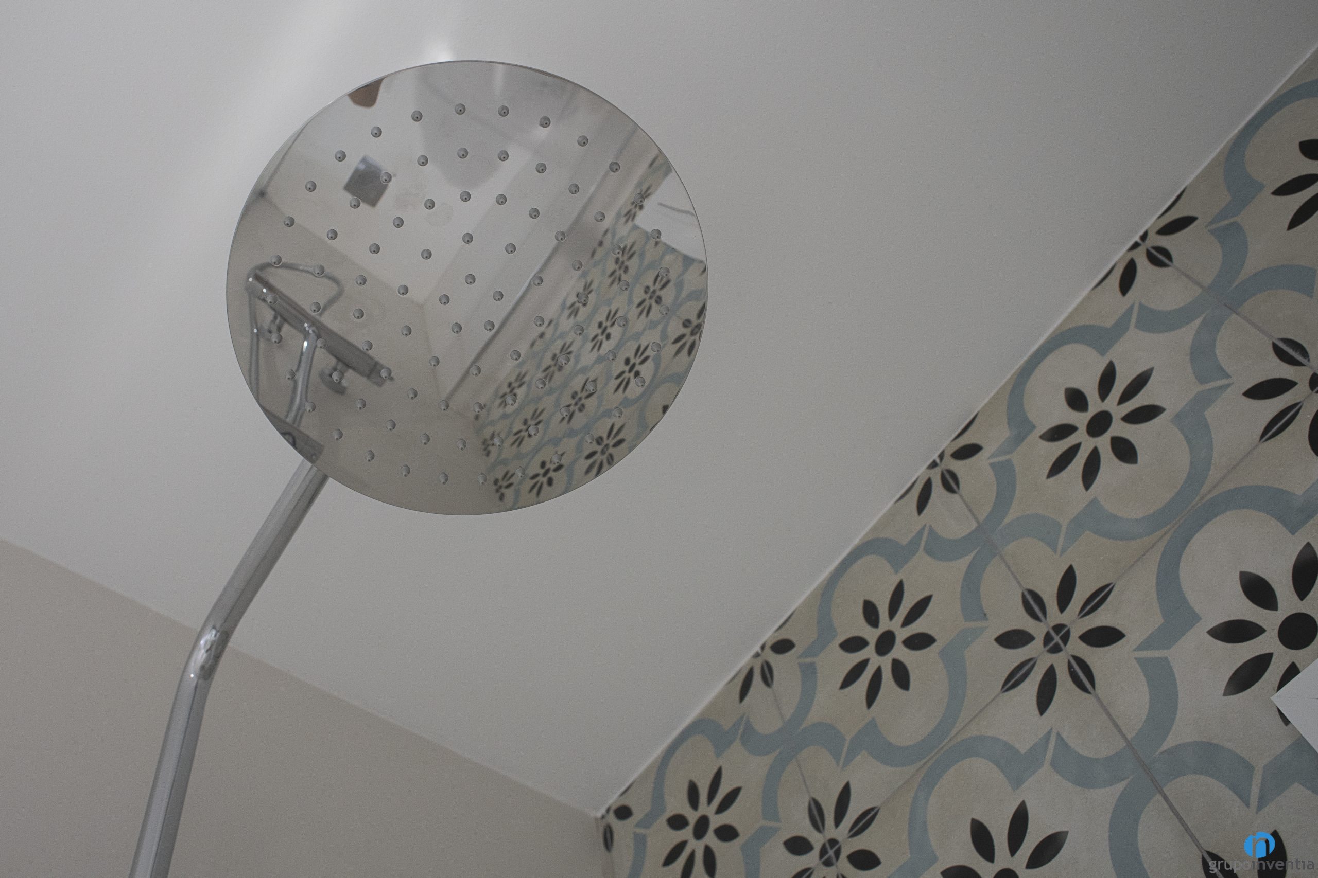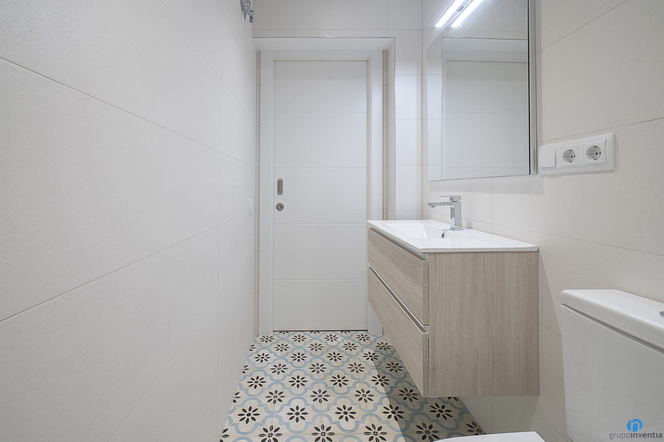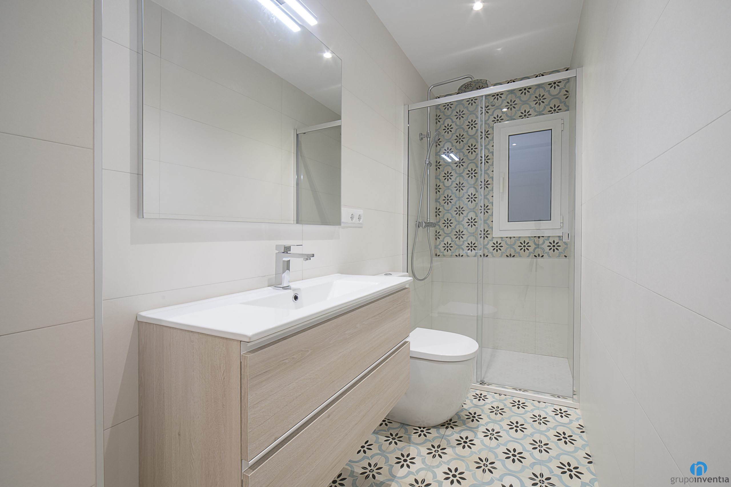 La reforma de baño sigue la línea decorativa general. En este caso las paredes las hemos alicatado por completo con azulejos de color blanco. De este modo hemos conseguido un baño muy luminoso y de ambiente fresco. Para la pared de la ducha y el suelo se han usado baldosas con un acabado tipo hidráulico. Se trata de un dibujo que aporta personalidad a la nueva imagen del cuarto de baño.