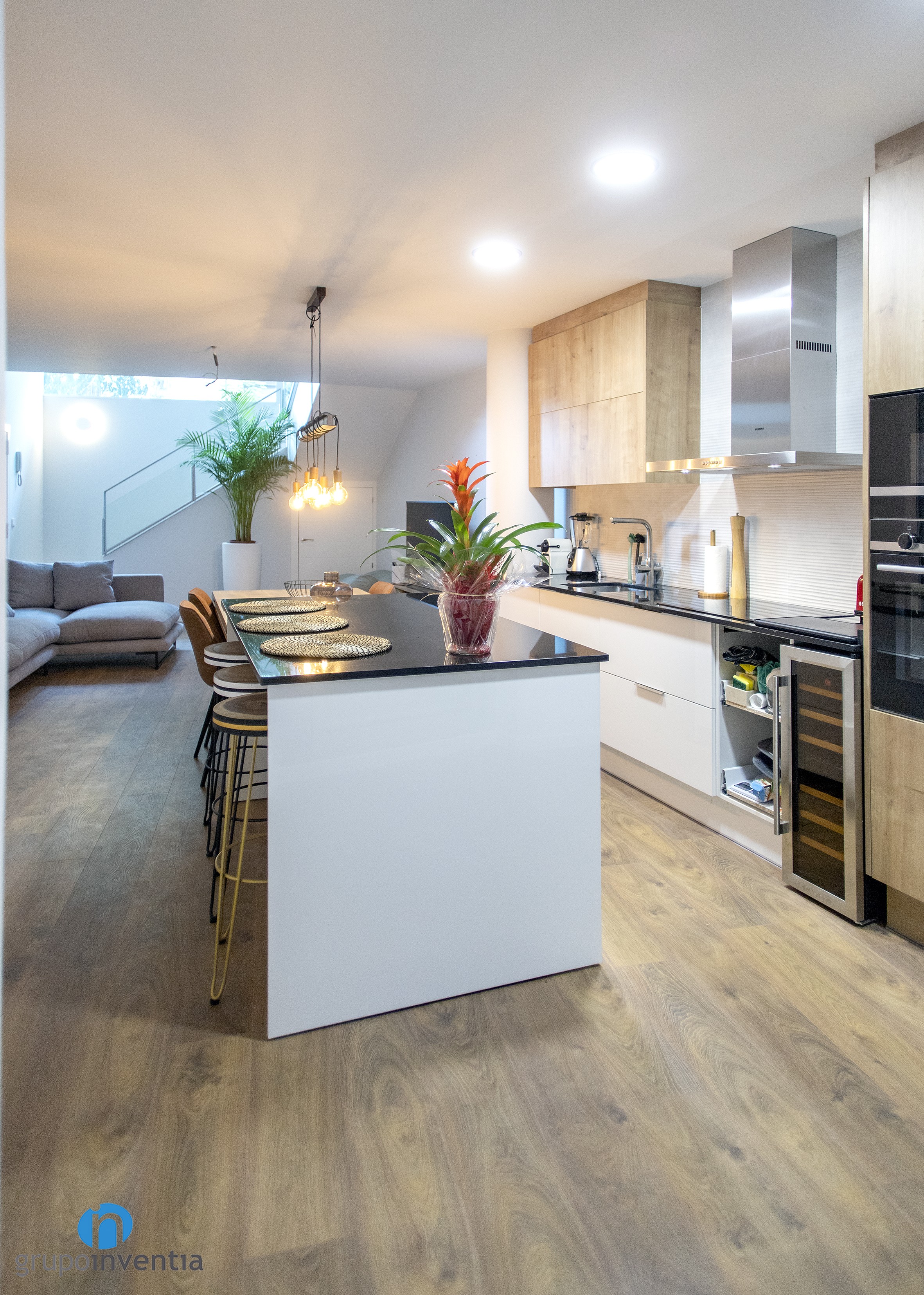 Se trata de una cocina abierta y distribuida a dos frentes. En ella se consiguió generar un espacio tan funcional como acogedor, combinando un equipamiento de cocina moderno y manteniendo el estilo contemporáneo que se imprimió en toda la vivienda. El lado abierto lo componen una barra de desayuno, que a su vez ofrece superficie de apoyo, y una mesa con capacidad para varios comensales.