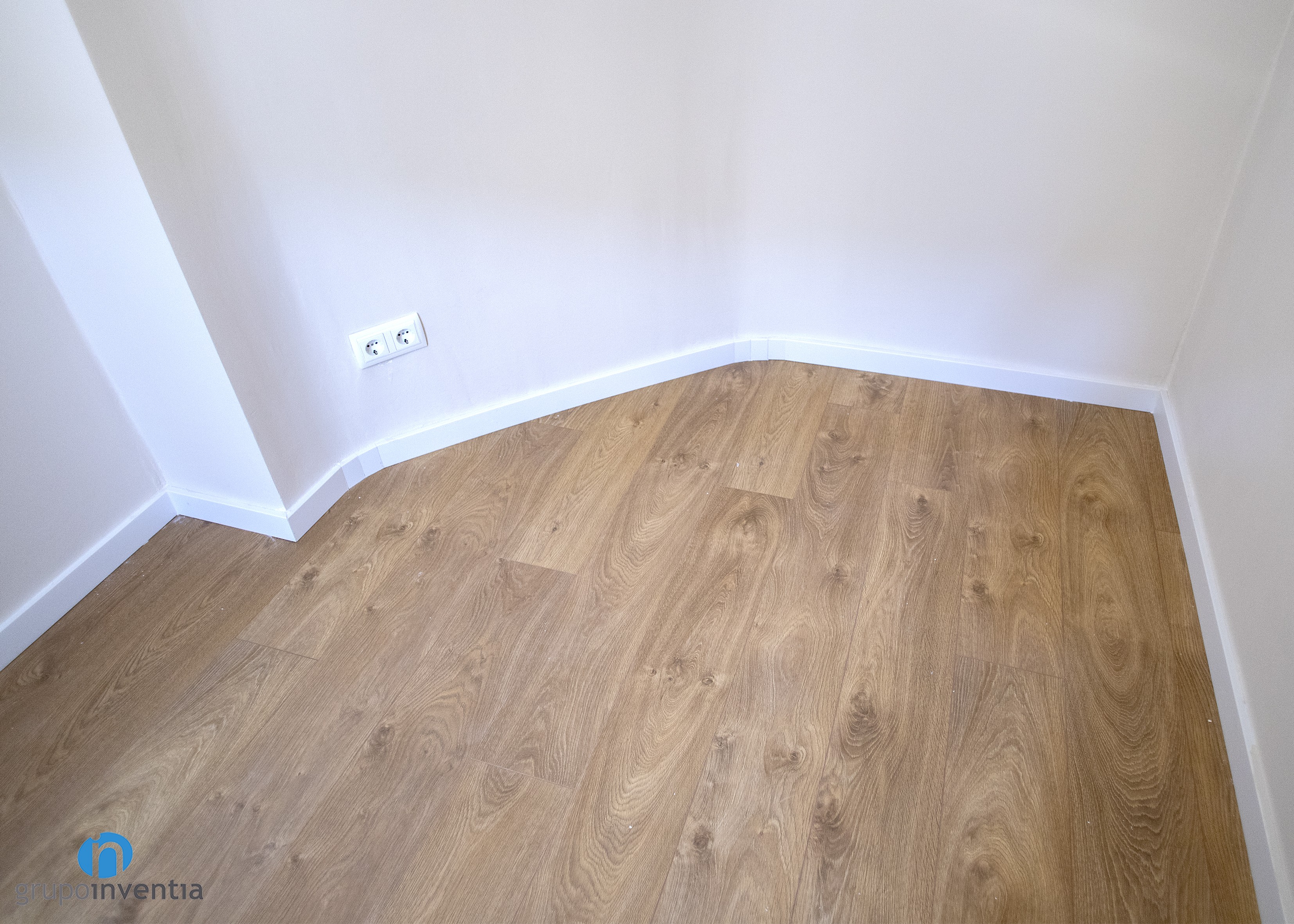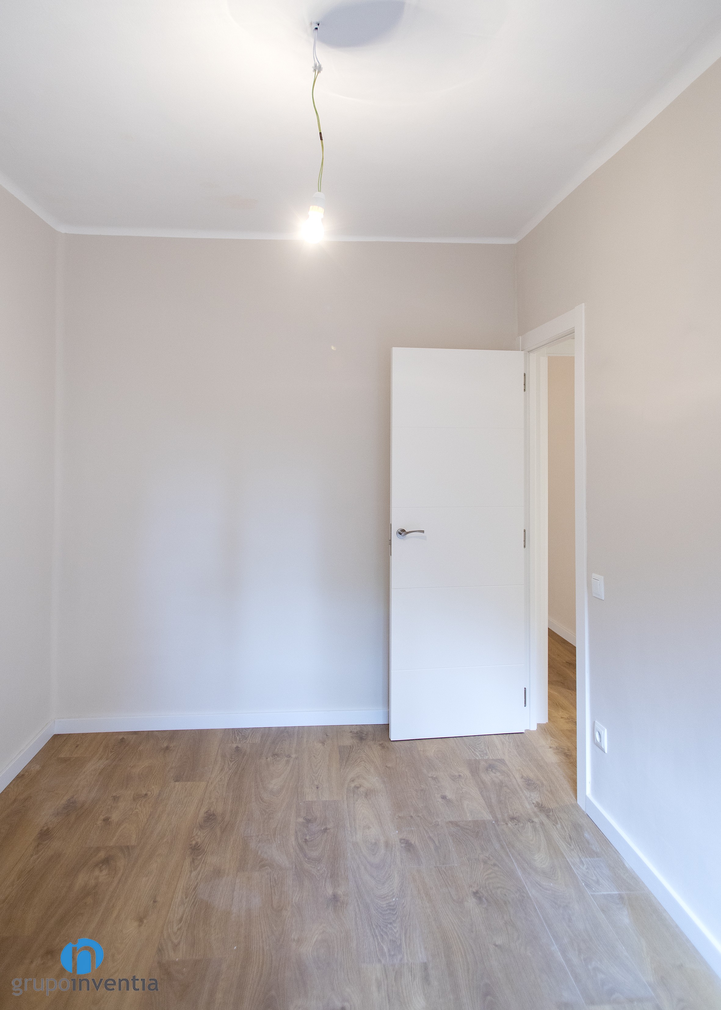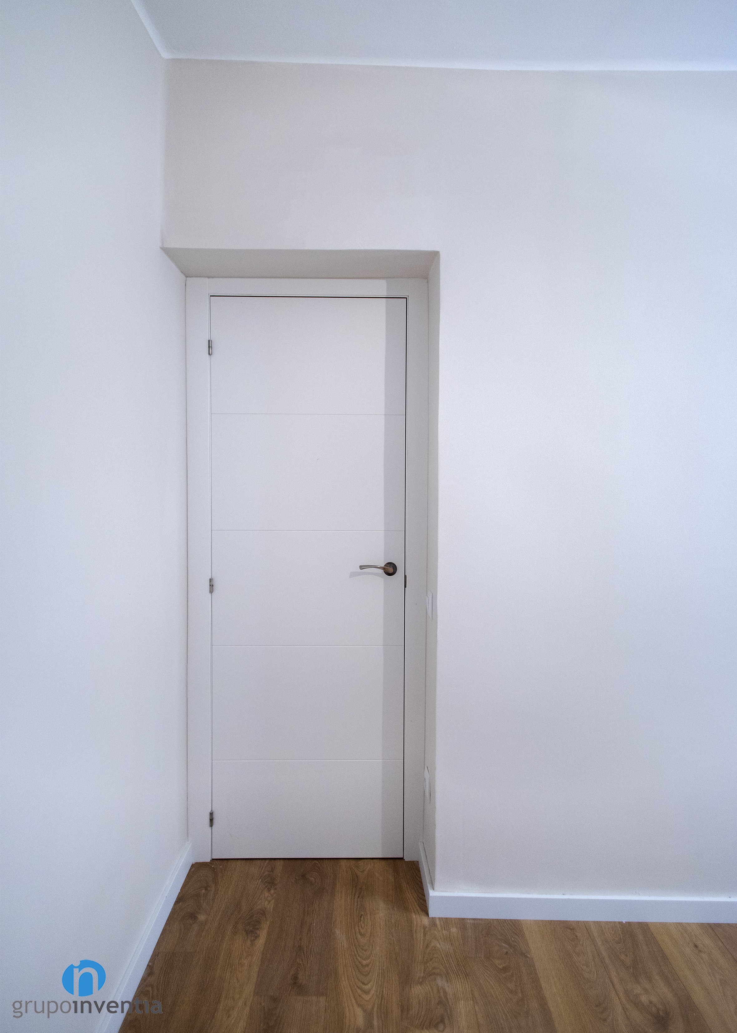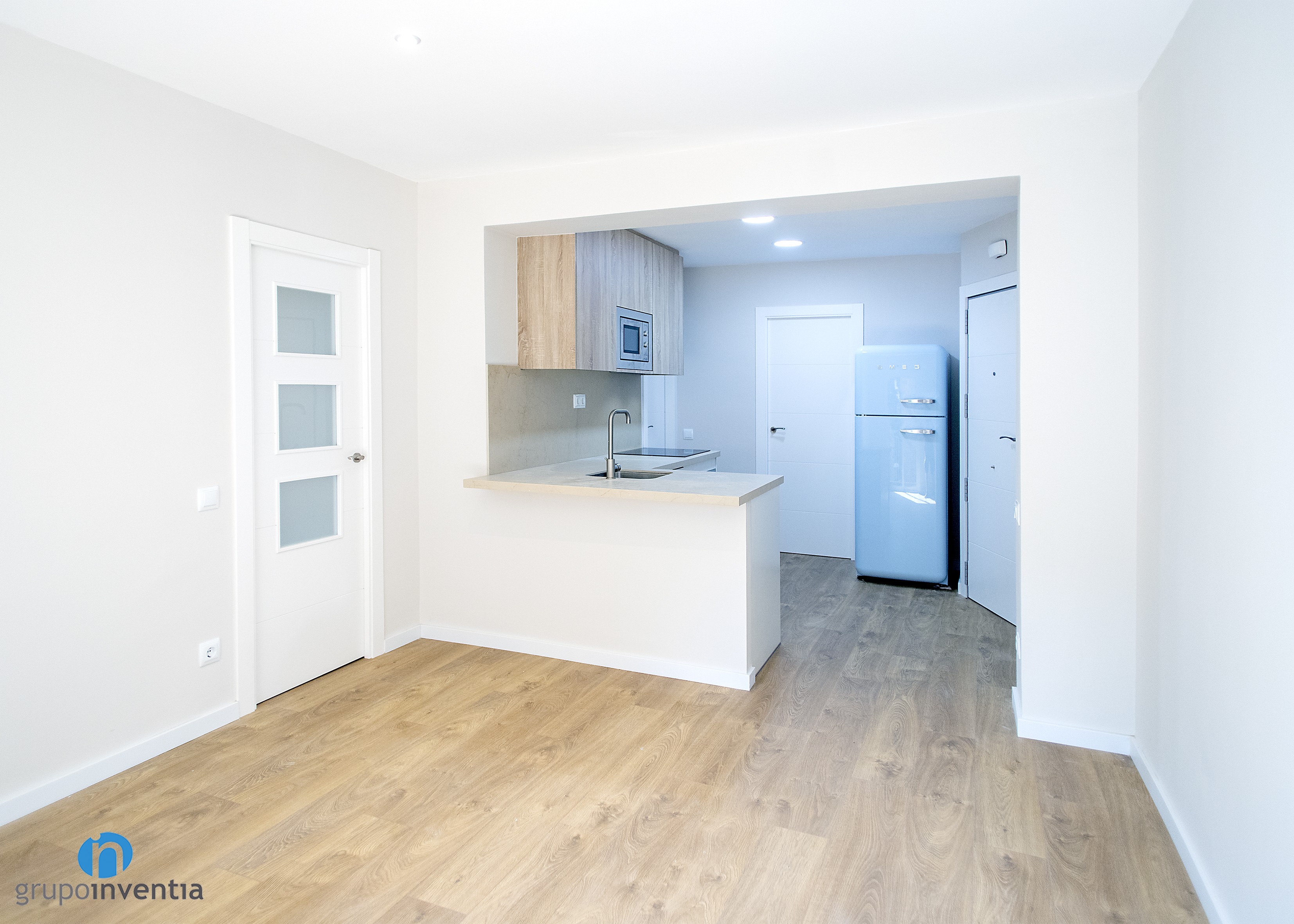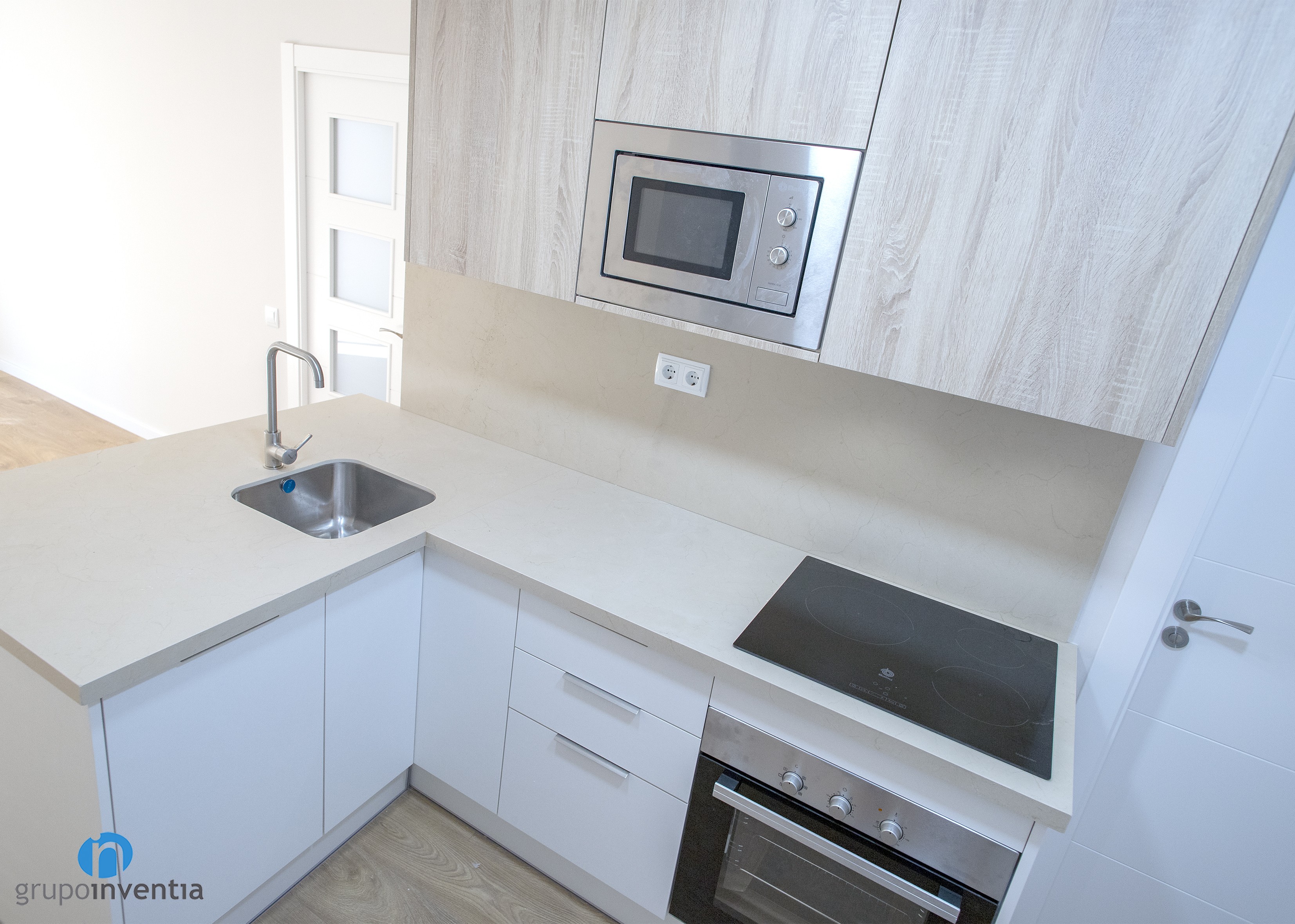 Esta segunda zona dispone de capacidad de almacenaje tanto en su parte inferior como superior, donde se encastraron el horno y el microondas respectivamente, mientras que la nevera se ubica al fondo de la estancia. Visualmente esta reforma de cocina mantiene el diseño del resto del piso, utilizando tonalidades neutras como el beige y los acabados en madera.