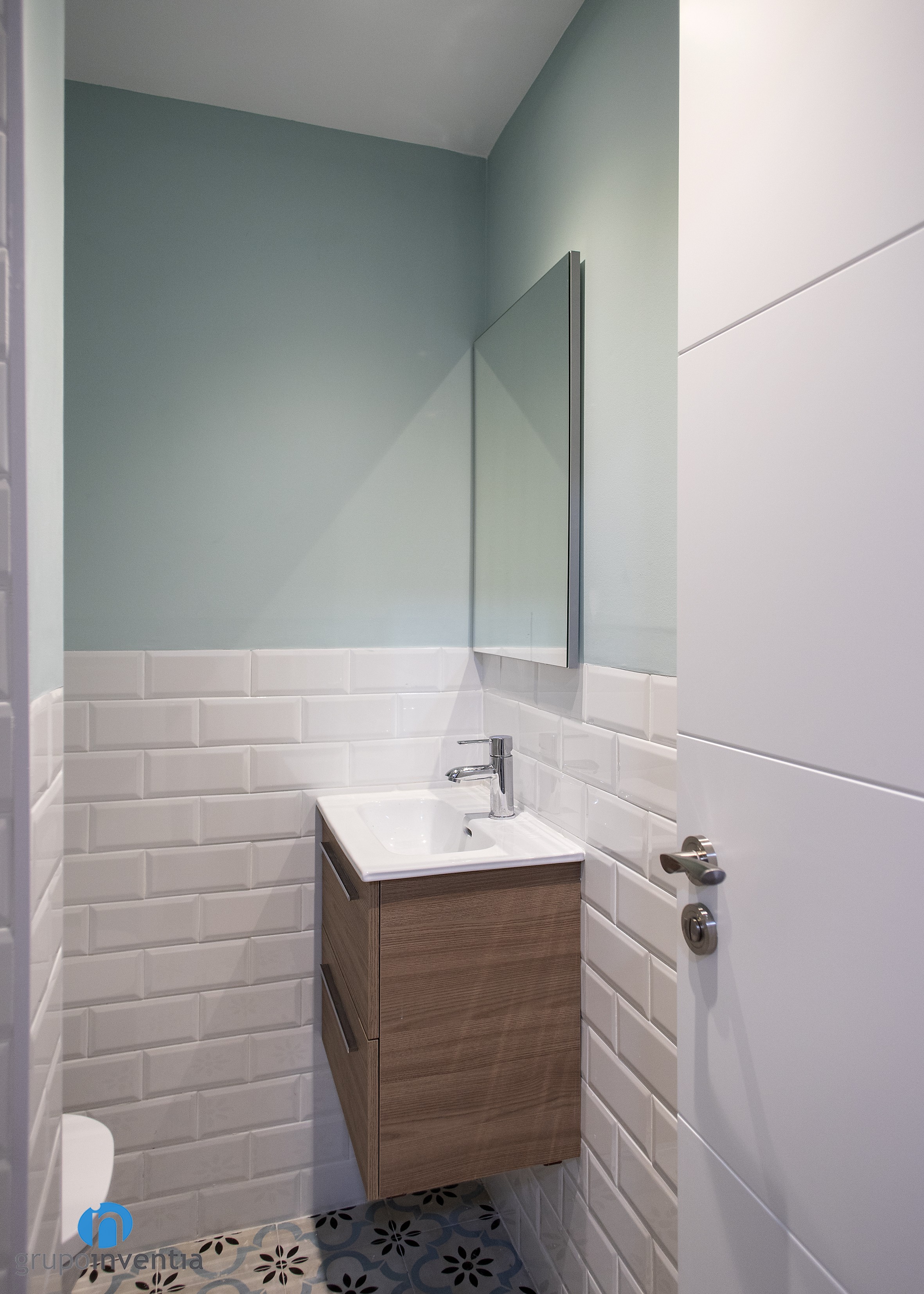 En lo que respecta al diseño interior de los baños, las paredes se alicataron a media altura con azulejos tipo metro de color blanco. Para pintar el resto de pared hasta llegar al techo se utilizaron tonos neutros a juego con el pavimento hidráulico colocado. Éste último elemento le aporta mucha personalidad a los cuartos de baño.